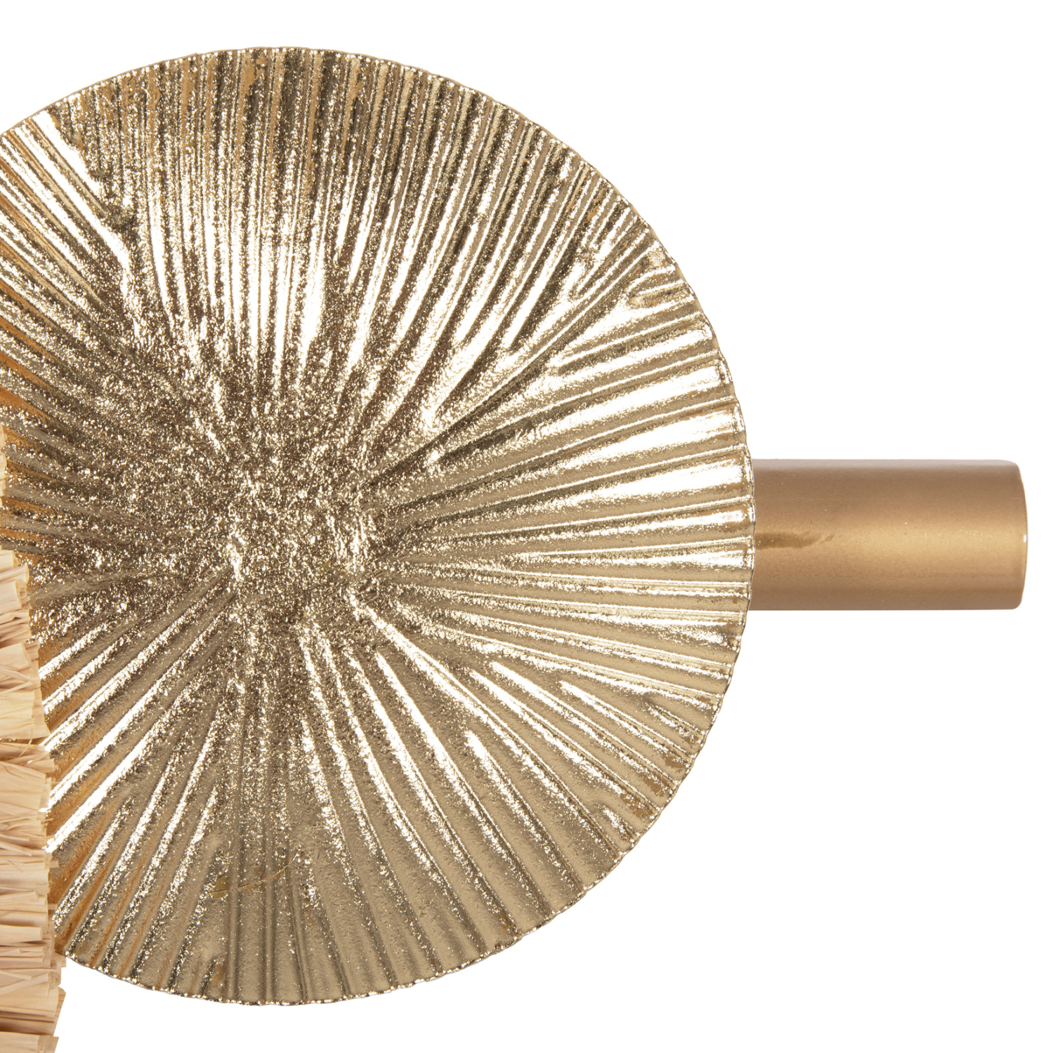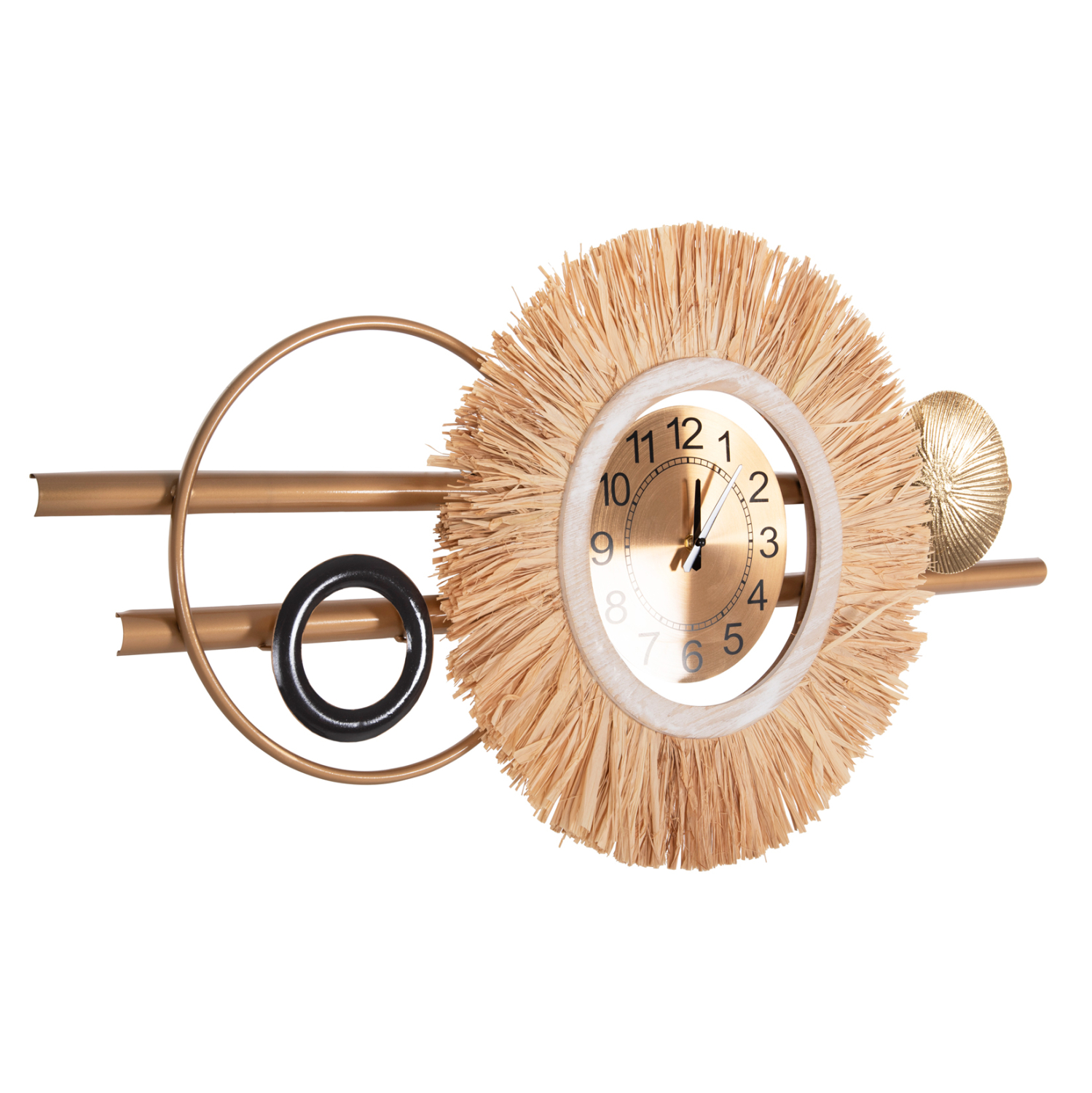 Μια όμορφη και απαραίτητη αισθητική αλλά και χρηστική προσθήκη για κάθε δωμάτιο του σπιτιού ή της επιχείρησής σας. Ένα ρολόι τοίχου είναι μια κλασική διακοσμητική ιδέα που ποτέ δεν θα παλιώσει. Αυτό το ρολόι είναι μέρος ενός διακοσμητικού συνόλου από μέταλλο σε ΓΗΙΝΑ χρώματα με στρογγυλό πλαίσιο ρολογιού από αποξηραμένες ίνες raffia. Η ίνα raffia λαμβάνεται με το ξεφλούδισμα των φύλλων φοίνικα ραφίας. Οι φοίνικες Raffia είναι ένα γένος περίπου είκοσι ειδών φοινίκων που προέρχονται από τροπικές περιοχές της Αφρικής, και ιδιαίτερα της Μαδαγασκάρης, με ένα είδος να εμφανίζεται επίσης στην Κεντρική και Νότια Αμερική. Η ίνα ραφίας είναι μαλακή, εύκαμπτη, ισχυρή και ανθεκτική.
