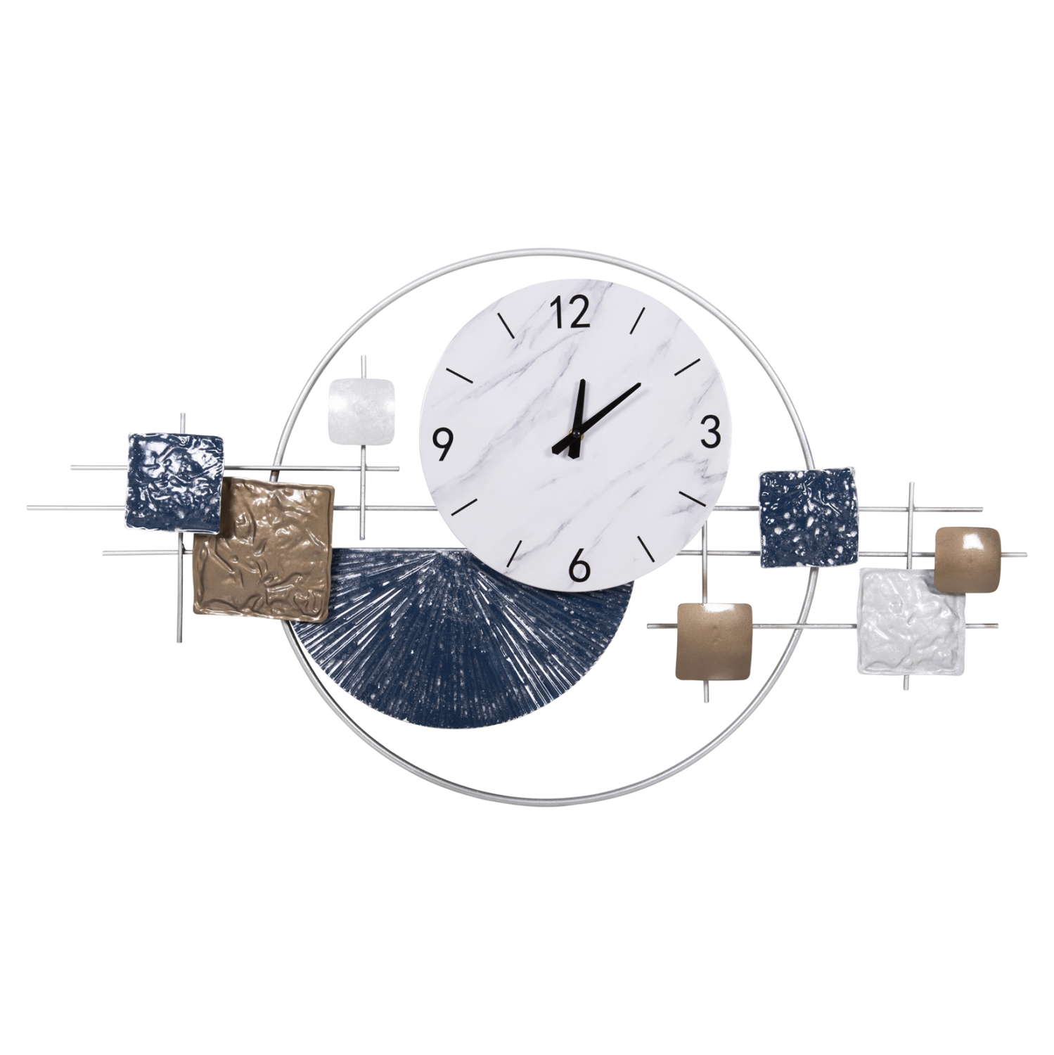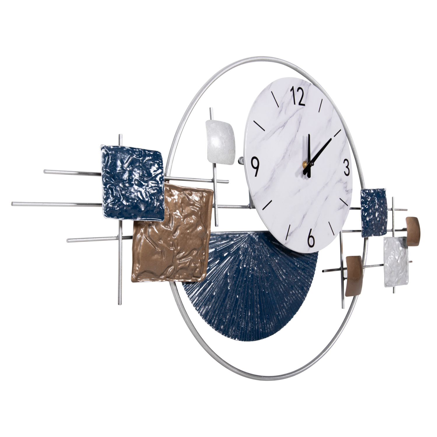 Μια όμορφη και απαραίτητη αισθητική αλλά και χρηστική προσθήκη για κάθε δωμάτιο του σπιτιού ή της επιχείρησής σας. Ένα ρολόι τοίχου είναι μια κλασική διακοσμητική ιδέα που ποτέ δεν θα παλιώσει. Το HΜ4209 μεταλλικό διακοσμητικό ρολόι σε ΛΕΥΚΟ χρώμα με μαύρους δείκτες και αριθμούς και με διάφορα σχήματα σε ΜΠΛΕ και ΚΑΦΕ χρώμα, αποτελεί μια σικάτη και ελκυστική πρόταση για οποιονδήποτε χώρο, που θα εντυπωσιάσει.