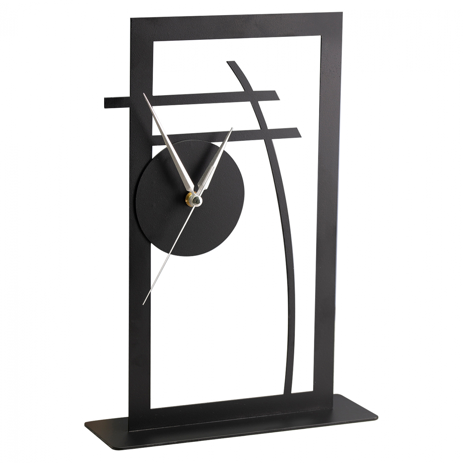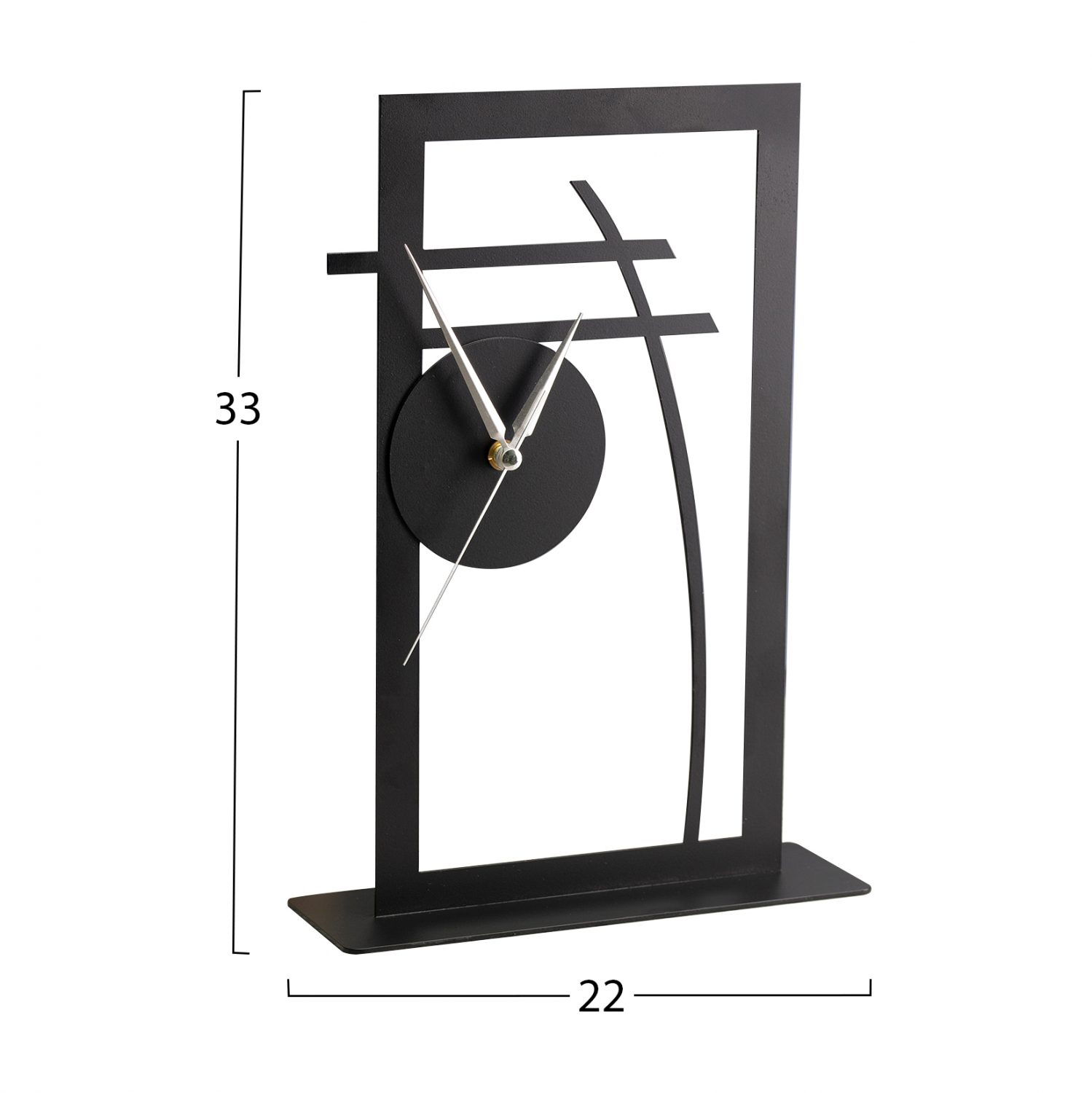 Ρολόι επιτραπέζιο σε μαύρη απόχρωση με ασημί λεπτομέρειες στους δείκτες.