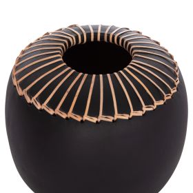 Το χειροποίητο επιτραπέζιο διακοσμητικό βάζο LENNOX είναι ένα όμορφο διακοσμητικό στοιχείο για κάθε χώρο. Είναι σχετικά κοντό αλλά φαρδύ και κατασκευασμένο εξολοκλήρου από τερακότα σε ΜΑΥΡΟ χρώμα ενώ το στόμιο είναι διακοσμημένο με μια πλέξη από φυσικό rattan. Ιδανικό για πληθώρα χρήσεων και χώρων.