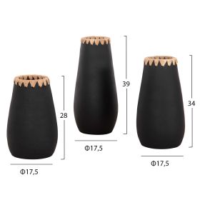 Αυτό το σετ 3 διακοσμητικών βάζων είναι σε ΜΑΥΡΗ απόχρωση και τα βάζα διαθέτουν πλέξη ψάθας στο στόμιό τους. Μπορούν να ταιριάξουν οπουδήποτε το θελήσετε. Είτε στο σπίτι είτε σε επαγγελματικούς χώρους.