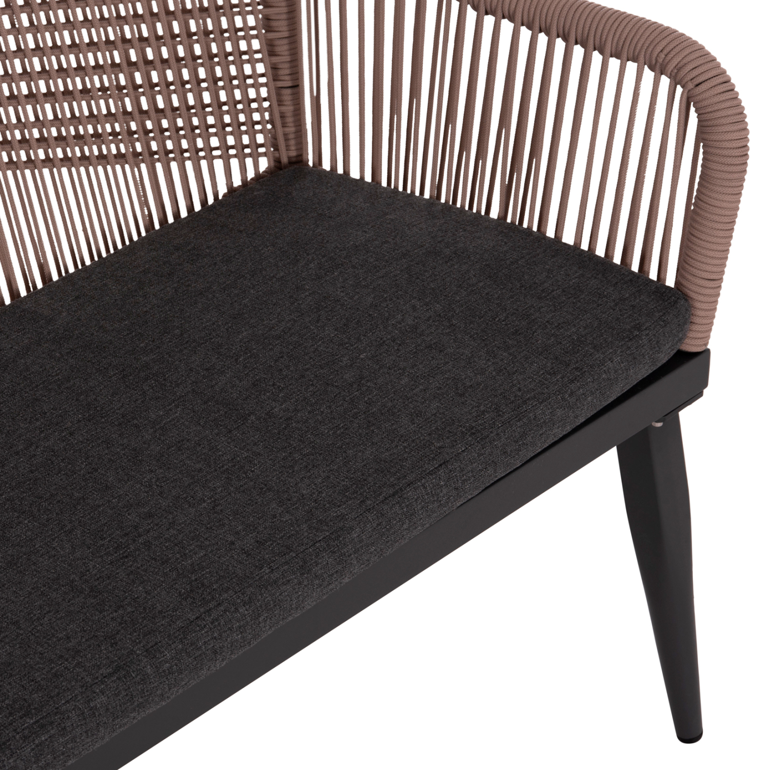 Ο 2-θέσιος καναπές εξωτερικού χώρου MYRTIA είναι εξαιρετικός και συνδυάζει τον σκελετό αλουμινίου σε ΑΝΘΡΑΚΙ χρώμα με το ΜΠΕΖ Teslin σχοινί που διατρέχει πλεγμένο όλο τον καναπέ. Το μαξιλάρι καθίσματος είναι επενδυμένο με πολυεστερικό ύφασμα σε ΑΝΘΡΑΚΙ χρώμα. Χαρακτηριστικό γνώρισμα αυτού του καναπέ είναι ότι τα πόδια είναι ψηλά, με αποτέλεσμα και το ύψος του καθίσματος να είναι ψηλό.
