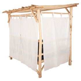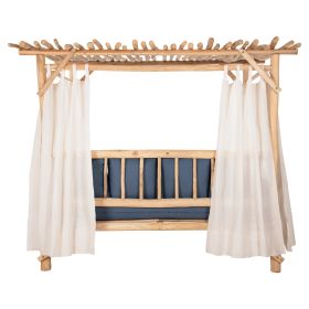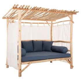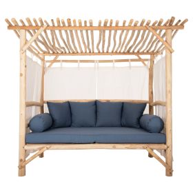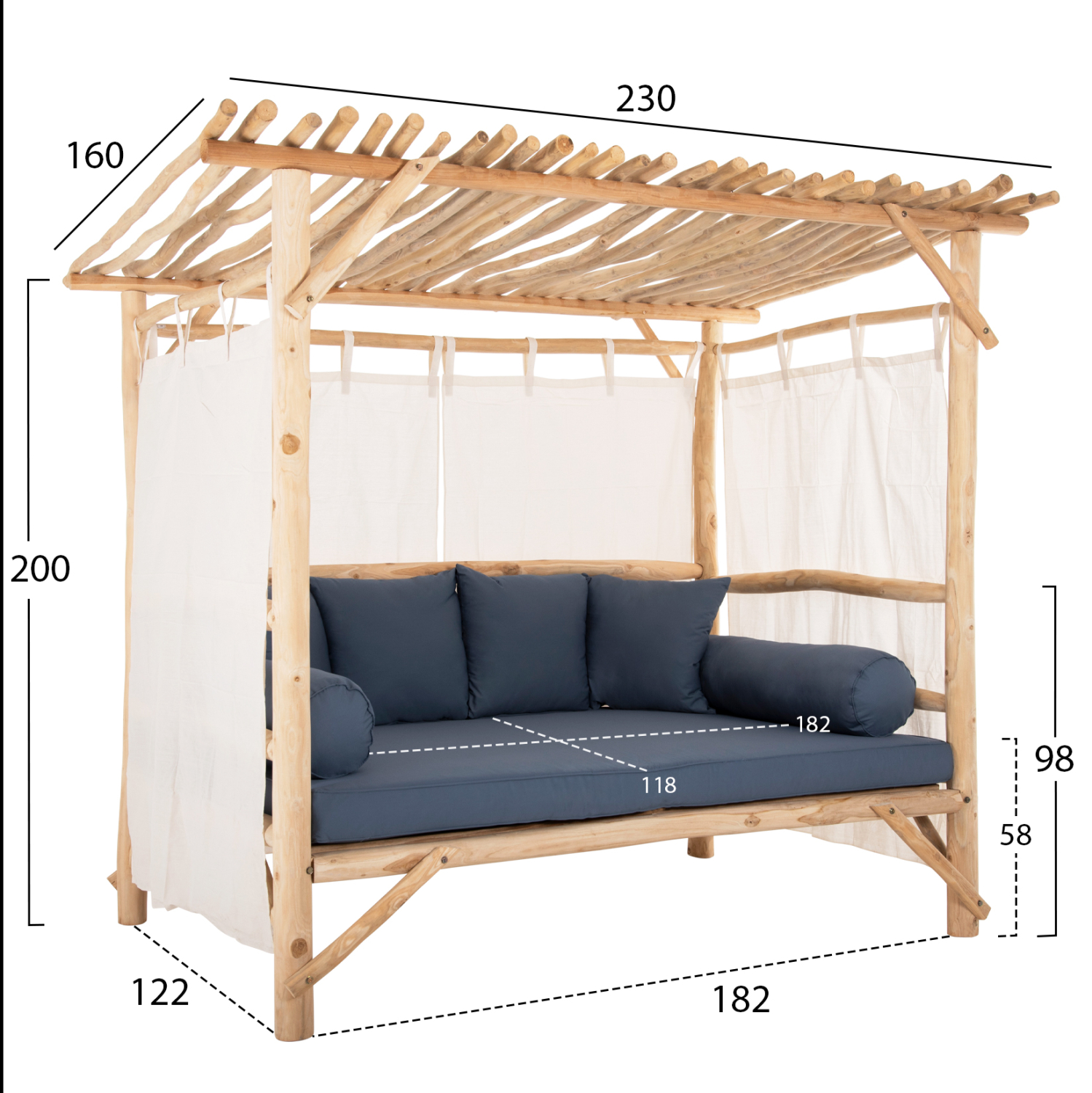 Ο ALKIOR είναι ένας ξύλινος καναπές-κρεβάτι εξωτερικού χώρου που θα μαγνητίσει τα βλέμματα. Η ρουστίκ αύρα αυτού του κρεβατοκαναπέ είναι εμφανής και «διαχέεται» στον χώρο χωρίς καν να το…προσπαθήσει! Είναι εξολοκλήρου κατασκευασμένος από κλαδιά του ξύλου TEAK χωρίς επεξεργασία και διαθέτει ψηλό σκίαστρο επίσης από κλαδιά TEAK. Το στρώμα καθίσματος, όσο και τα μαξιλάρια πλάτης και μπράτσων είναι από μαλακό πολυεστερικό ύφασμα σε ΜΠΛΕ χρώμα, ενώ διαθέτουν και φερμουάρ για να αφαιρούνται τα καλύμματα. Η ιδιαίτερη «πινελιά» του καναπέ είναι ότι διαθέτει και ΛΕΥΚΕΣ λινές κουρτίνες, που αναρτώνται στον σκελετό και προσφέρουν προστασία από τον ήλιο. Είναι τόσο υπέροχα πρακτικός που μπορείτε να περάσετε όλη την ημέρα σε αυτόν.