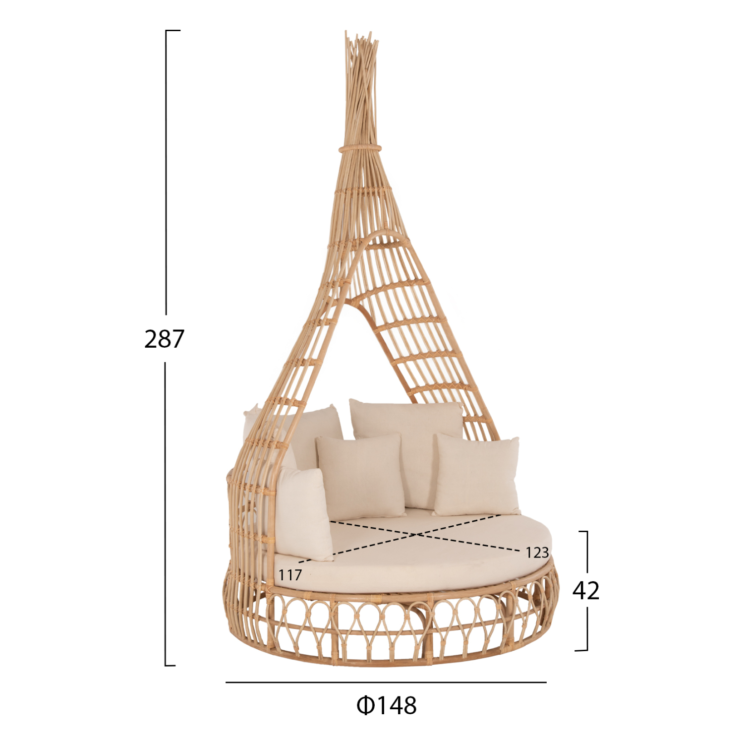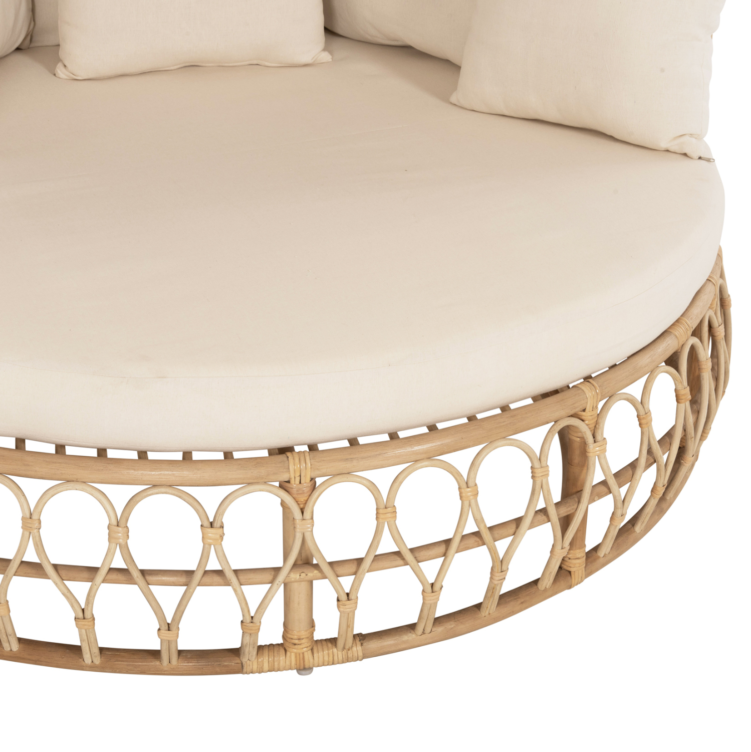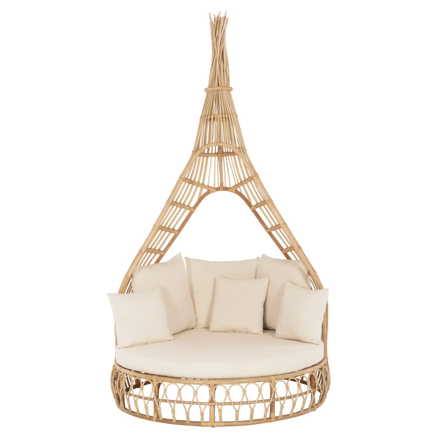 Ο υπέροχος καναπές MARJOM είναι η νέα προσθήκη στην γκάμα μας. Μια πολυτελής πρόταση σε στρογγυλό σχήμα με ψηλό «ουρανό» που θυμίζει καμπάνα. Το Rattan που είναι το υλικό κατασκευής, είναι υπέροχα δουλεμένο και δίνει αμέσως μια όμορφη εικόνα στον χώρο. Διαθέτει στρογγυλό μαξιλάρι καθίσματος (στρώμα) και 6 συνοδευτικά μαξιλάρια με ύφασμα σε ΕΚΡΟΥ χρώμα.