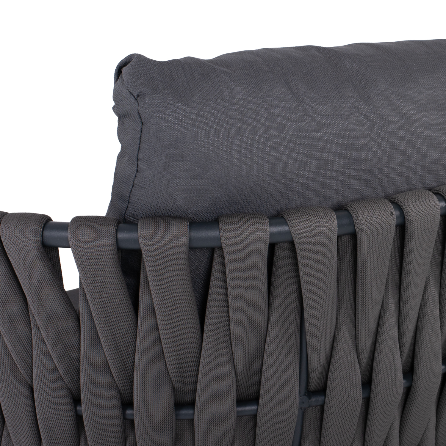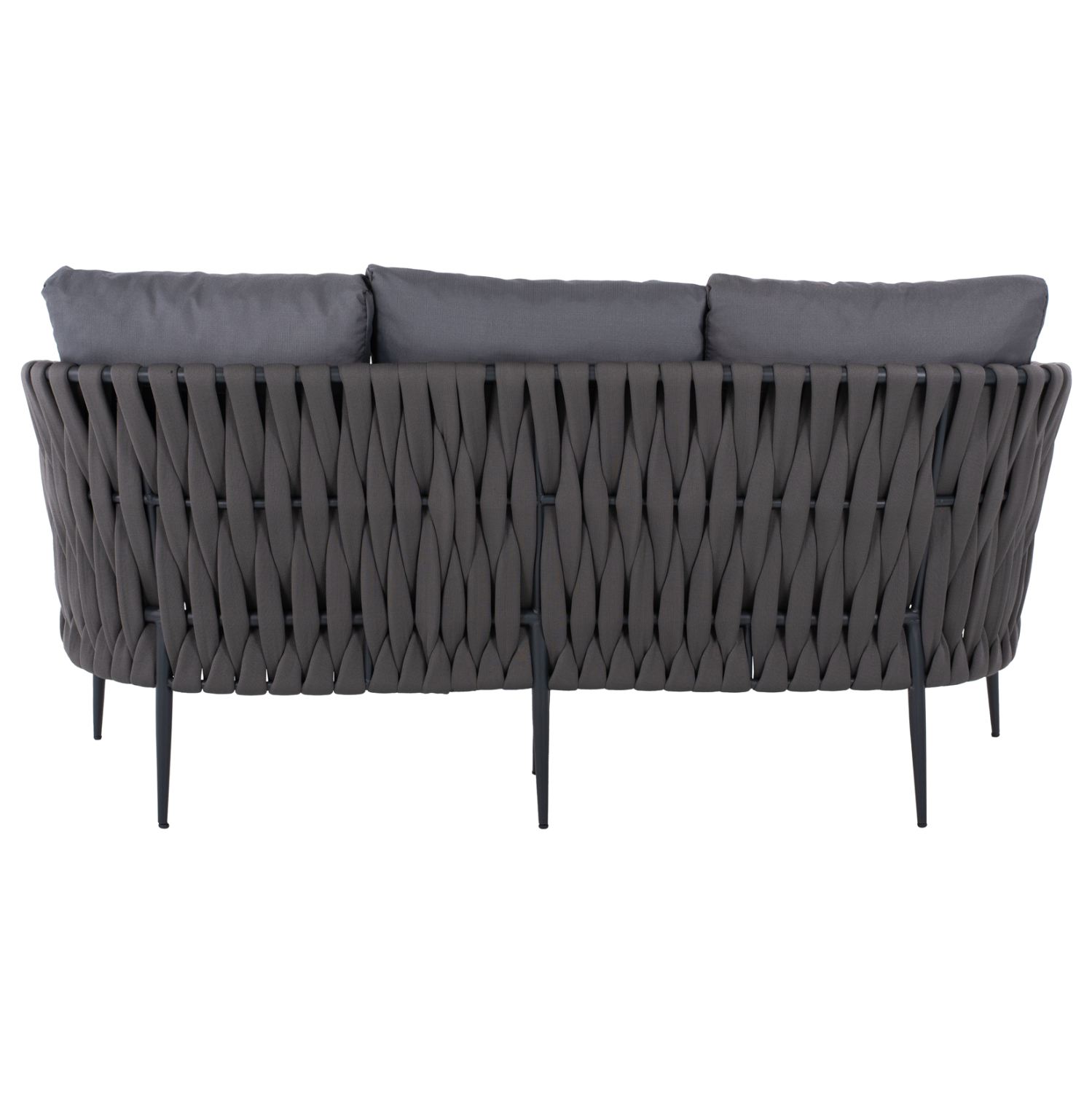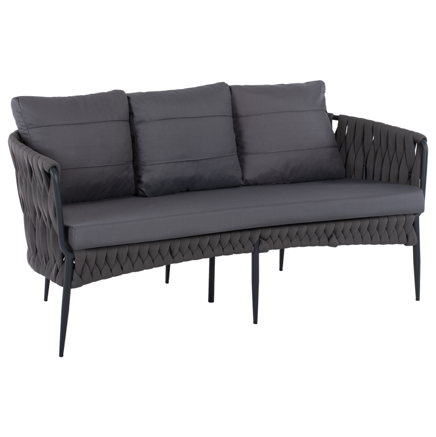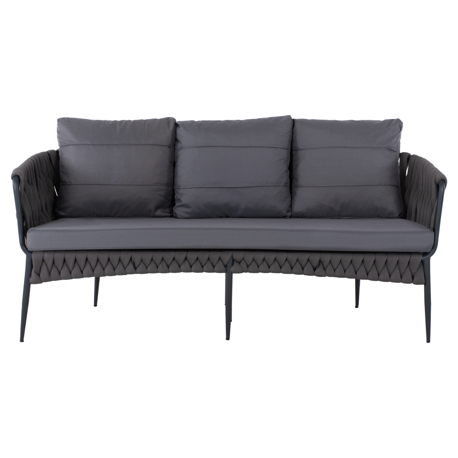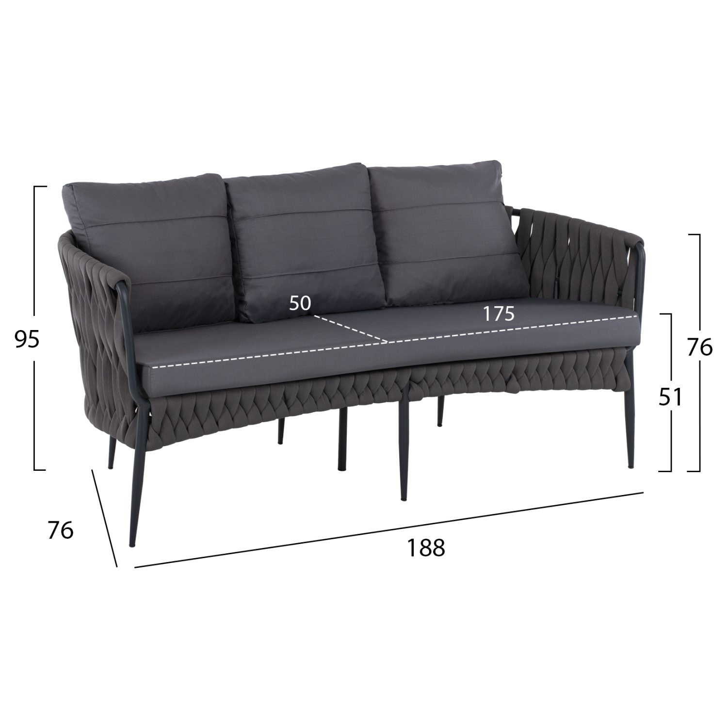 HM5924.10 --Σας παρουσιάζουμε έναν πανέμορφο 3θέσιο καναπέ στις αποχρώσεις του ΓΚΡΙ. Ο συνδυασμός του σκελετού αλουμινίου με το ΑΦΡΩΔΕΣ σχοινί που διατρέχει πλεγμένο όλο τον καναπέ, καθώς και τα 3 μεγάλα μαξιλάρια πλάτης είναι μοναδικός, και μπορεί να αλλάξει άμεσα την εικόνα οποιουδήποτε εξωτερικού χώρου. Χαρακτηριστικό γνώρισμα αυτού του καναπέ είναι ότι τα πόδια είναι ψηλά, με αποτέλεσμα και το ύψος του καθίσματος να είναι ψηλό.