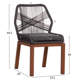 Η καρέκλα τραπεζαρίας εξωτερικού χώρου HOWARD δεν περνάει απαρατήρητη. Είναι κατασκευασμένη από αλουμίνιο και σχοινί. Τα πόδια είναι σε ΚΑΦΕ χρώμα ενώ το σχοινί και το μαξιλάρι καθίσματος είναι σε ΣΚΟΥΡΗ ΓΚΡΙ απόχρωση. Μια ποιοτική πρόταση τόσο για επαγγελματική χρήση, όσο και για οικιακή.