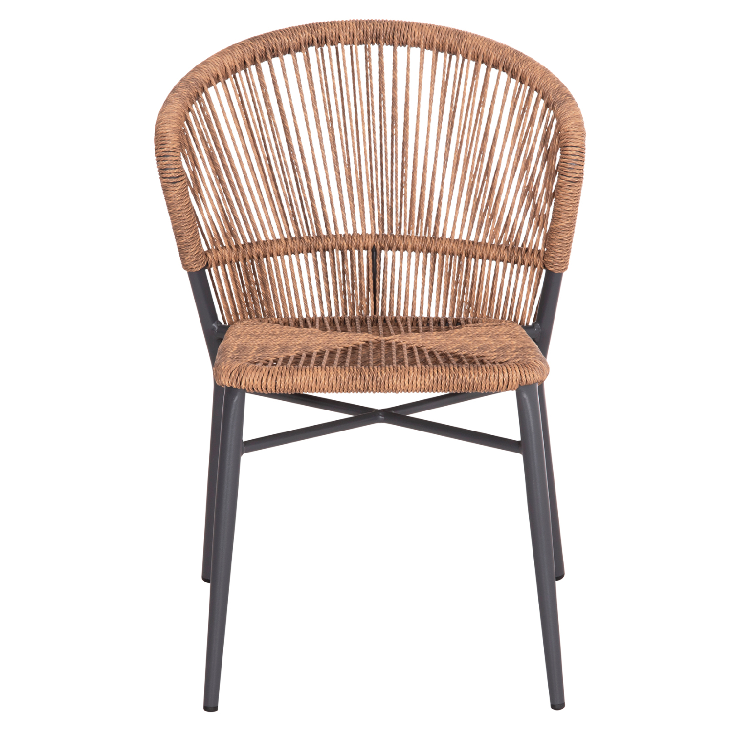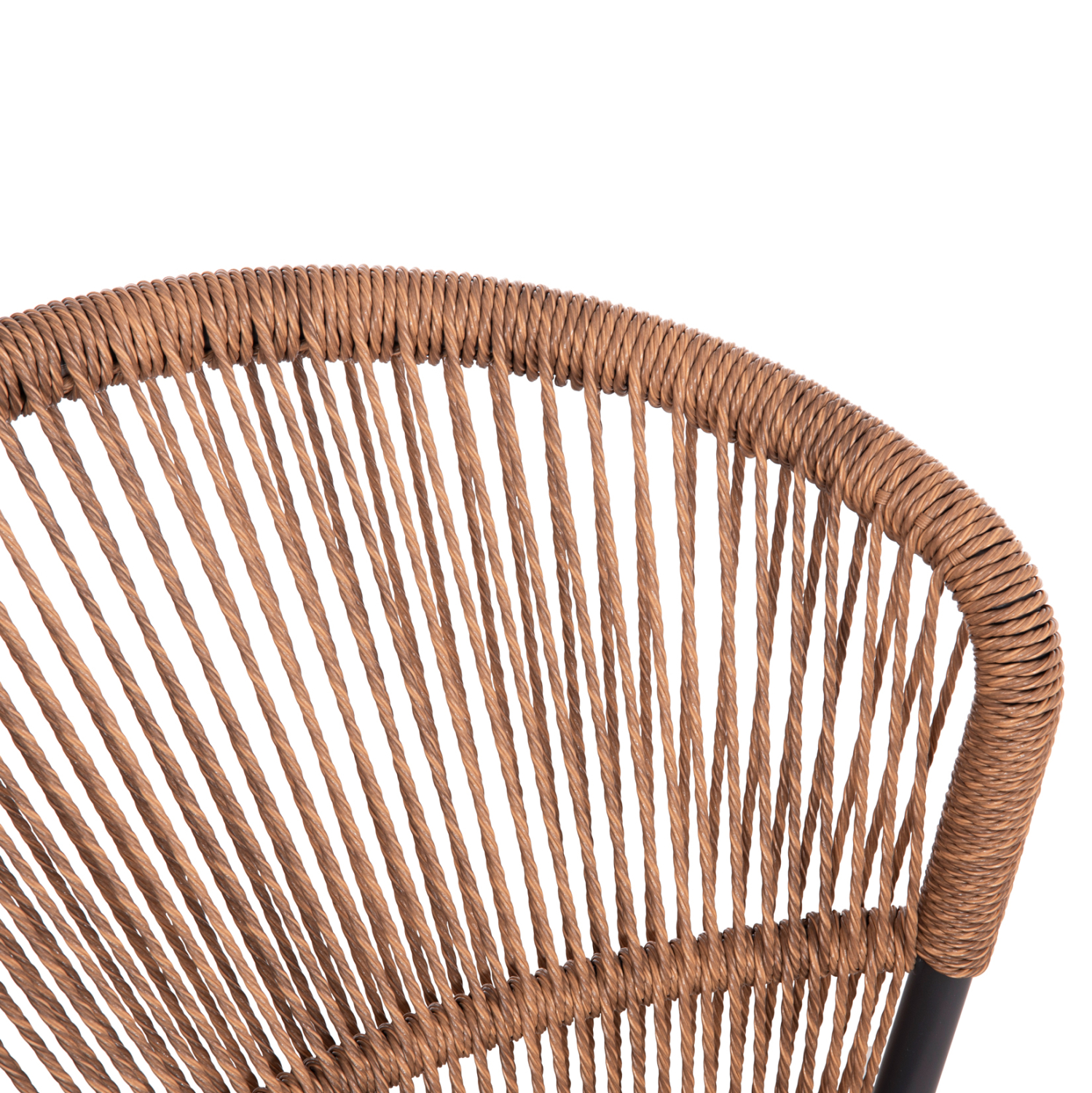 Η πλάτη και το κάθισμα της καρέκλας είναι από P.E. Rattan σε πλέξη. Δηλαδή, η πλέξη έχει γίνει με πολυεστερικές ίνες υψηλής ποιότητας και αντοχής ανθεκτικές σε ακραίες καιρικές συνθήκες ζέστης ή κρύου, που μοιάζουν με σχοινί.