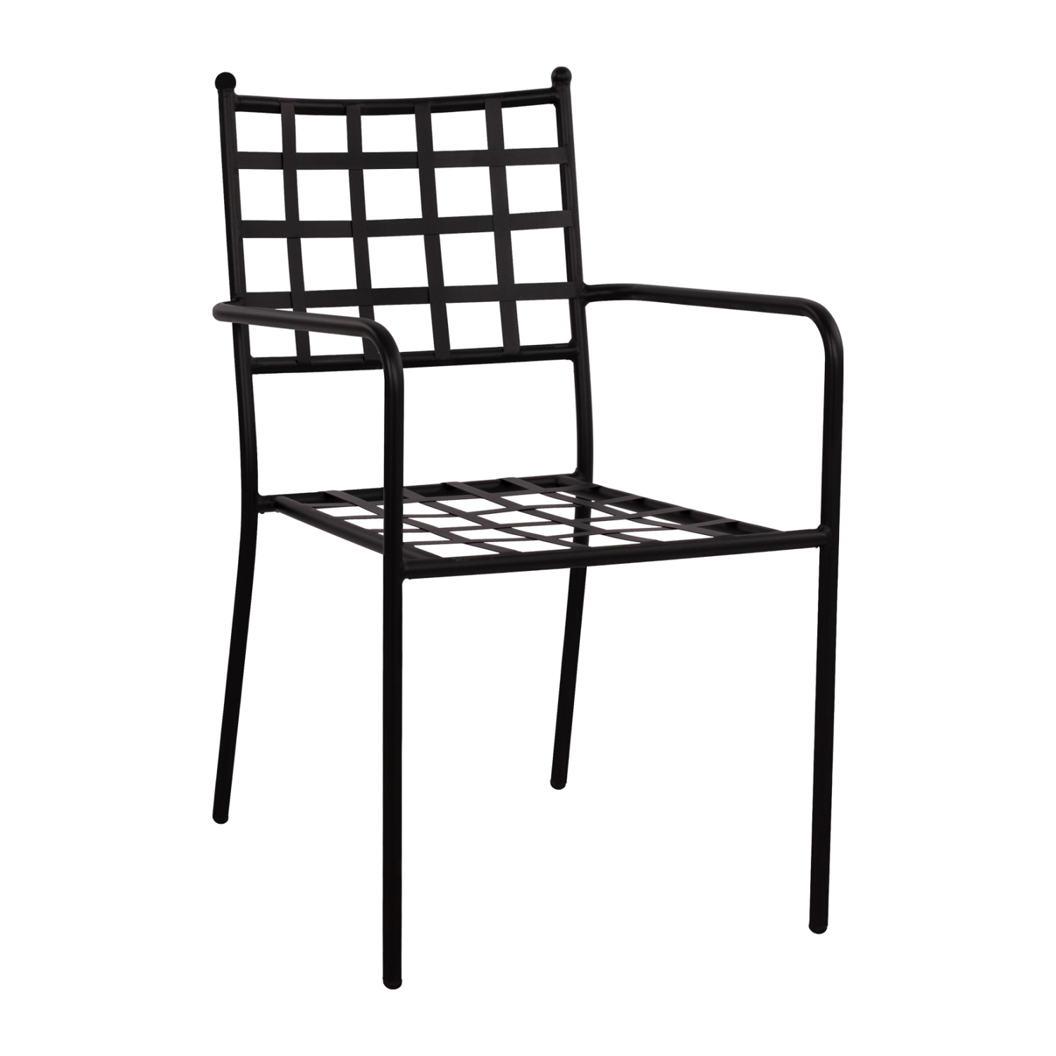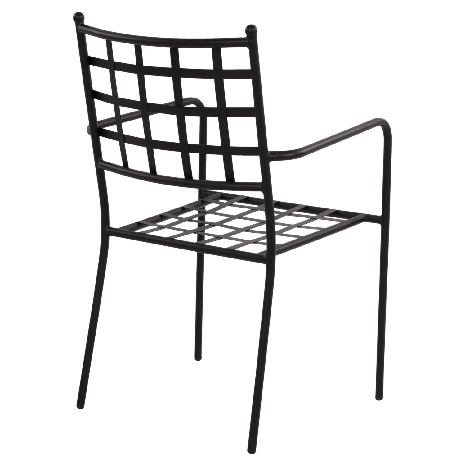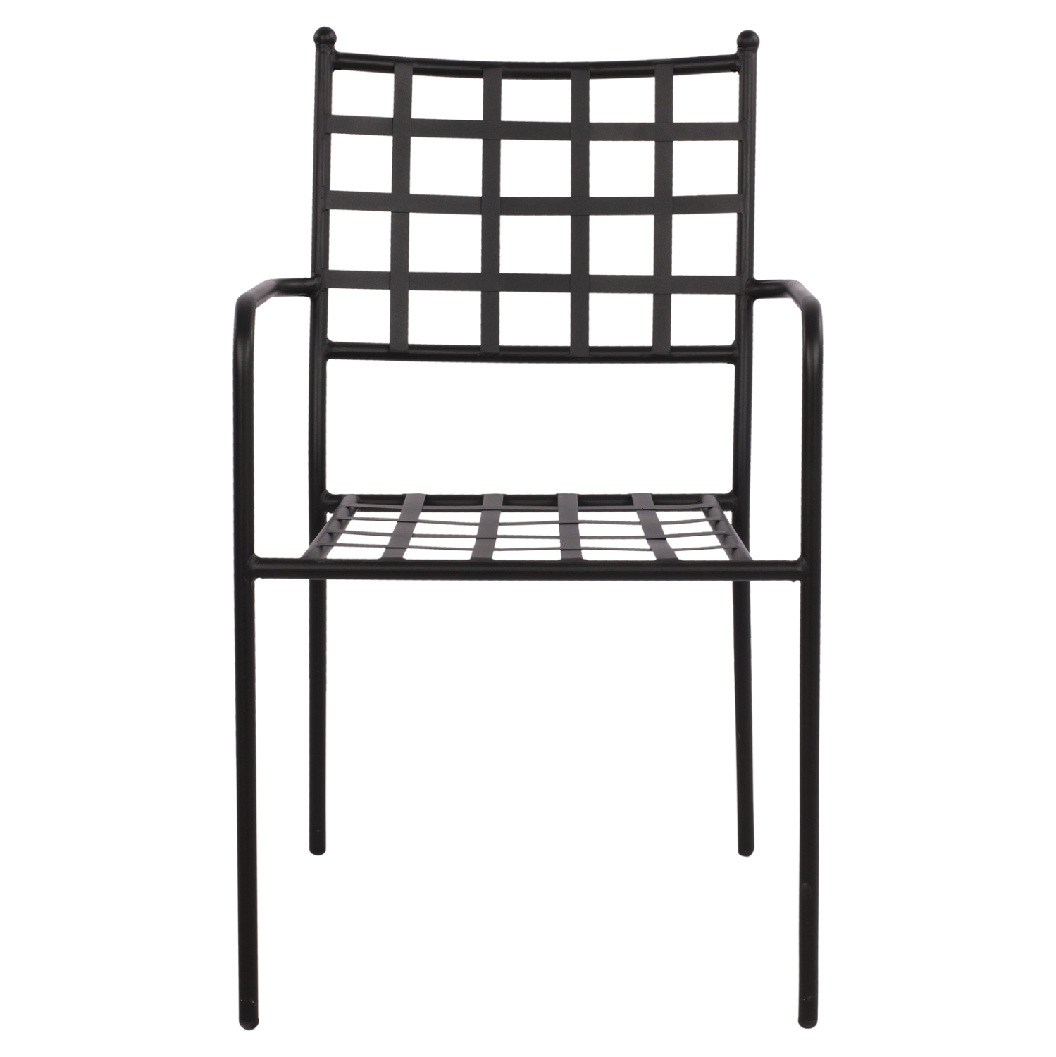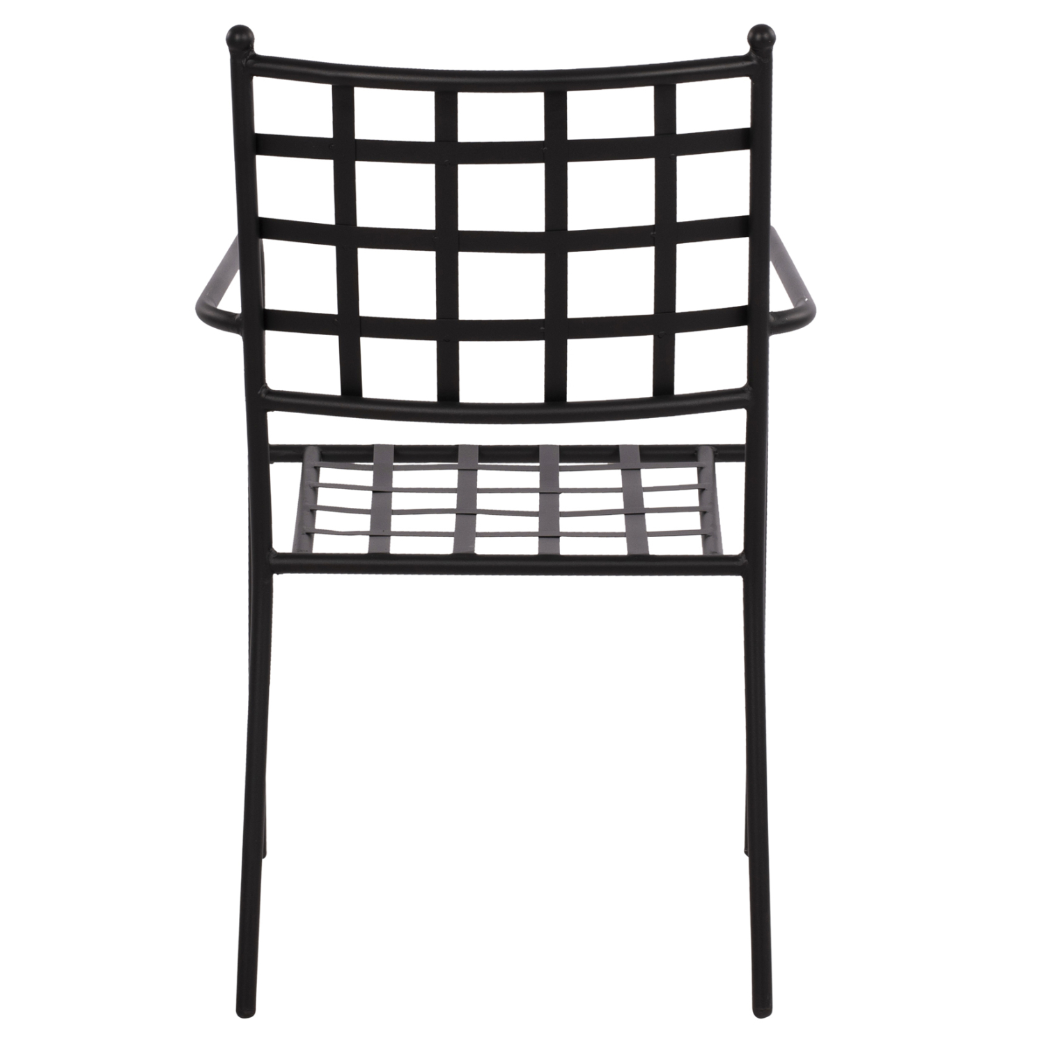 Στιβαρή και μεγάλης αντοχής μεταλλική πολυθρόνα σε μαύρη απόχρωση, ιδανική για εξωτερικούς χώρους.