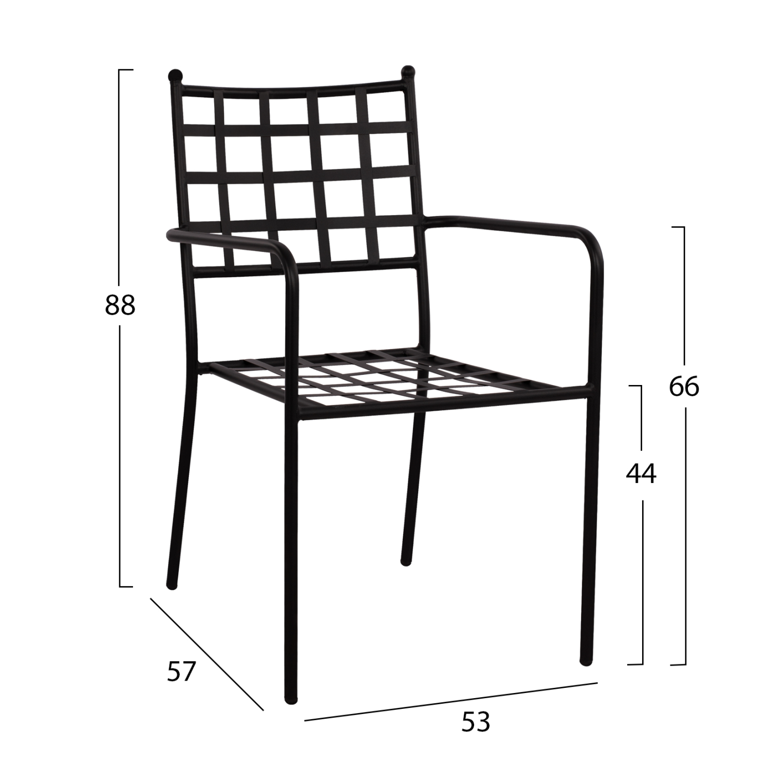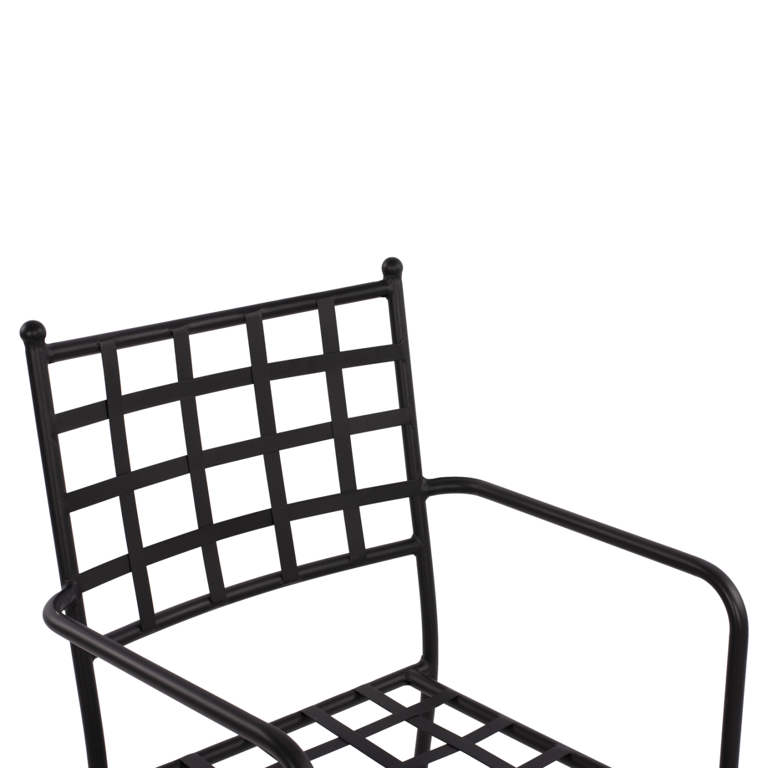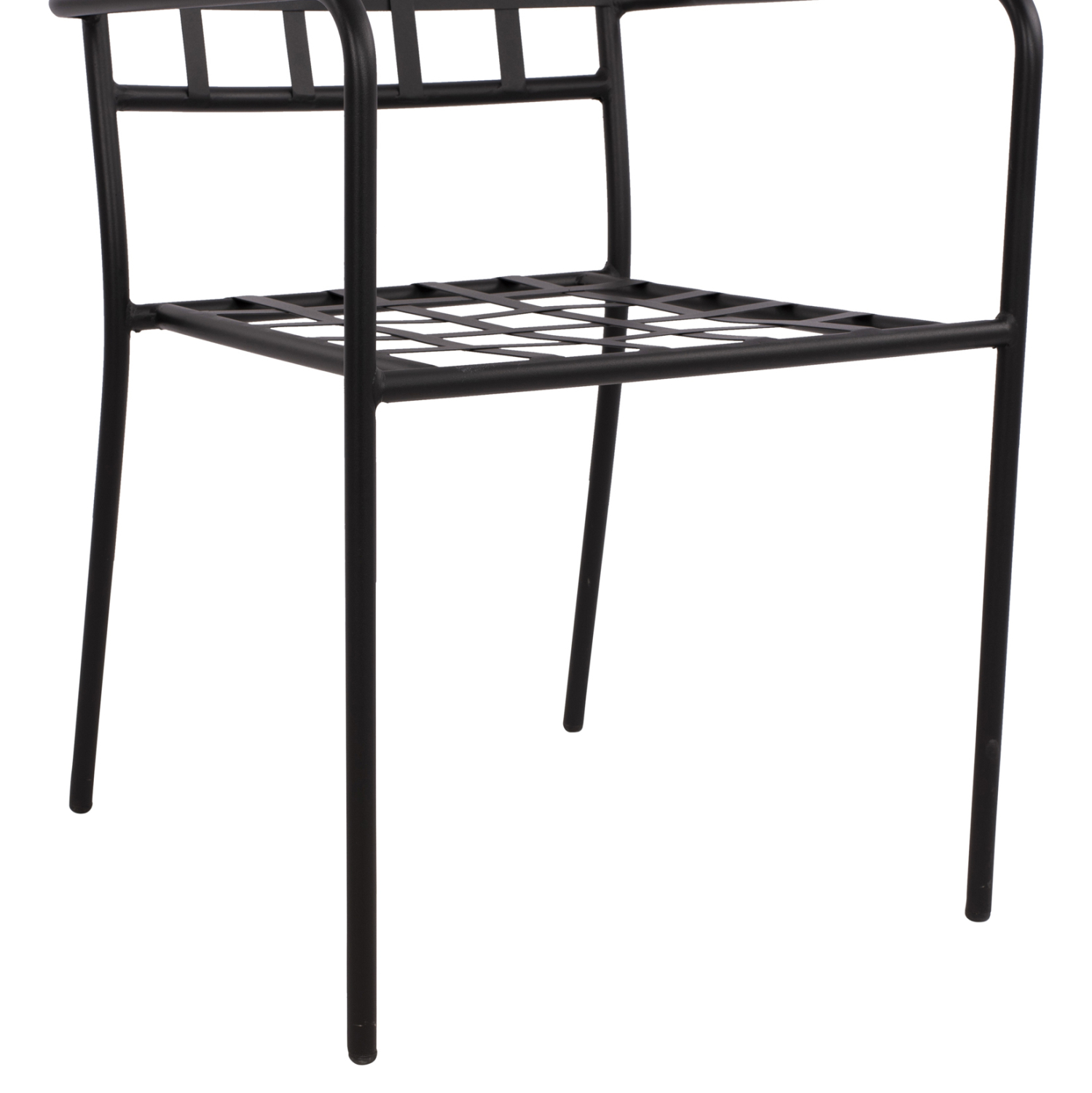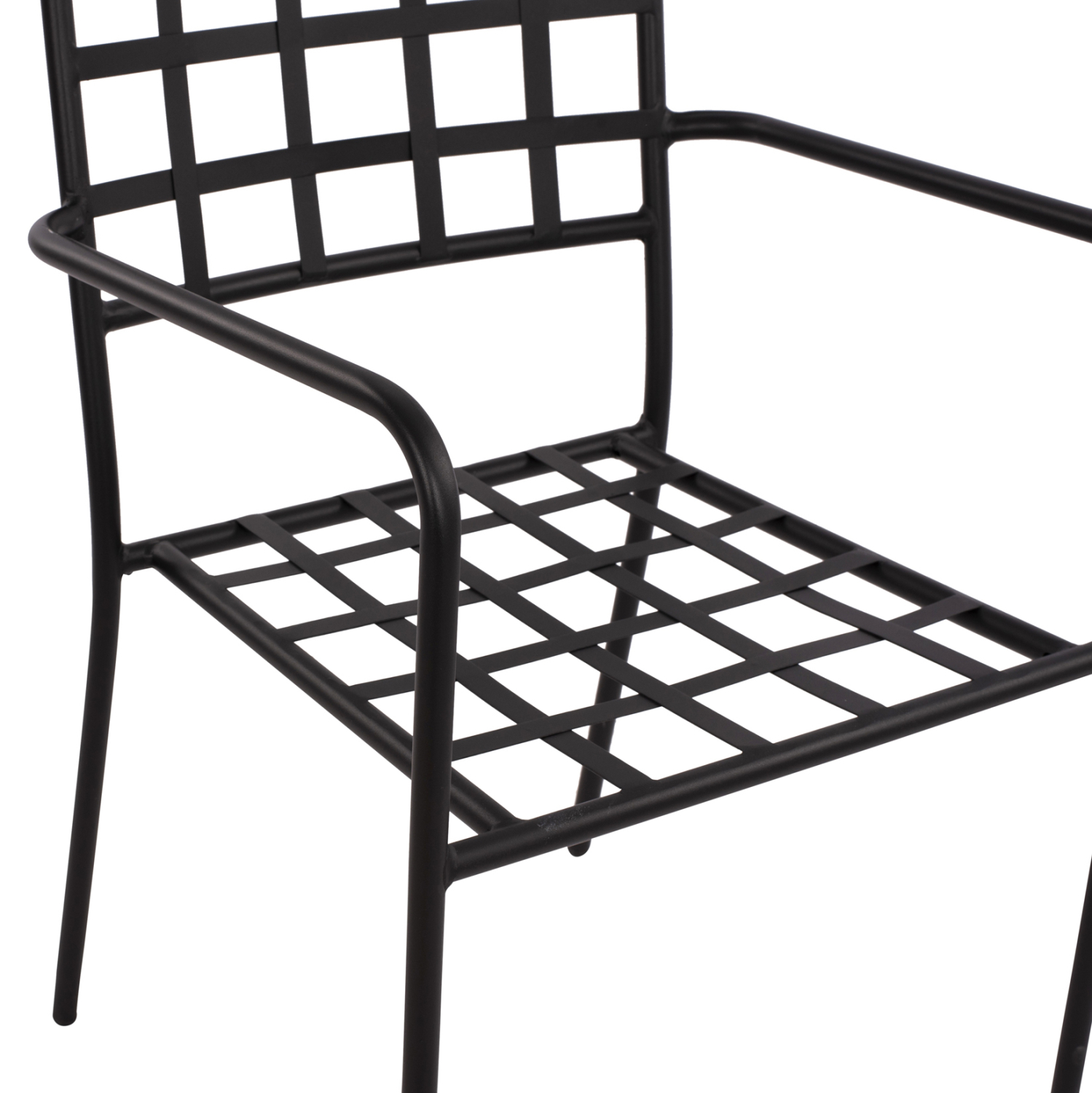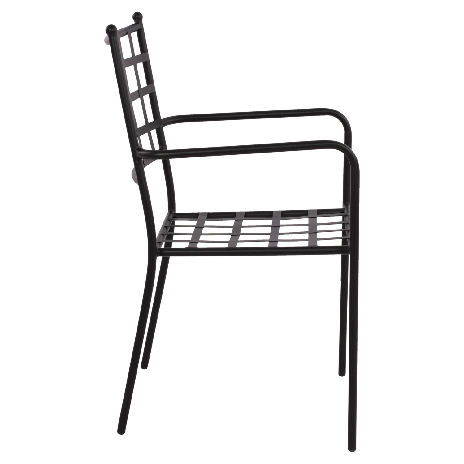 Στιβαρή και μεγάλης αντοχής μεταλλική πολυθρόνα σε μαύρη απόχρωση, ιδανική για εξωτερικούς χώρους.