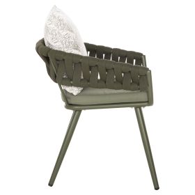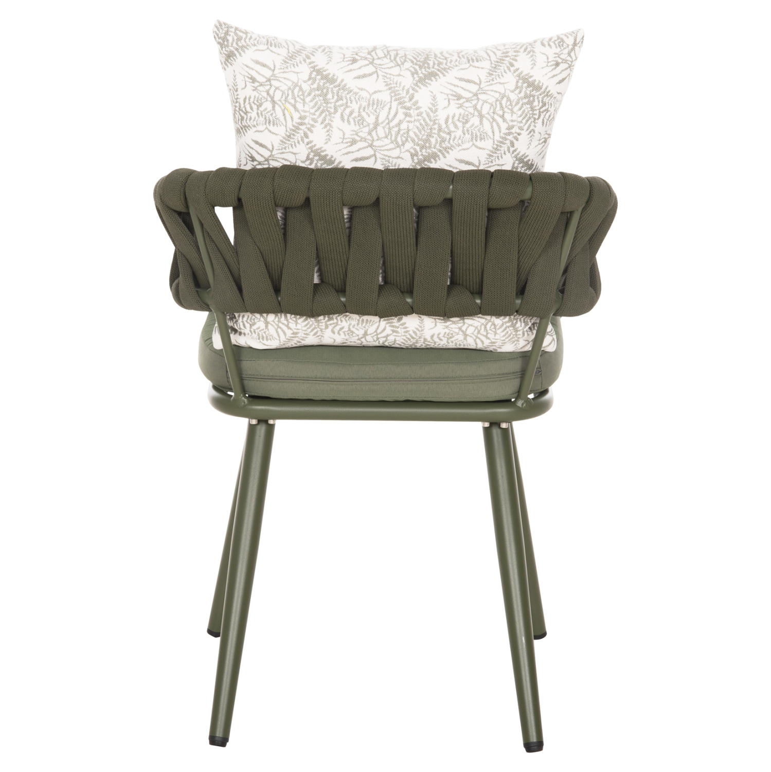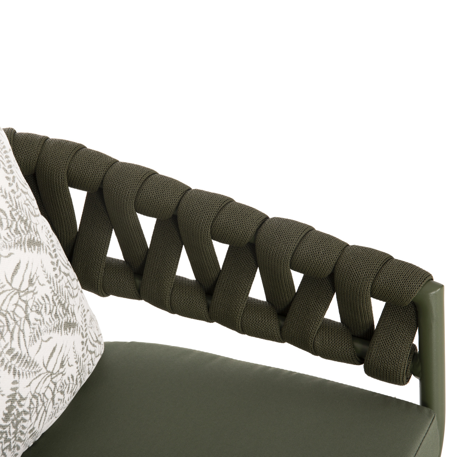Η πολυθρόνα αλουμινίου CAMDEN σε DARK OLIVE χρώμα δεν έχει ξεχωριστά μπράτσα αλλά η πλάτη είναι ημικυκλική αγκαλιάζοντας το σώμα. Πρόκειται για μια πανέμορφη πολυθρόνα με χαμηλή πλάτη από συνθετικό φαρδύ πολυεστερικό σχοινί (terylene). Το ιδιαίτερο χαρακτηριστικό αυτής της πολυθρόνας είναι ότι διαθέτει αναπαυτικά μαξιλάρια (με φερμουάρ) τόσο στο κάθισμα σε DARK OLIVE χρώμα, όσο και στην πλάτη σε λευκό χρώμα με PRINT σχέδιο.