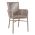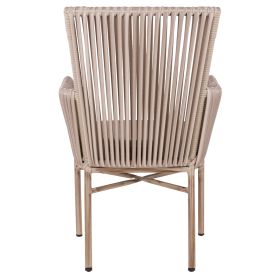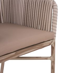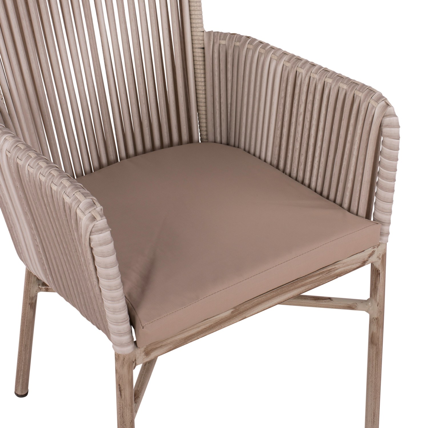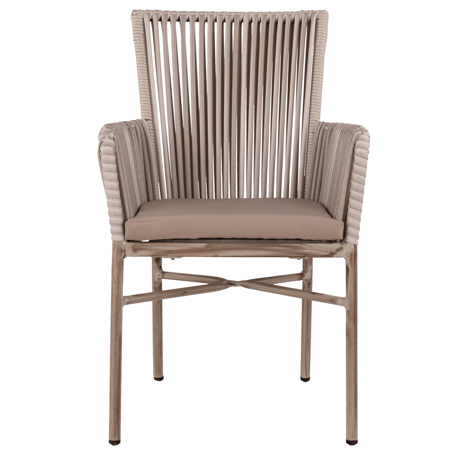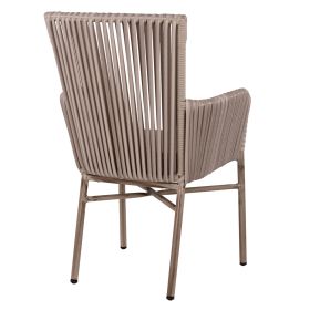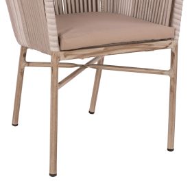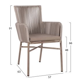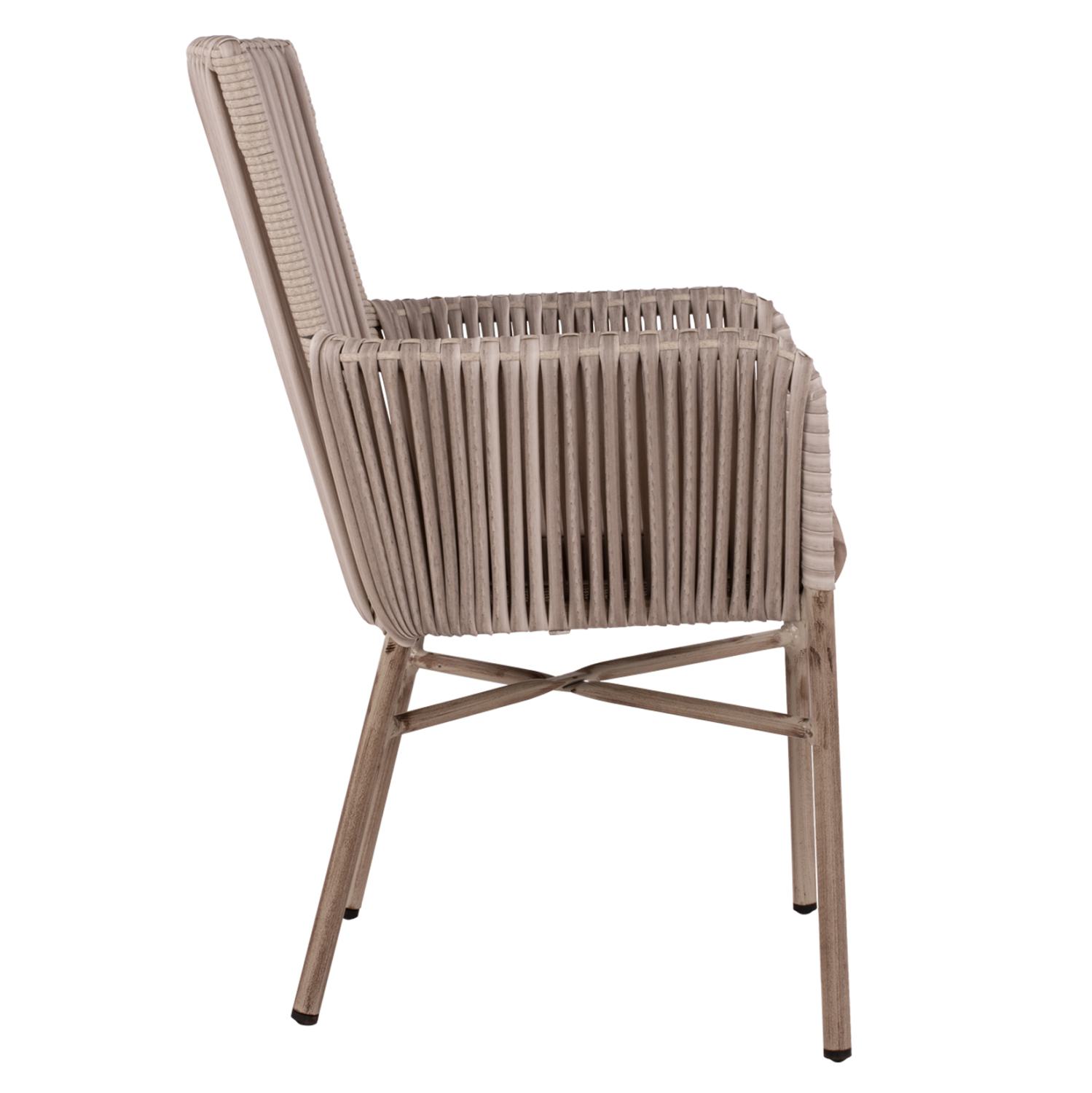 Μοντέρνα πολυθρόνα εξωτερικού χώρου, κατασκευασμένη από σκελετό αλουμινίου σε γκρι πατίνα απόχρωση και επενδυμένη με πλεκτό wicker σε ανοιχτό γκρι χρώμα.