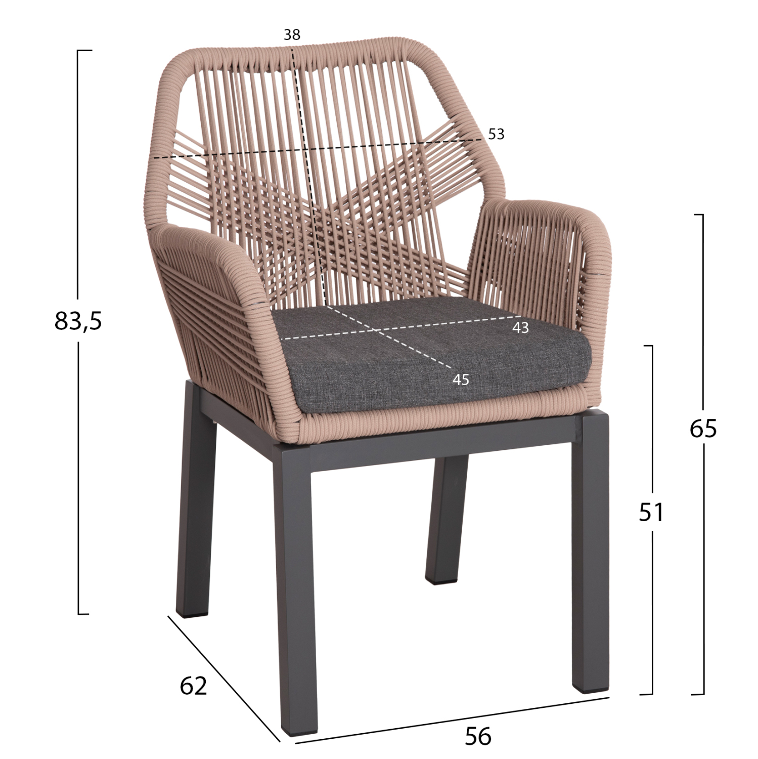 Η πολυθρόνα HOWARD έχει ΑΝΘΡΑΚΙ σκελετό αλουμινίου και αναπαυτικό μαξιλάρι στο κάθισμα σε ίδιο χρώμα. Η πλάτη και τα μπράτσα είναι από πλεκτό σχοινί TEXTILENE σε ΜΠΕΖ χρώμα. Ιδανική για χώρους εστίασης αλλά και για το σπίτι σας, θα σας χαρίσει άνεση και ξεκούραση με την μέγιστη δυνατή ποιότητα υλικών και φινιρίσματος.