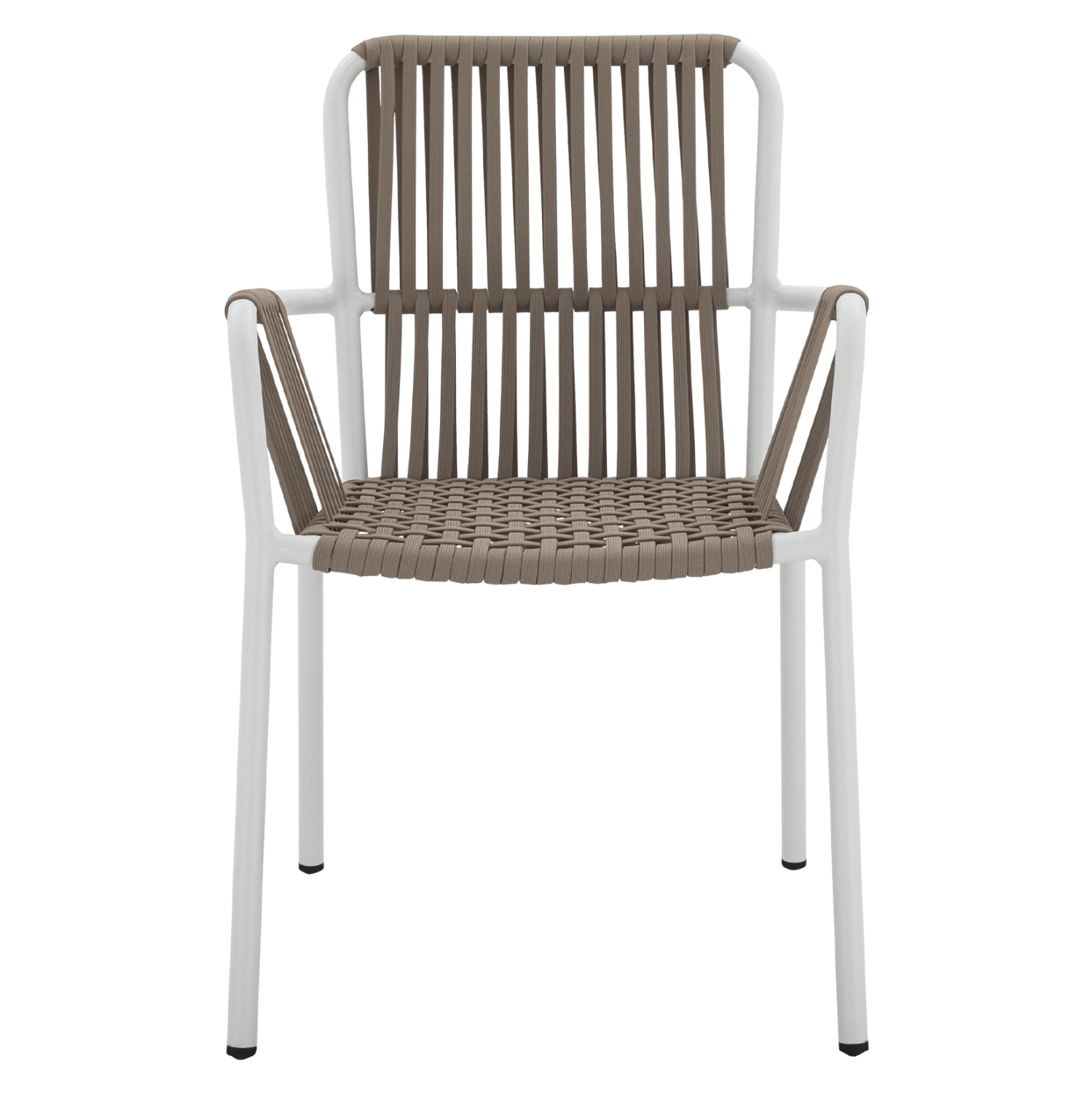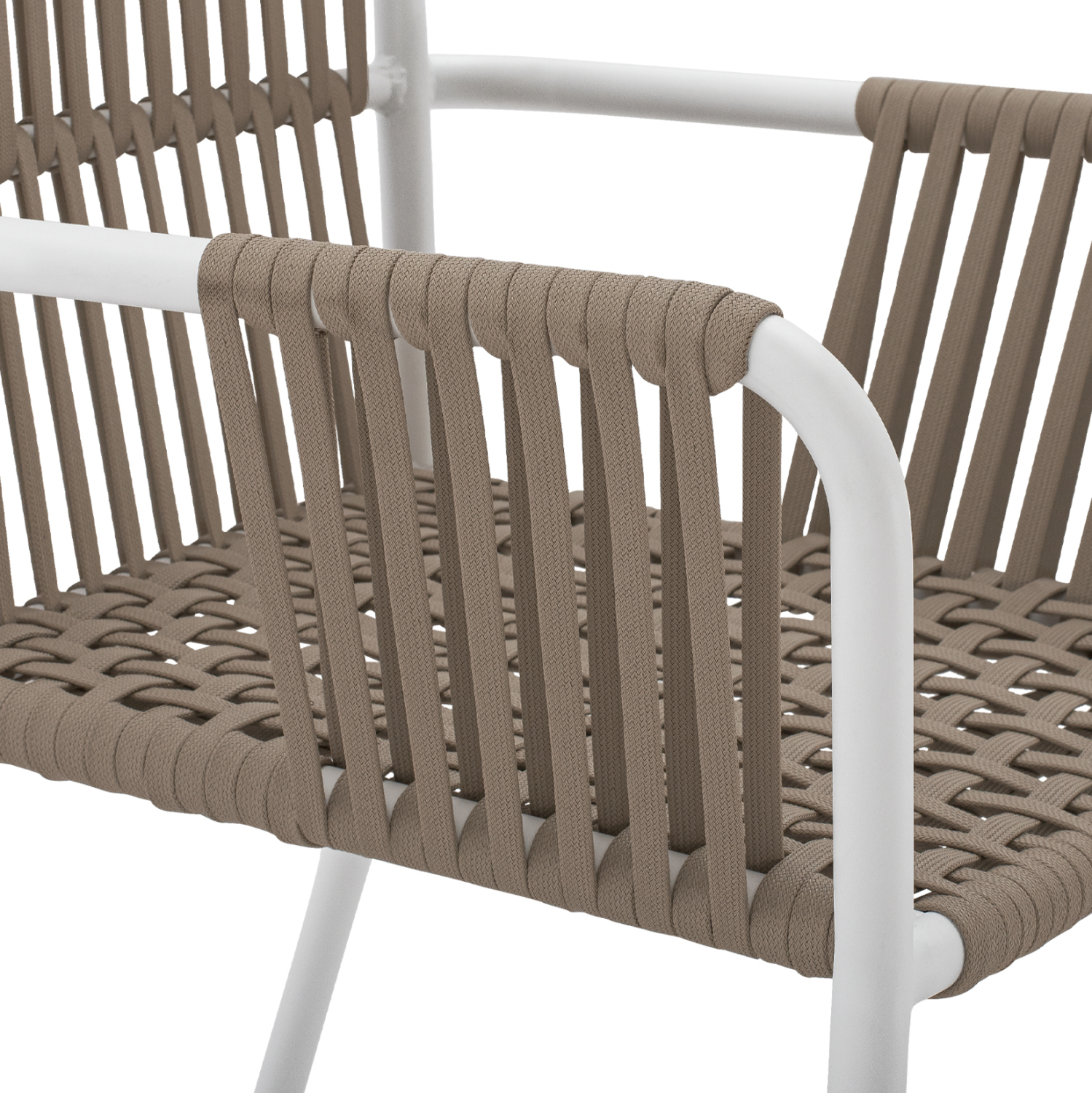 Μοντέρνο πολυθρόνα, κατασκευασμένη από σκελετό αλουμινίου σε λευκή απόχρωση, επενδυμένη με πλεκτό pe πλατύ κορδόνι στην πλάτη σε καπουτσίνο απόχρωση.