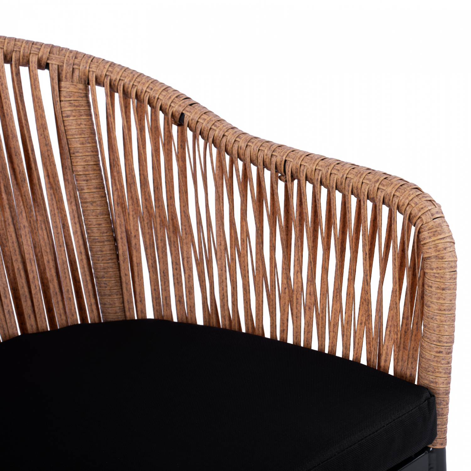 Μοντέρνα πολυθρόνα εξωτερικού χώρου, κατασκευασμένη από αλουμινένιο σκελετό σε ανθρακί απόχρωση και επενδυμένη με πλεκτό wicker σε μπεζ απόχρωση.