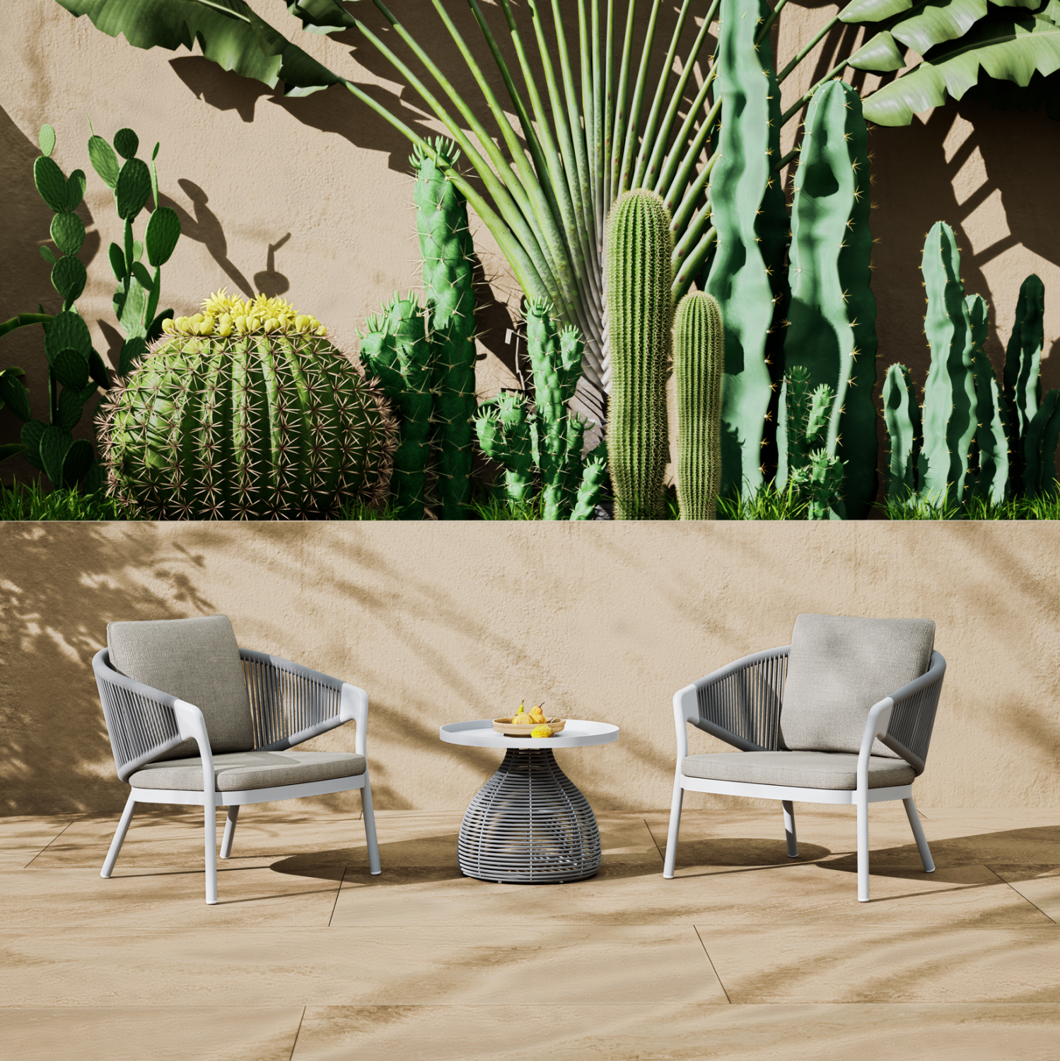 •Περιλαμβάνονται μαξιλάρια καθίσματος και πλάτης με αφαιρούμενα καλύμματα από πολυεστερικό ύφασμα, κατάλληλο για εξωτερικούς χώρους.