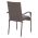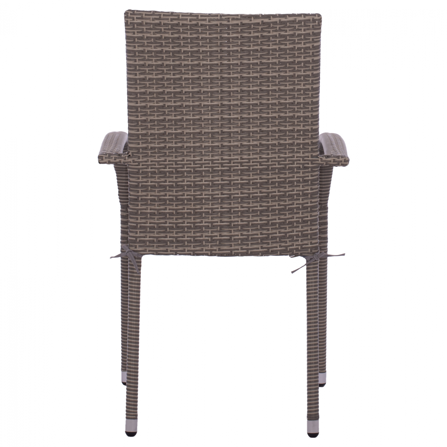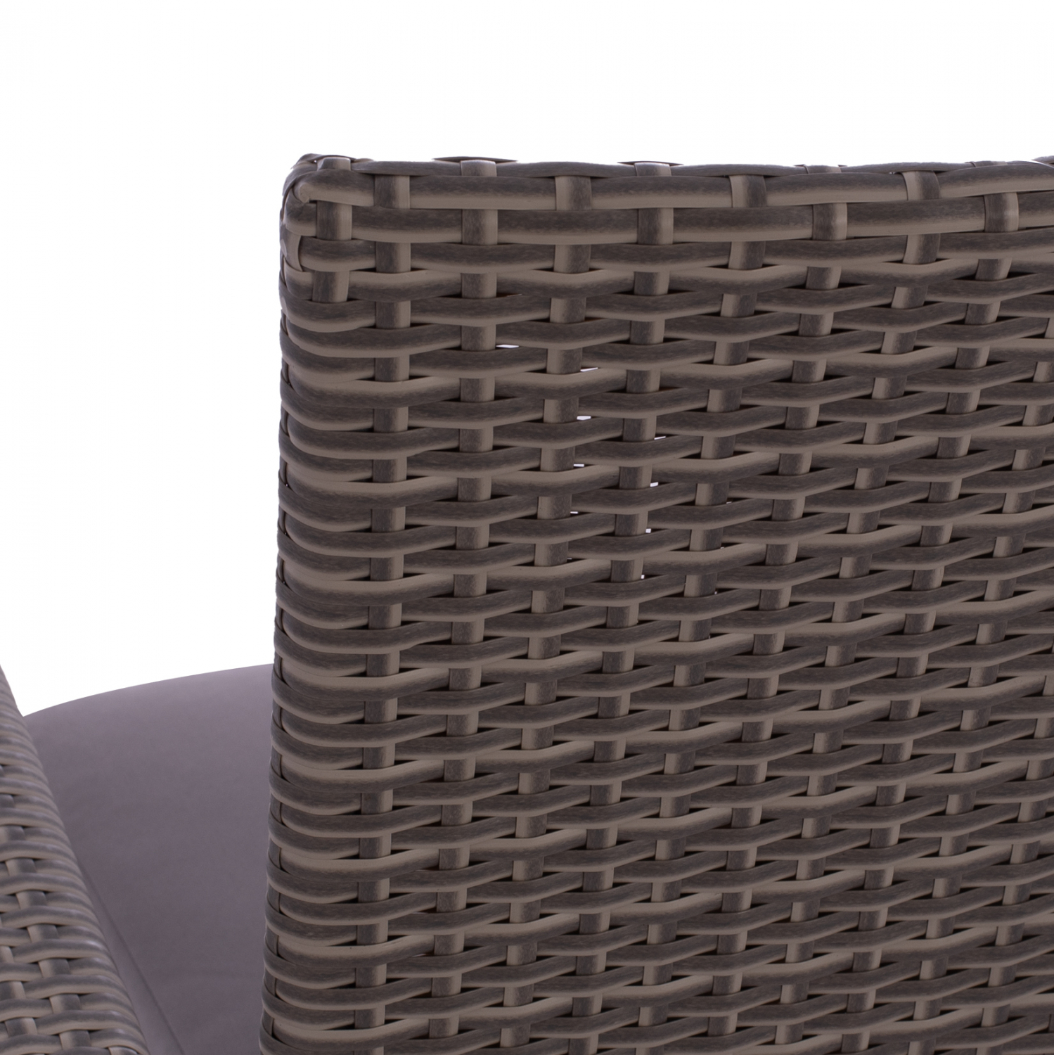 Μοντέρνα πολυθρόνα εξωτερικού χώρου, κατασκευασμένη από μεταλλικό σκελετό και επενδυμένη με πλεκτό wicker σε γκρι απόχρωση και γκρι μαξιλάρι.