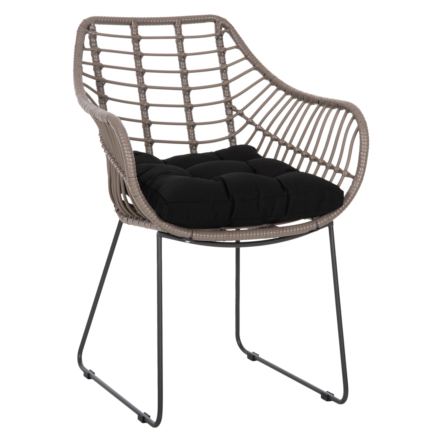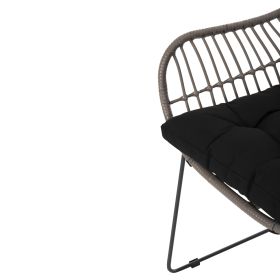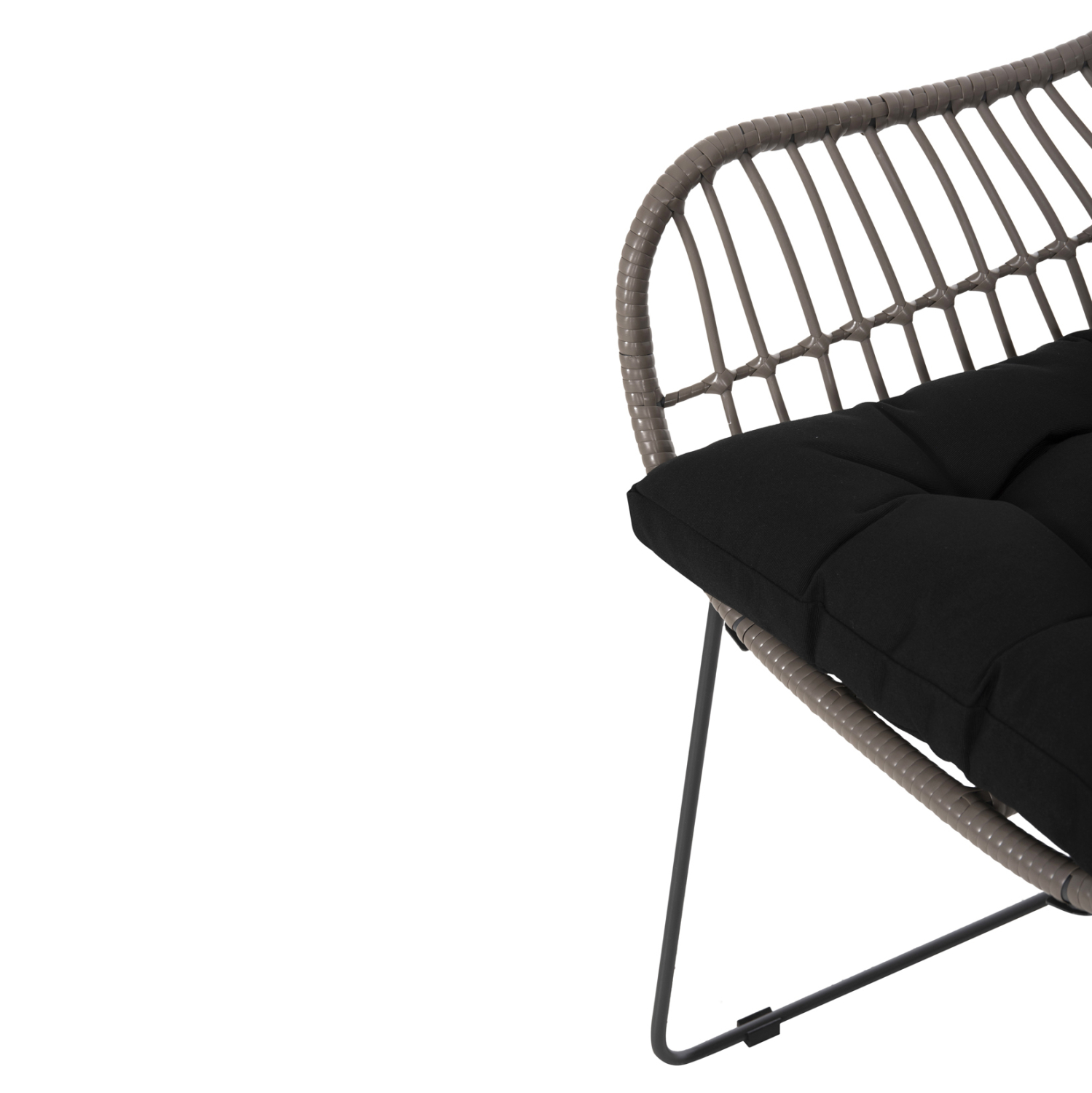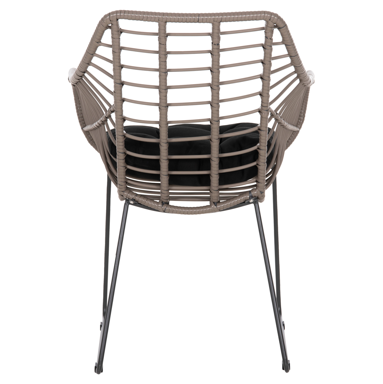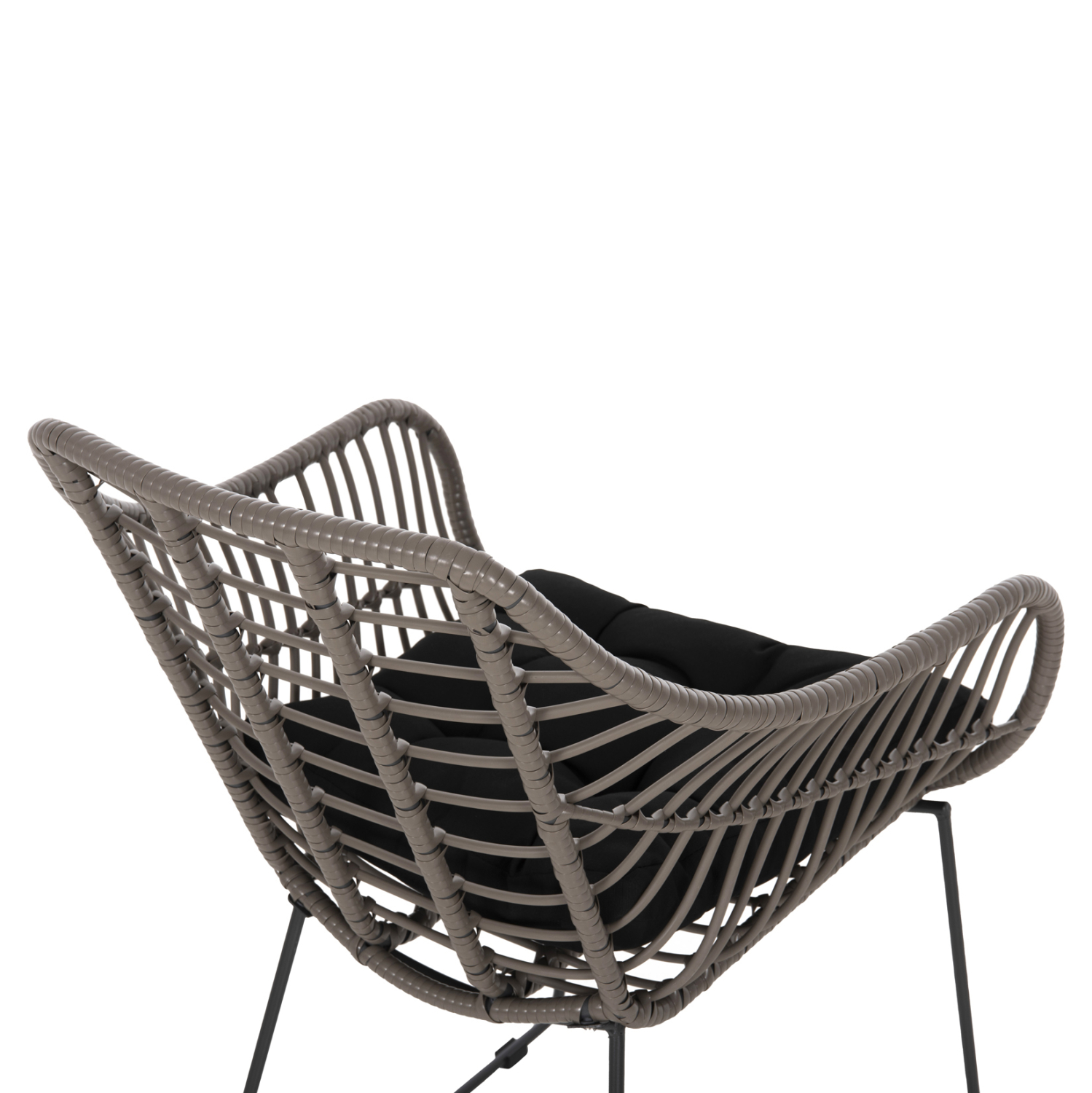Μοντέρνα πολυθρόνα εξωτερικού χώρου, κατασκευασμένη από μεταλλικό μασίφ σκελετό σε μαύρη απόχρωση και επενδυμένη με πλεκτό wicker σε γκρι μόκα απόχρωση.