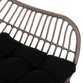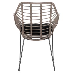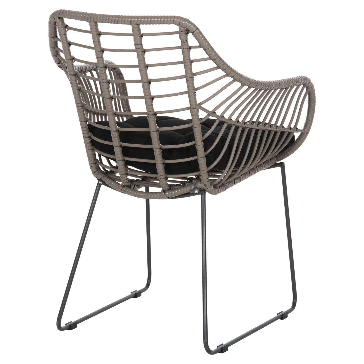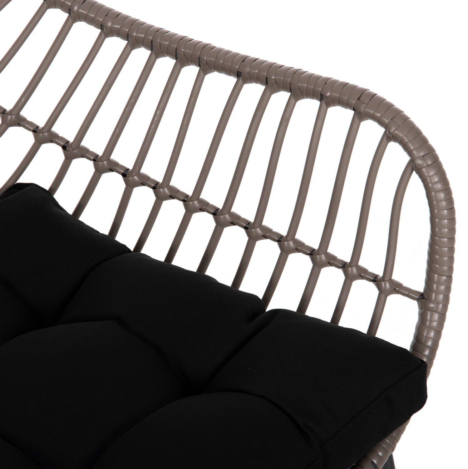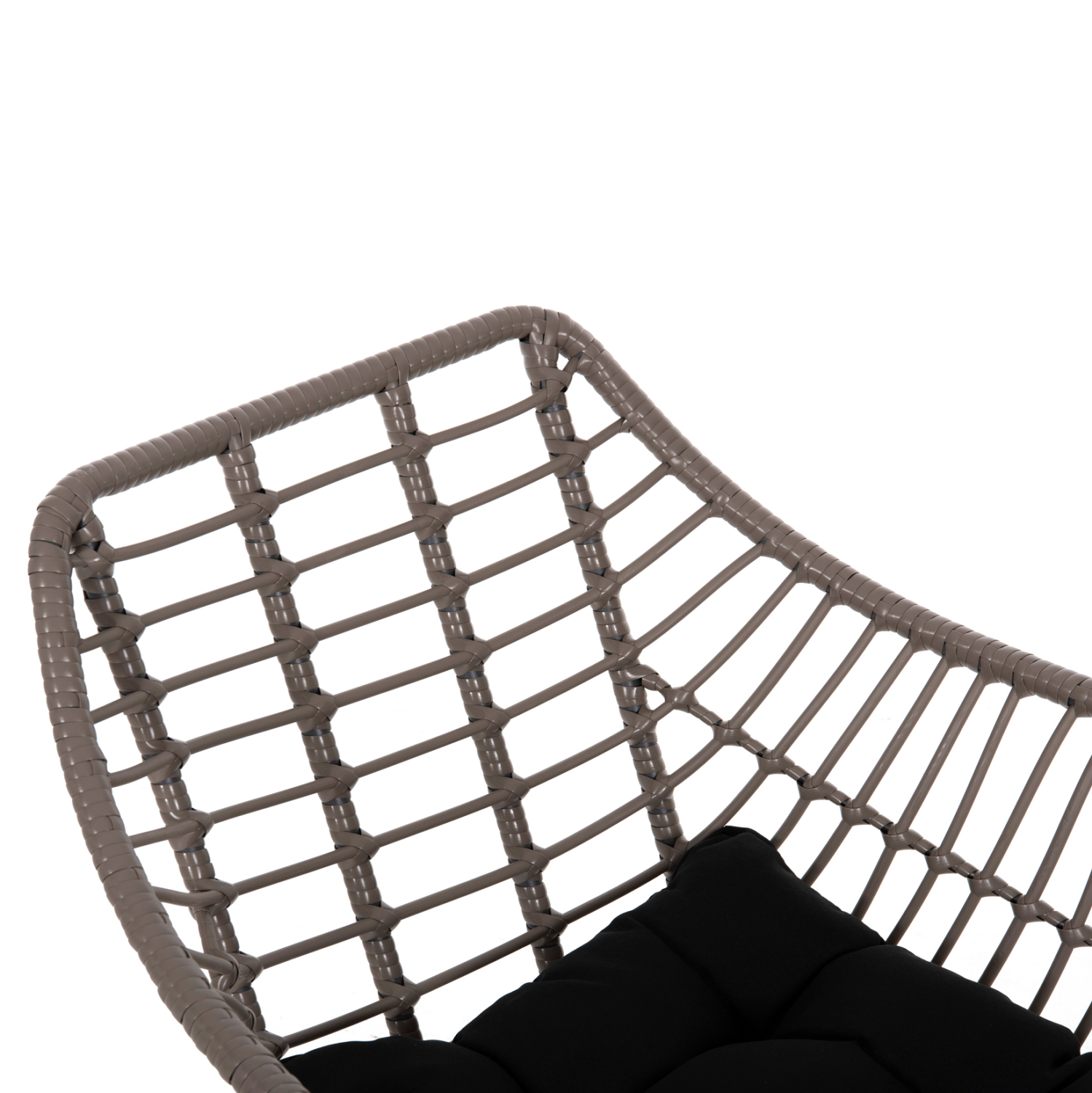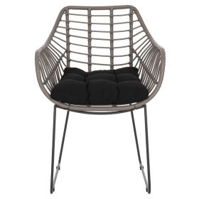 Μοντέρνα πολυθρόνα εξωτερικού χώρου, κατασκευασμένη από μεταλλικό μασίφ σκελετό σε μαύρη απόχρωση και επενδυμένη με πλεκτό wicker σε γκρι μόκα απόχρωση.