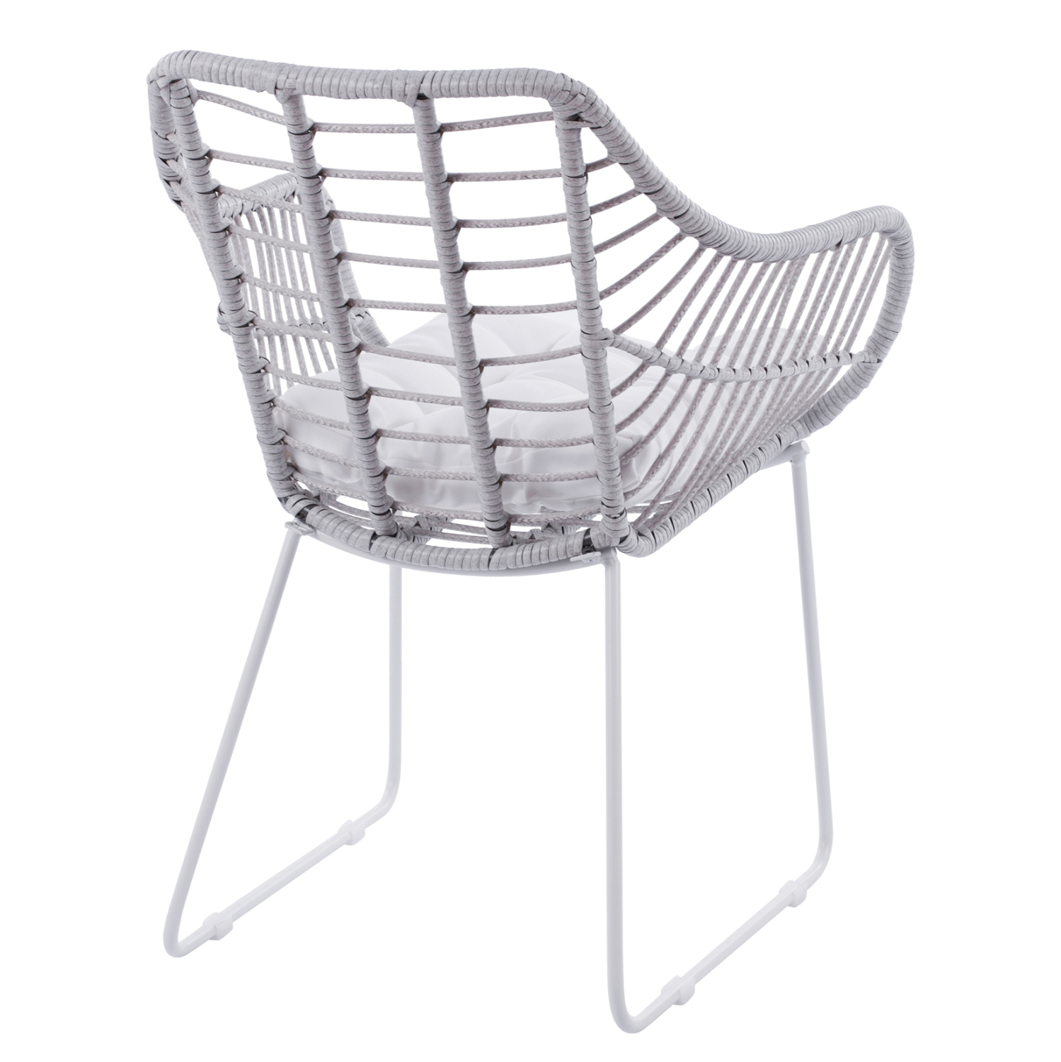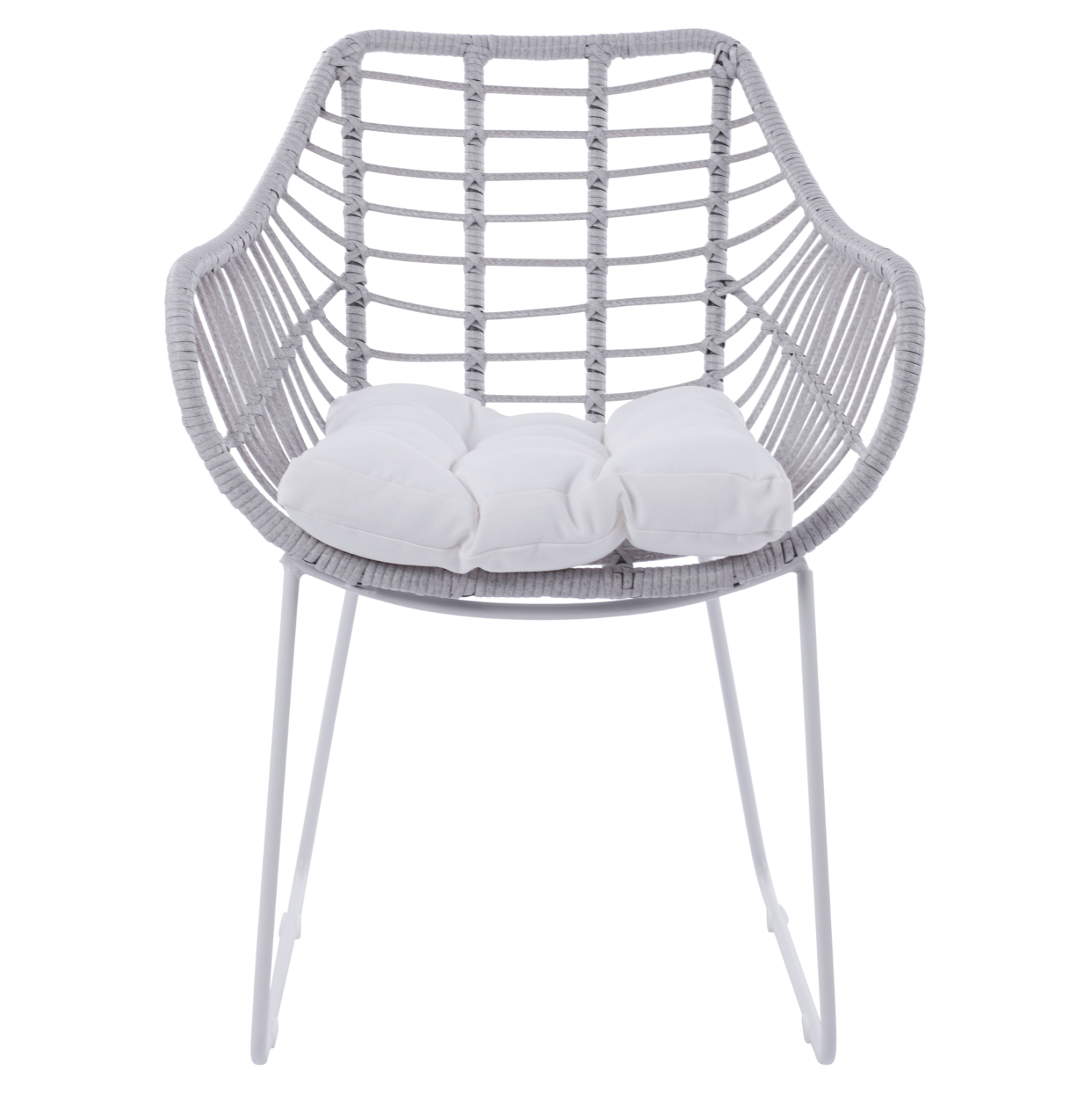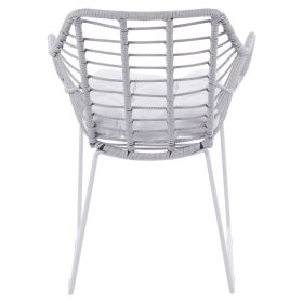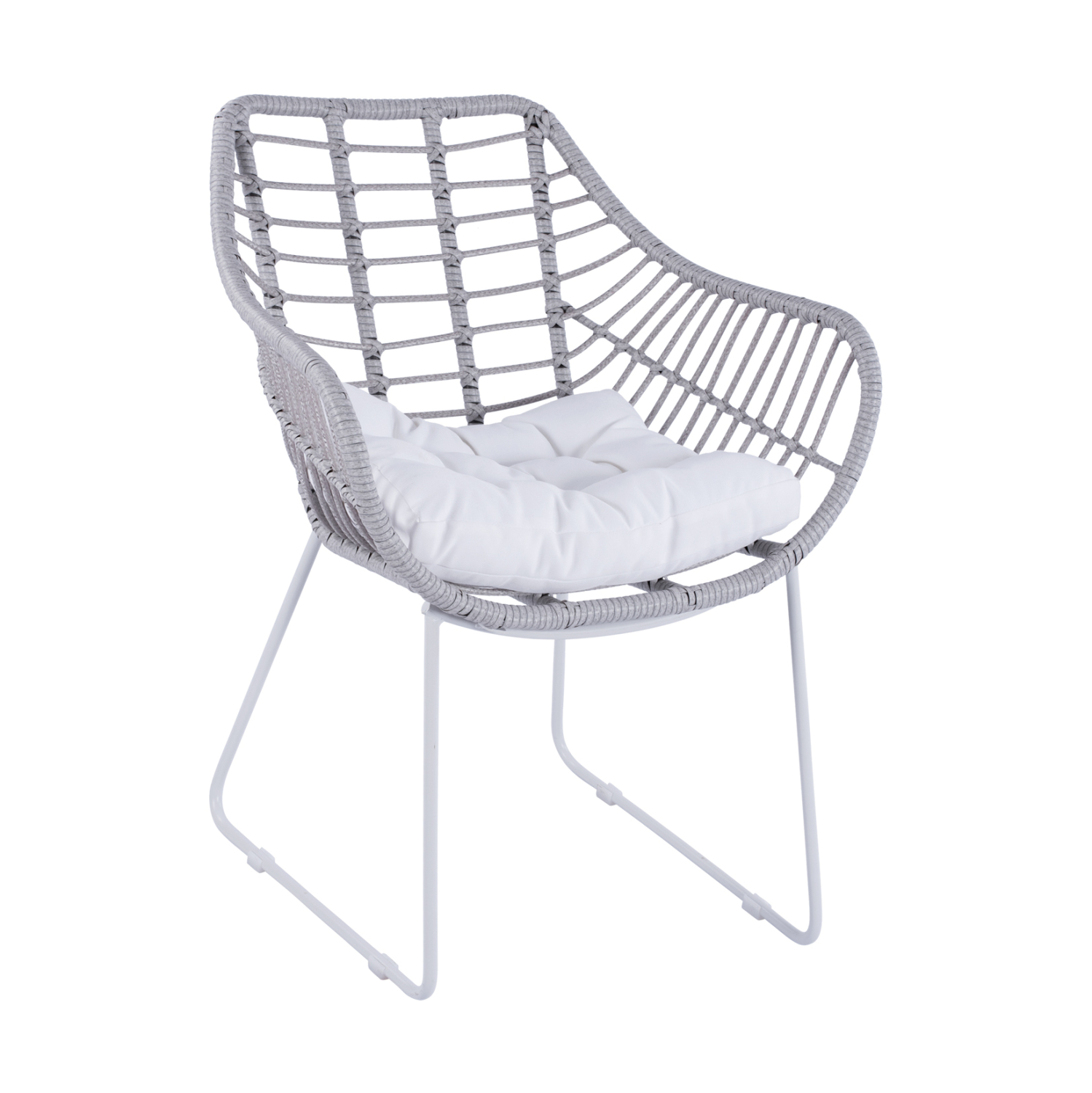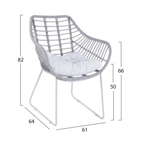 Μοντέρνα πολυθρόνα εξωτερικού χώρου, κατασκευασμένη από μεταλλικό σκελετό σε άσπρη ματ απόχρωση και επενδυμένη με πλεκτό wicker σε γκρι απόχρωση.