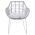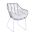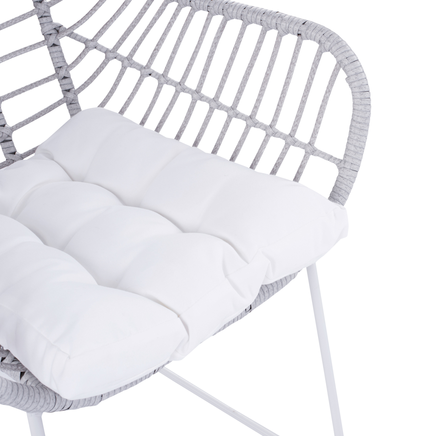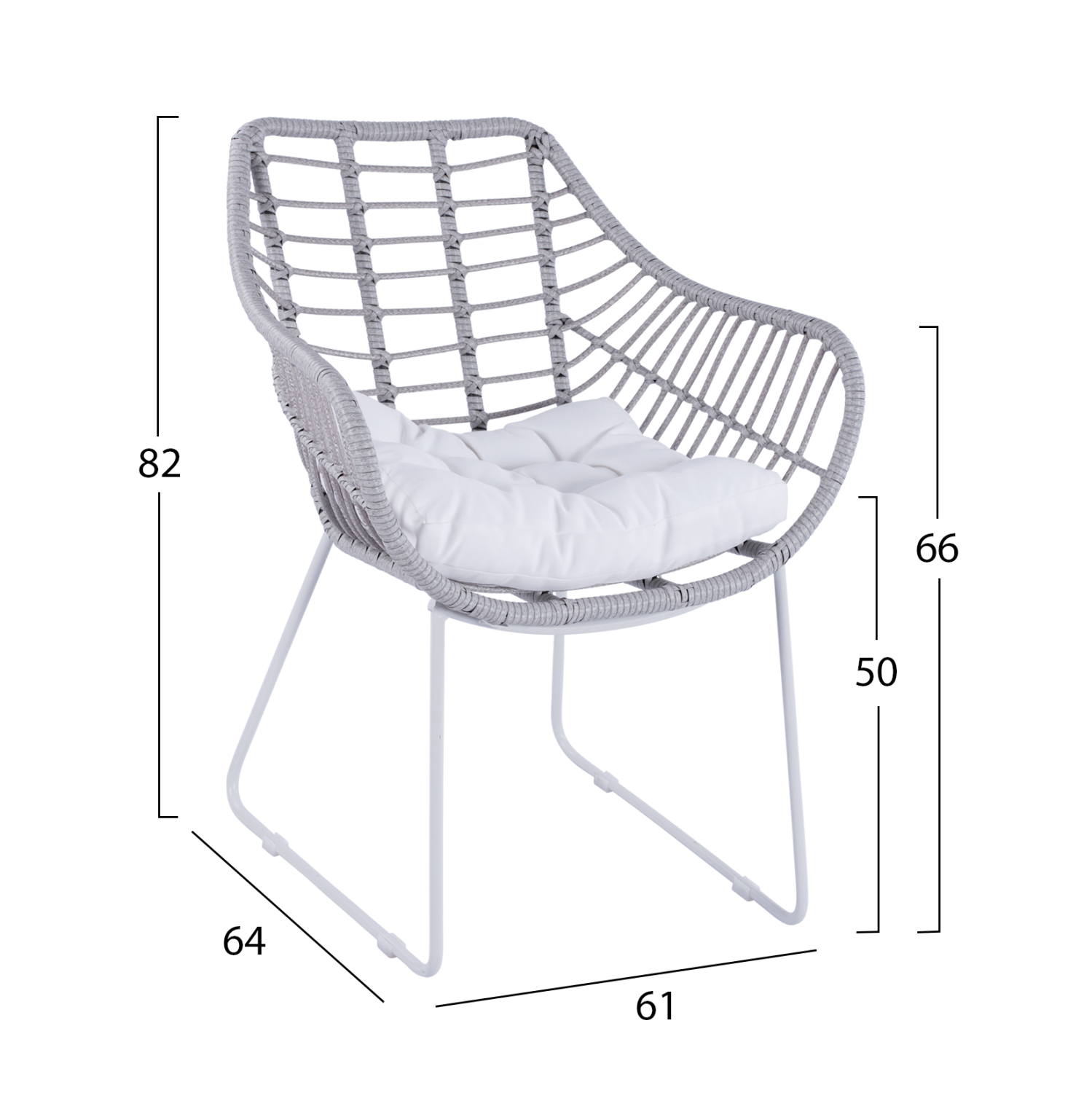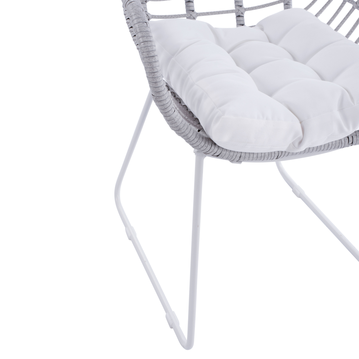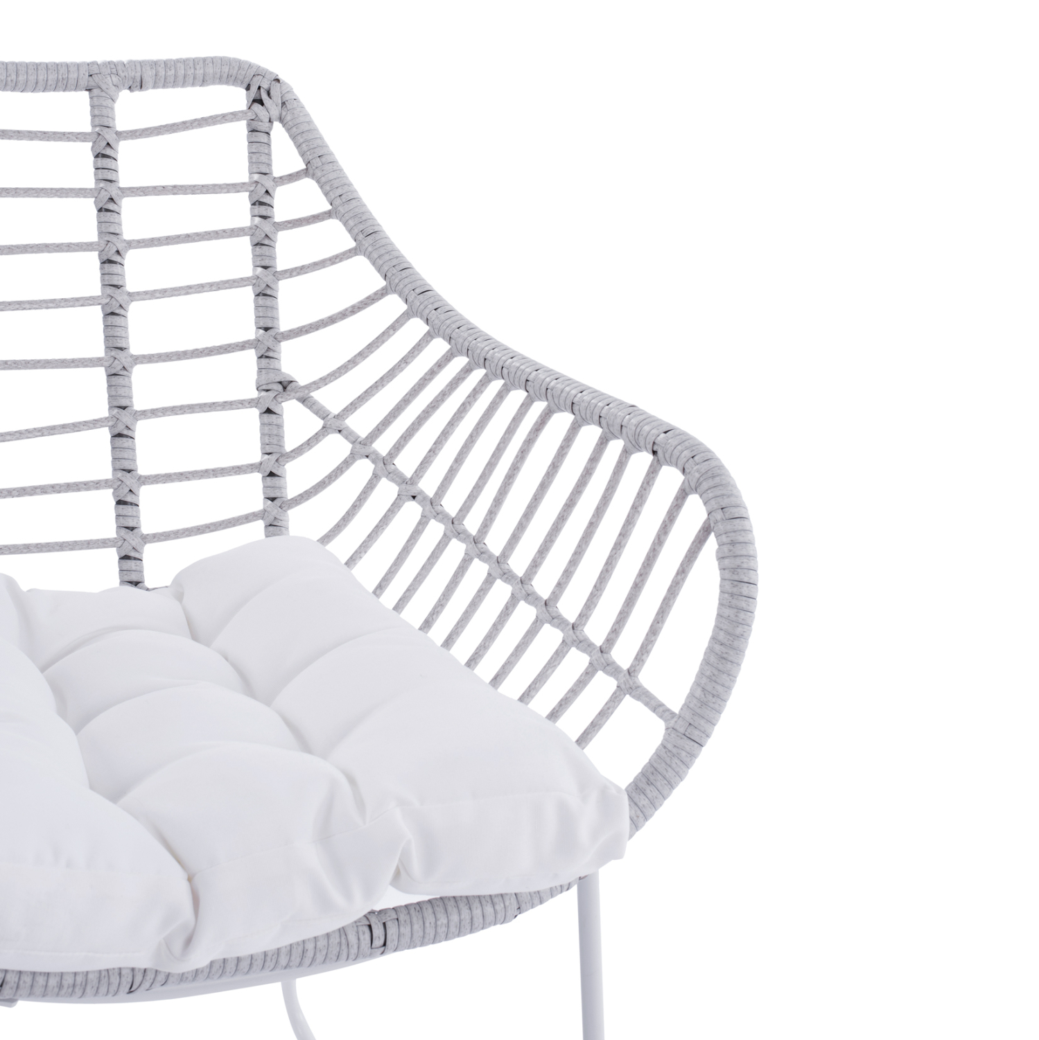 Μοντέρνα πολυθρόνα εξωτερικού χώρου, κατασκευασμένη από μεταλλικό σκελετό σε άσπρη ματ απόχρωση και επενδυμένη με πλεκτό wicker σε γκρι απόχρωση.