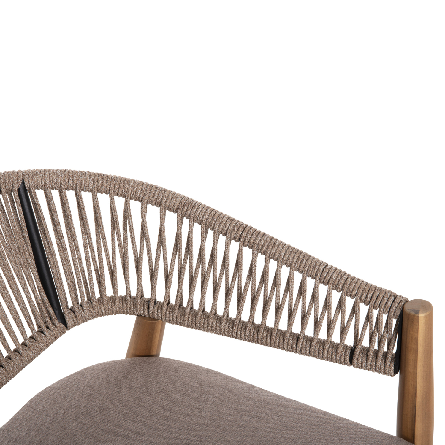 Η πολυθρόνα τραπεζαρίας εξωτερικού χώρου NAVAN συνδυάζει αρμονικά διαφορετικά υλικά κατασκευής. Τα πόδια είναι από ξύλο ακακίας στο ΦΥΣΙΚΟ του χρώμα, ενώ ο σκελετός της πλάτης είναι μεταλλικός με πλέξη από nylon σχοινί σε ΜΠΕΖ χρώμα. Το κάθισμα διαθέτει μαξιλάρι με πολυεστερικό ύφασμα επίσης σε ΜΠΕΖ χρώμα. Οι σχεδιαστικές γραμμές είναι κομψές και με γνώμονα την άνεση του χρήστη και θα αποτελέσει το κέντρο ενδιαφέροντος οπουδήποτε και αν τοποθετηθεί, ιδιαίτερα όμως αν συνδυαστεί με το ανάλογο τραπέζι.