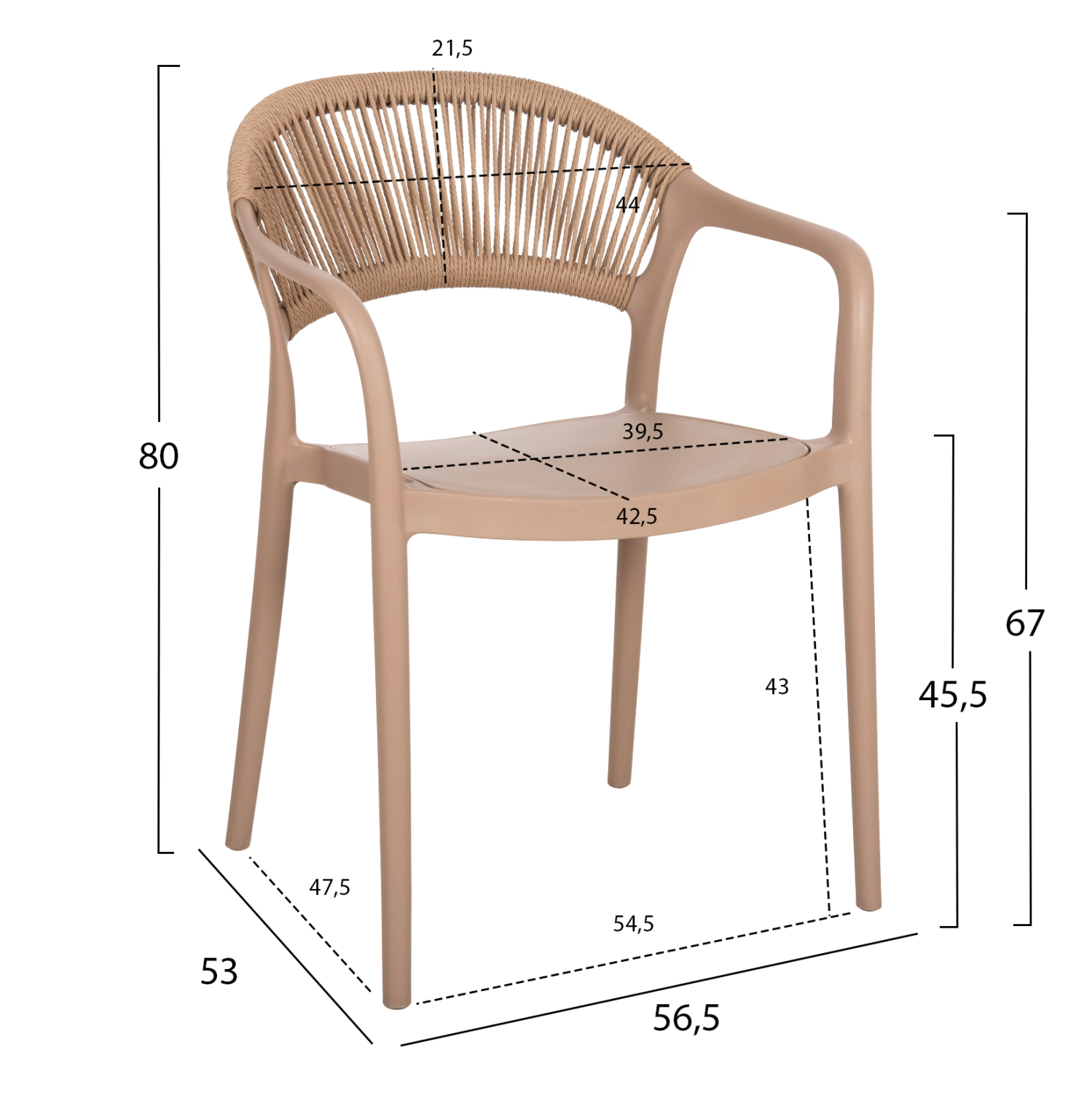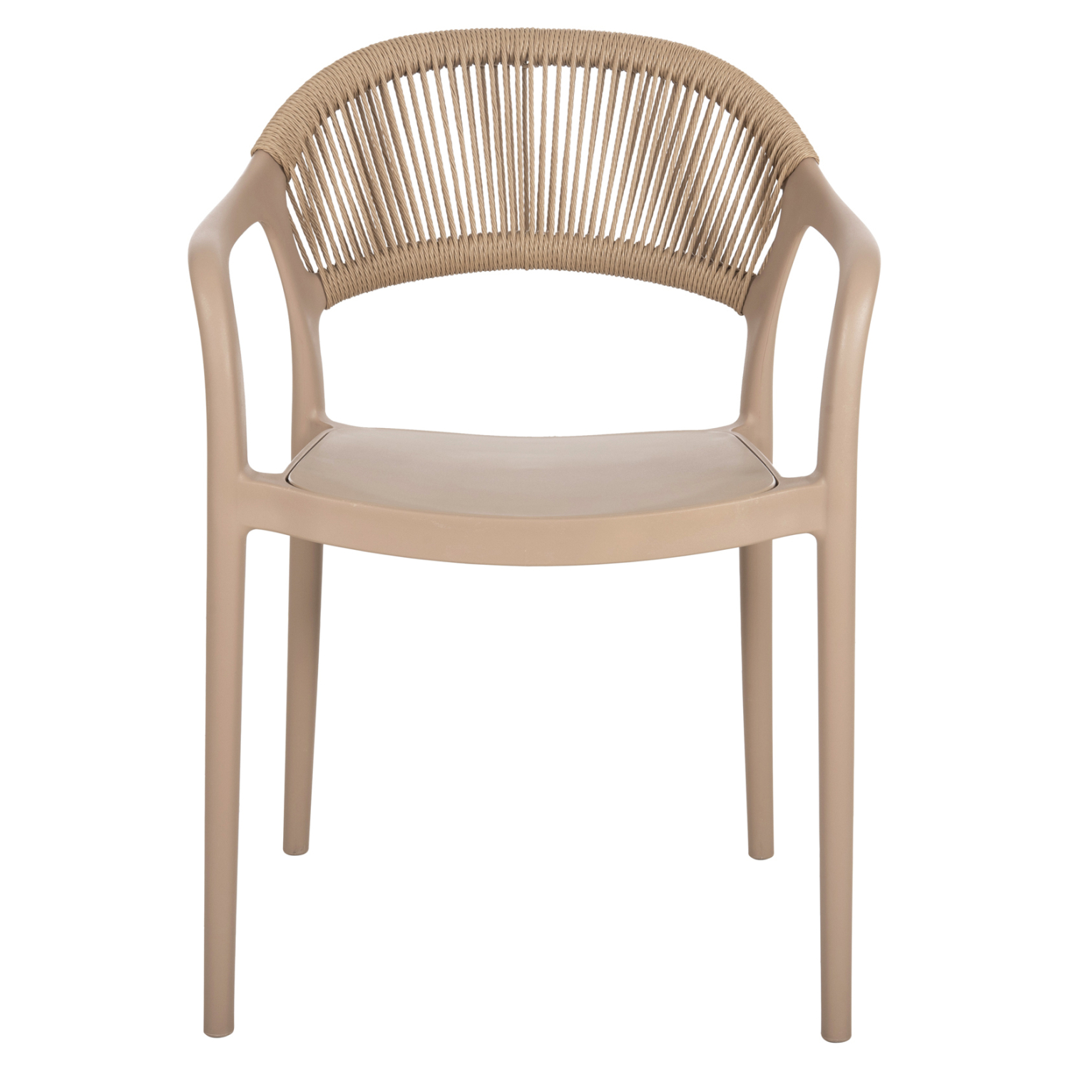 Η πολυθρόνα EVA έχει όλα όσα θα θέλατε από ένα τέτοιο έπιπλο. Όλη η πολυθρόνα είναι από μονοκόμματο πολυπροπυλένιο σε ΚΑΠΟΥΤΣΙΝΟ χρώμα με ελαφρώς κυρτή πλάτη επενδυμένη με συνθετικό σχοινί σε ΜΠΕΖ χρώμα, και πρακτικά μπράτσα. Όλη η κατασκευή είναι ελαφριά και άνετη, και θα γίνει το αγαπημένο κάθισμα σε όποιο χώρο κι αν τοποθετηθεί χάρη στην πρακτικότητά του. Ιδανική επιλογή και για επαγγελματική χρήση, όπως σε catering κτλ., επειδή είναι στοιβαζόμενη.