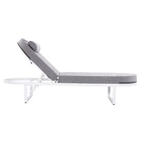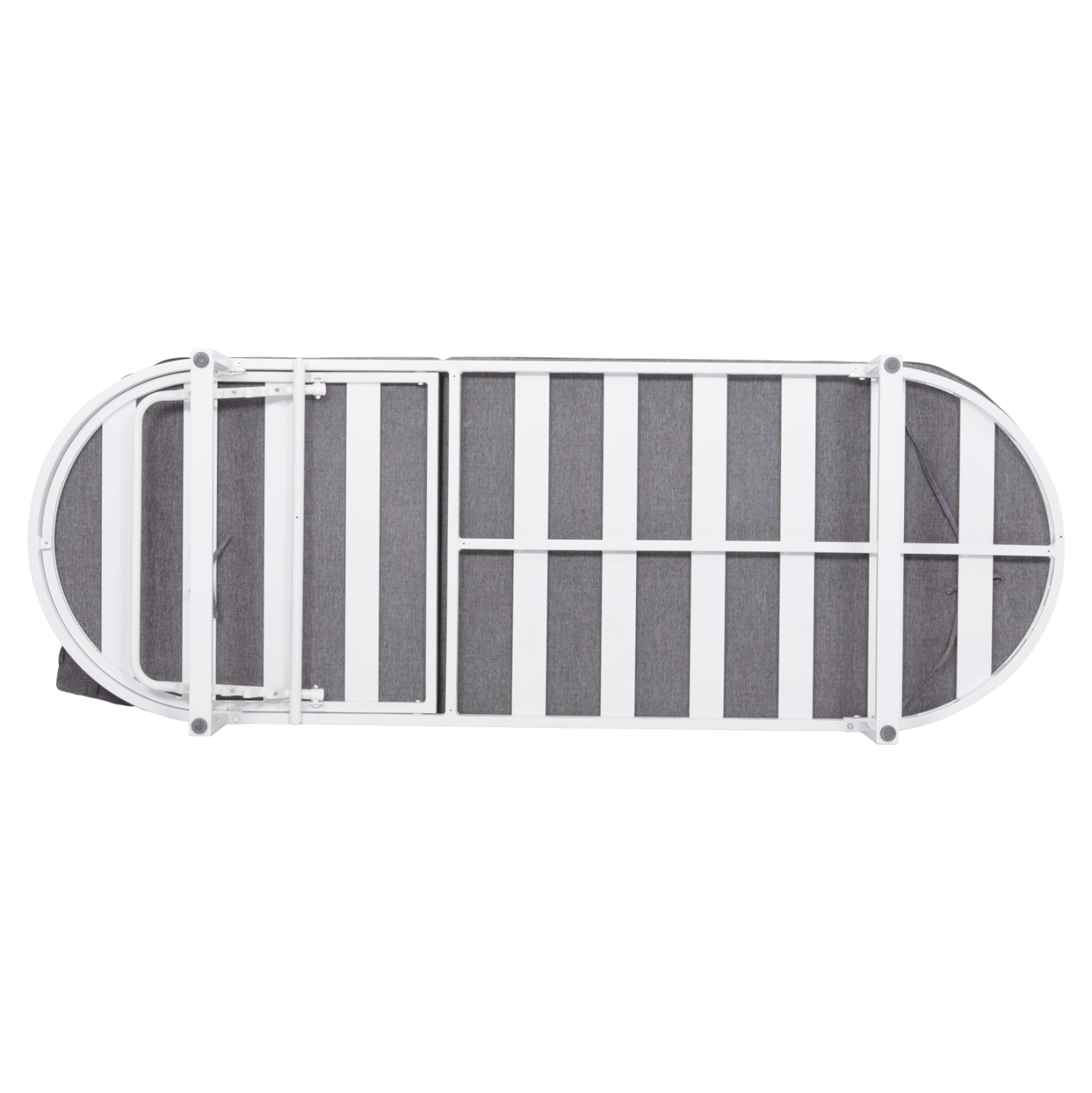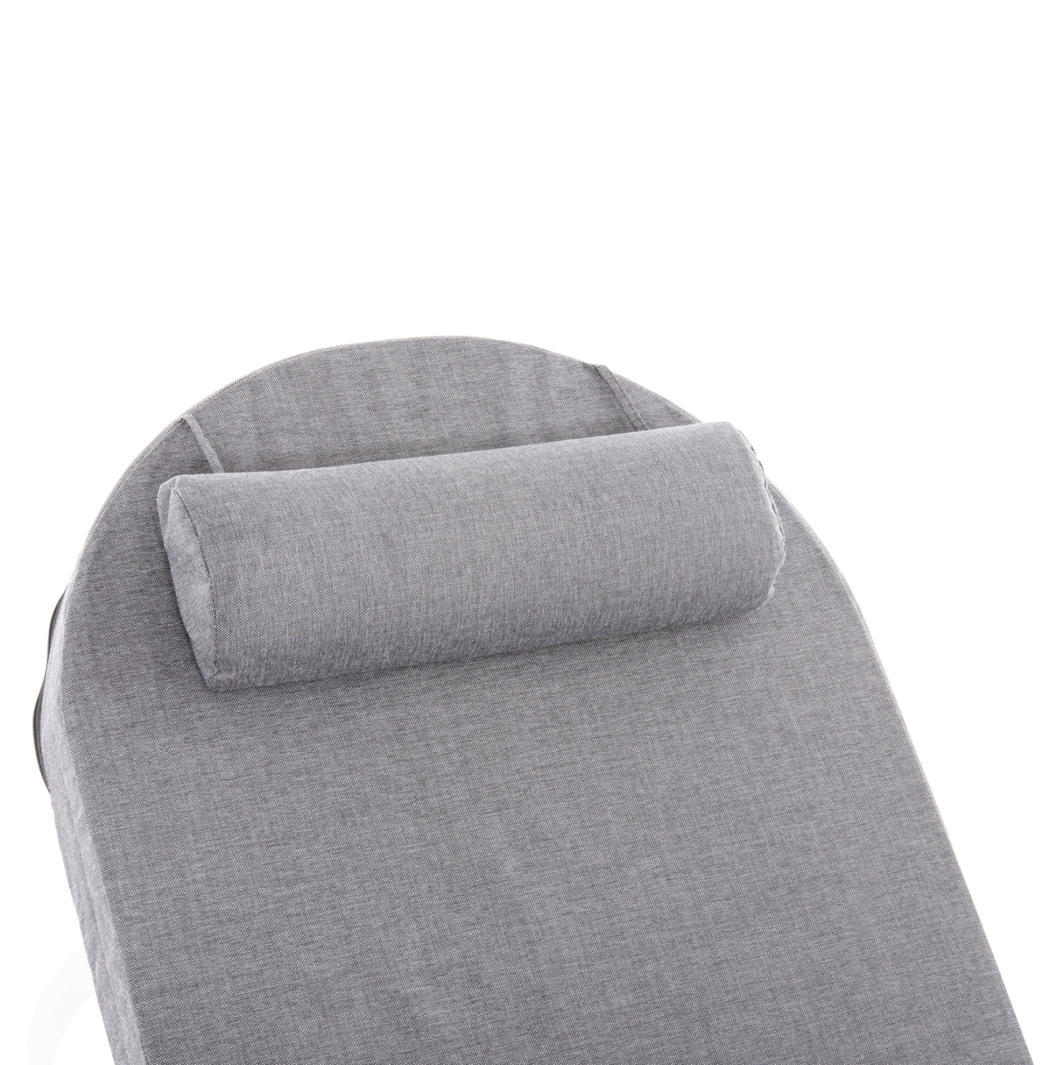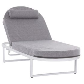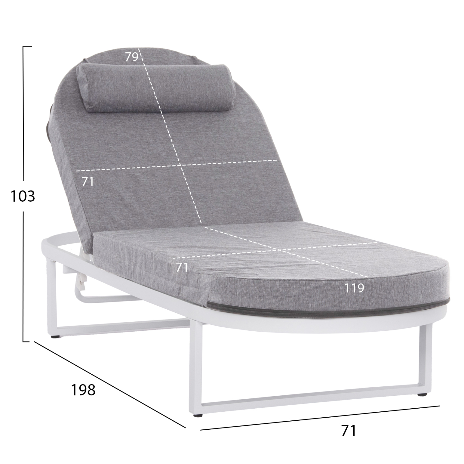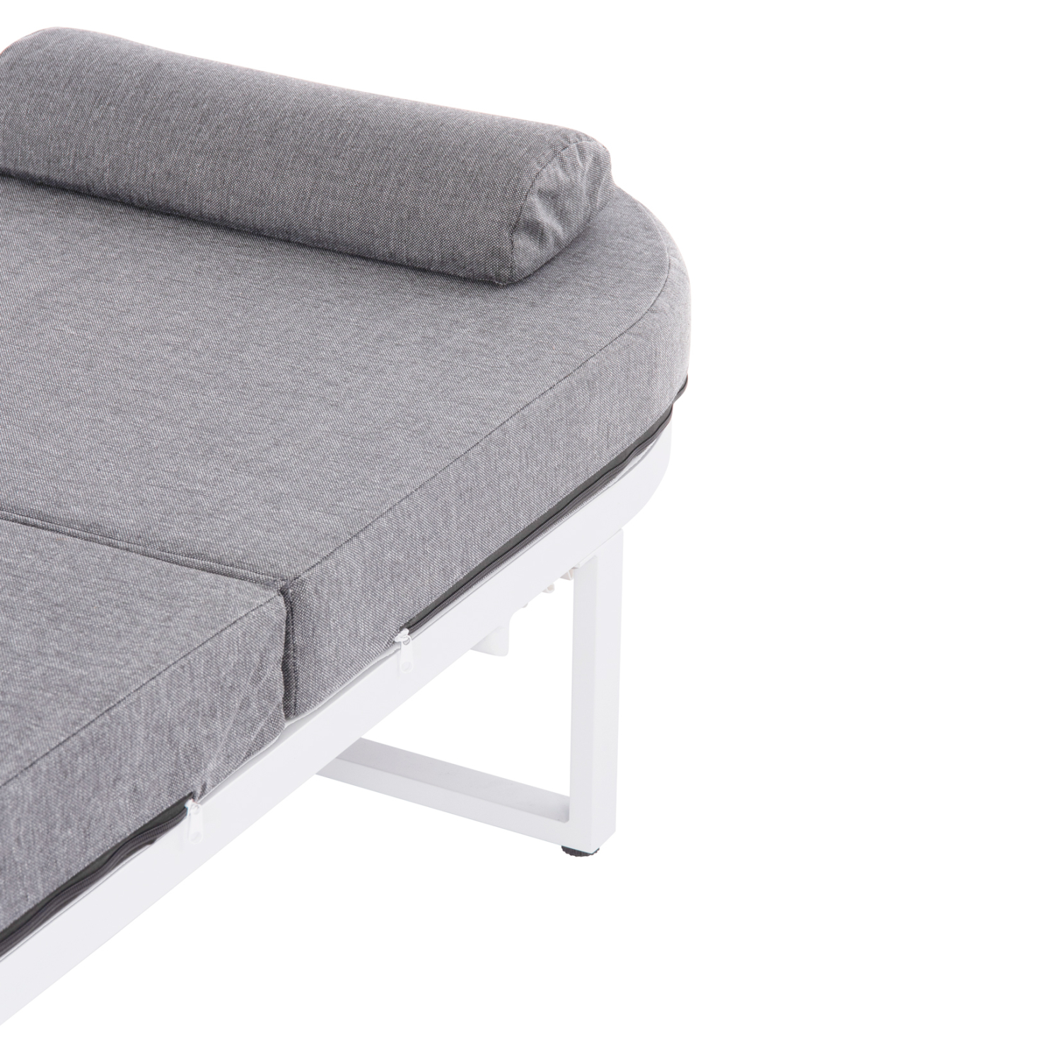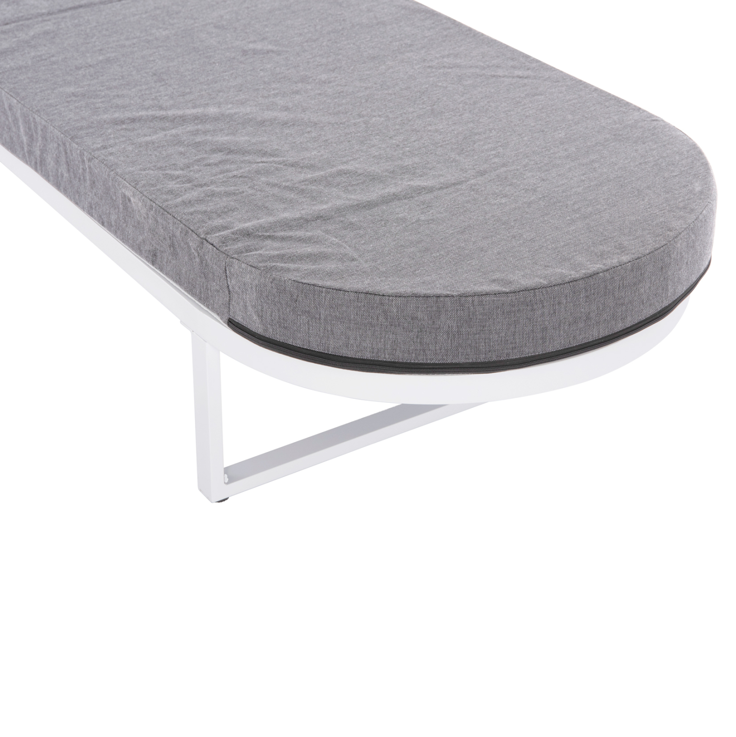 Η επαγγελματική ξαπλώστρα παραλίας MALLOW σε ΛΕΥΚΟ χρώμα είναι στιβαρή και πολυτελής. Είναι κατασκευασμένη από αλουμίνιο και γαλβανιζέ μέταλλο στο εσωτερικό του σκελετού για έξτρα ανθεκτικότητα, και διαθέτει ψηλό μαξιλάρι(στρώμα) με προσκέφαλο σε ΓΚΡΙ χρώμα. Σχεδιαστικά οι «γραμμές» της είναι ξεκάθαρες σε ΟΒΑΛ υλοποίηση. Η σκαλιέρα έχει 5 επίπεδα (μαζί με την flat).