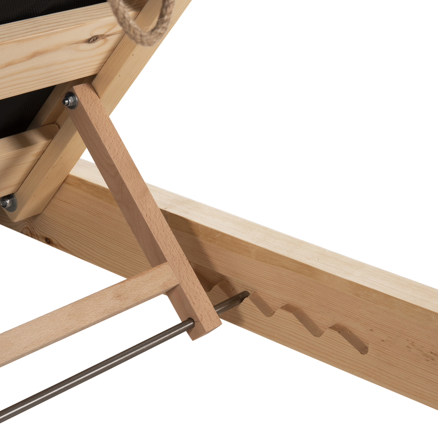 Ολόκληρη η ξαπλώστρα έχει κατασκευαστεί από ξύλο πεύκου με εμποτισμό και επιπλέον στρώση με βερνίκι νερού. Το πεύκο είναι ένα μαλακό, λευκό ή ανοιχτό κίτρινο ξύλο το οποίο είναι ελαφρύ σε βάρος με ευθύγραμμα νερά ξύλου. Αντέχει στη συρρίκνωση, διόγκωση και κάμψη. Ο εμποτισμός υπό την ευρεία έννοια είναι ο χρωματισμός του ξύλου (συνήθως βερνίκια) με την μέθοδο της εμβάπτισης.