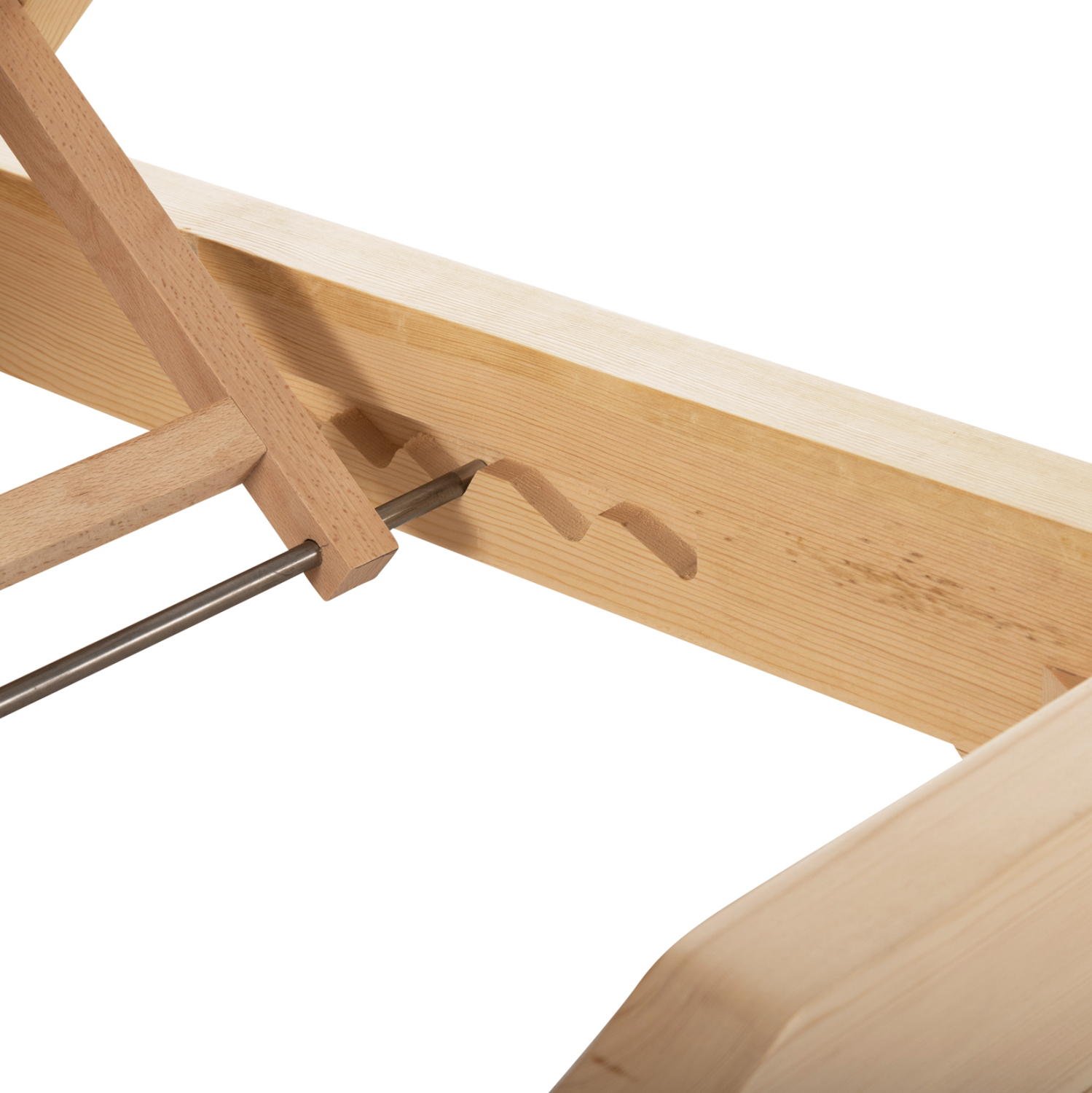 Ολόκληρη η ξαπλώστρα έχει κατασκευαστεί από ξύλο πεύκου με εμποτισμό και επιπλέον στρώση με βερνίκι νερού. Το πεύκο είναι ένα μαλακό, λευκό ή ανοιχτό κίτρινο ξύλο το οποίο είναι ελαφρύ σε βάρος με ευθύγραμμα νερά ξύλου. Αντέχει στη συρρίκνωση, διόγκωση και κάμψη. Ο εμποτισμός υπό την ευρεία έννοια είναι ο χρωματισμός του ξύλου (συνήθως βερνίκια) με την μέθοδο της εμβάπτισης.