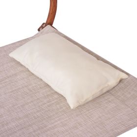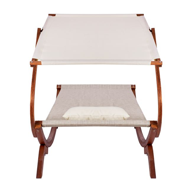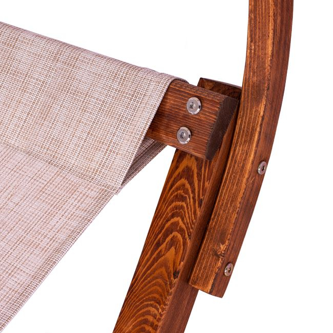 Κατασκευασμένη από ξύλο πεύκου σε καρυδί απόχρωση με textilene 2x2 και προσκέφαλο μπεζ.