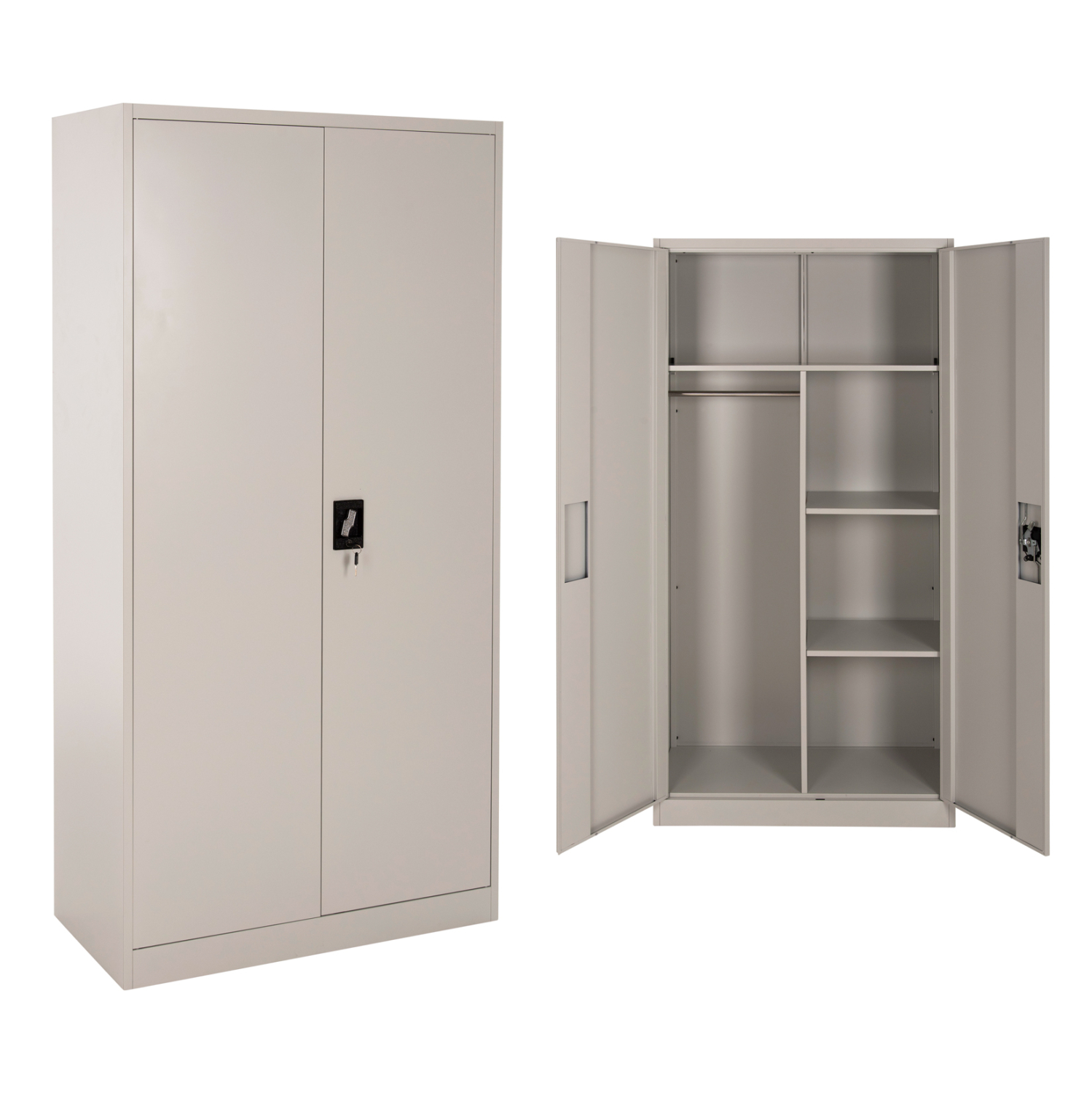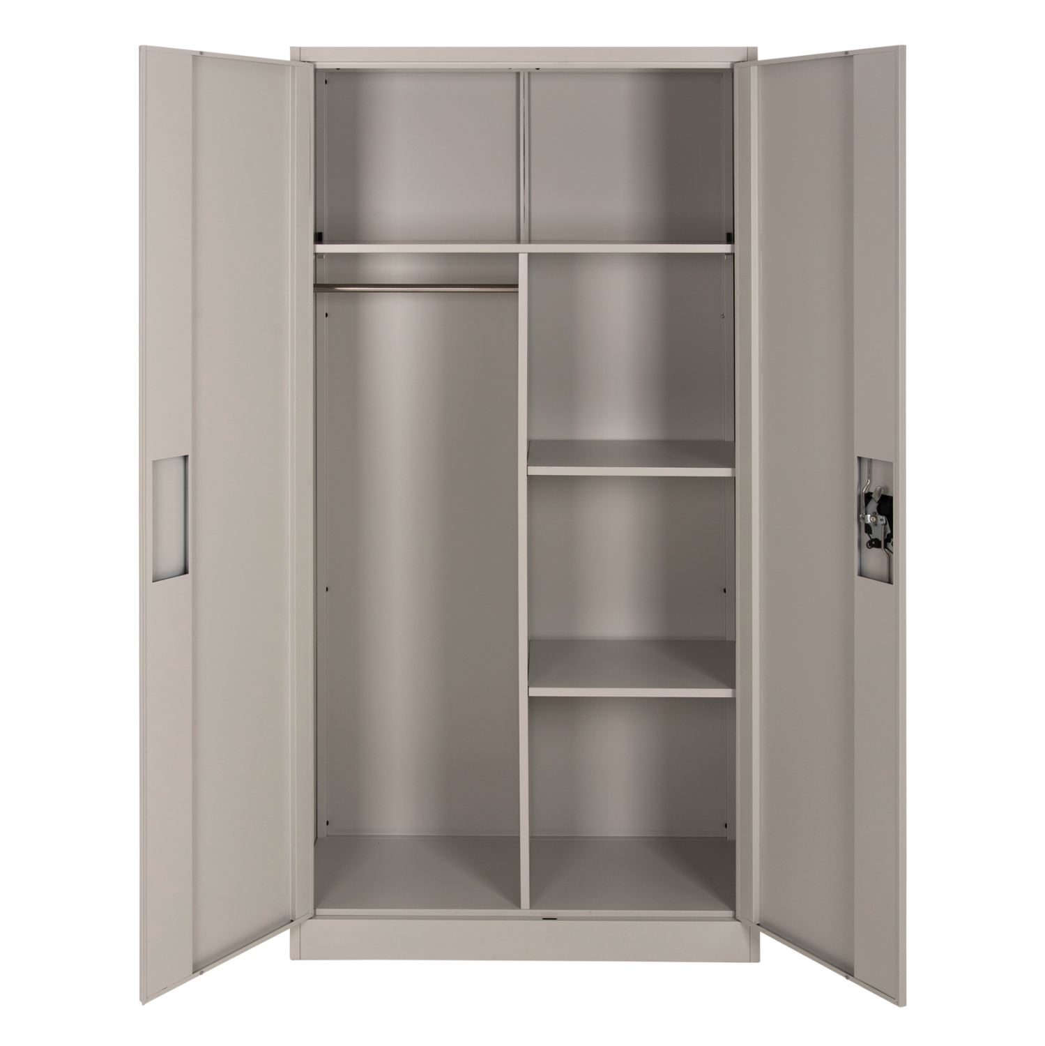 Η CLOD είναι μια πρακτικότατη μεταλλική ντουλάπα που έχει φτιαχτεί με γνώμονα την χωρητικότητα και την ανθεκτικότητα. Είναι δίφυλλη με τις δύο πόρτες να κλείνουν ακριβώς στην μέση της κατασκευής, ενώ το εσωτερικό είναι χωρισμένο σε 3 κύριους χώρους με μεταλλικό χώρισμα σε σχήμα Τ. Το επάνω μέρος είναι ενιαίο σαν παταράκι, ενώ η μία πλευρά διαθέτει μεταλλική μπάρα για κρέμαση αντικειμένων και η άλλη διαθέτει 2 ράφια που δημιουργούν 3 επίπεδα αποθήκευσης. Οι πόρτες διαθέτουν κλειδαριά που κλειδώνει με κλειδί, ενώ το χρώμα της ντουλάπας είναι πολύ ανοιχτό γκρι.