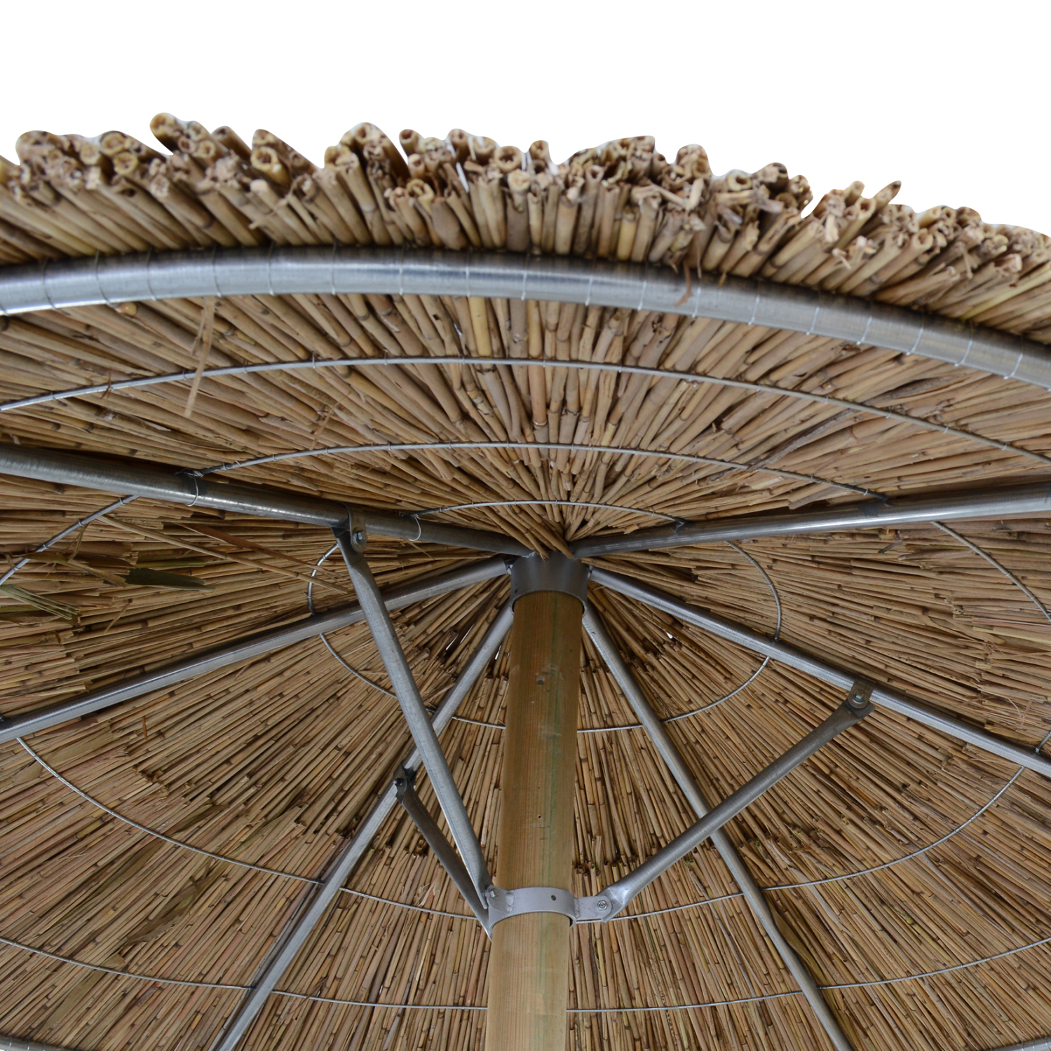 Ομπρέλα ψάθινη Φ250εκ. ενισχυμένη με 5 δεσίματα, 6 ακτίνες και 3 αντηρίδες και δαχτυλίδι.