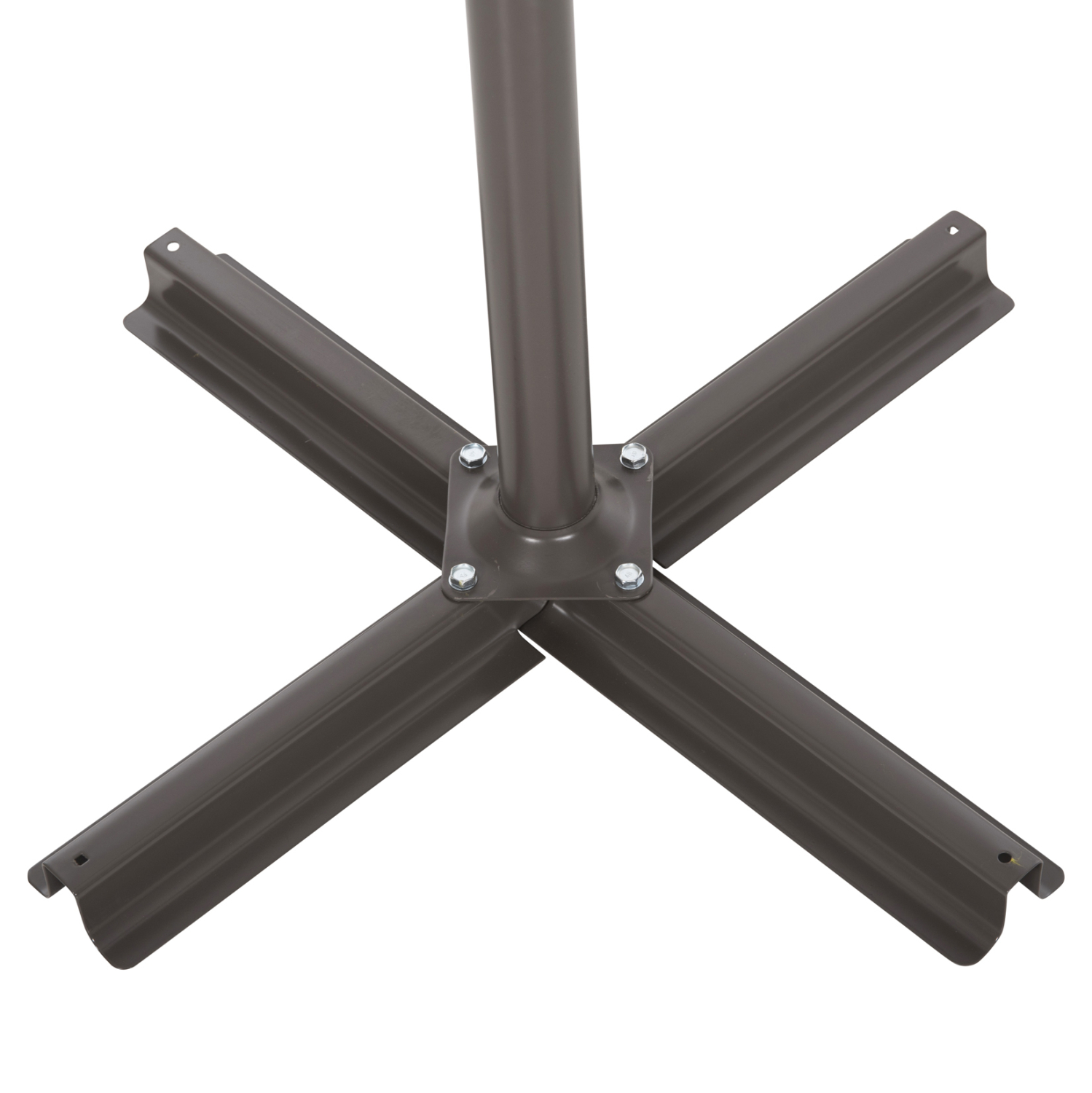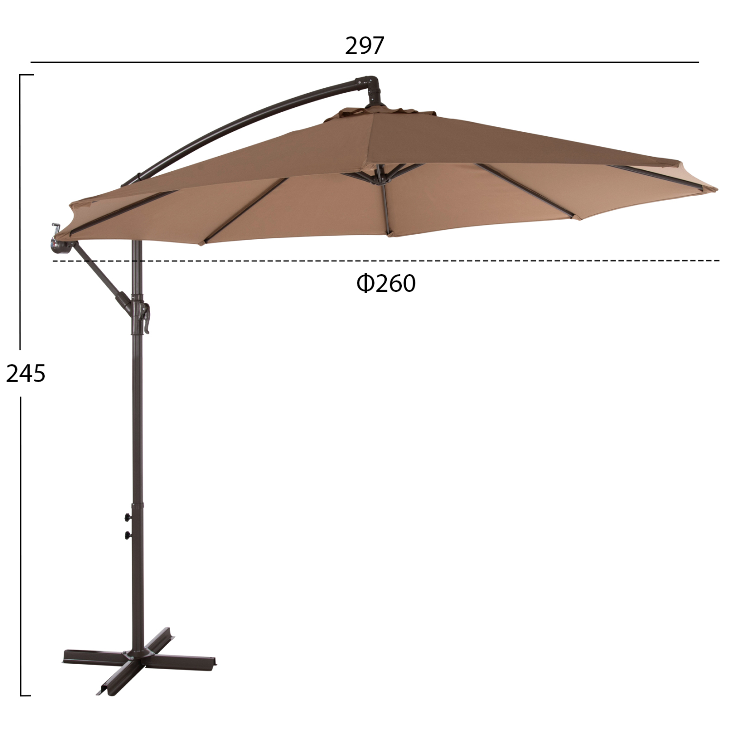 Η ομπρέλα GELDORF είναι μια πολυτελής πρόταση για κάθε εξωτερικό χώρο. Ο σκελετός είναι μεταλλικός σε σκούρο ΚΑΦΕ χρώμα, ενώ το μεγάλο σκίαστρό της είναι πολυεστερικό σε ΚΑΦΕ χρώμα. Το χαρακτηριστικό της ομπρέλας είναι ότι παρά το επιβλητικό της μέγεθος, ανοίγει πανεύκολα με μηχανισμό τροχαλίας στο πτυσσόμενο μπράτσο από το οποίο κρέμεται το σκίαστρο. Η βάση είναι 4-νυχη και, φυσικά, θα πρέπει να βιδώνεται στο έδαφος για να συγκρατεί το βάρος της ομπρέλας.