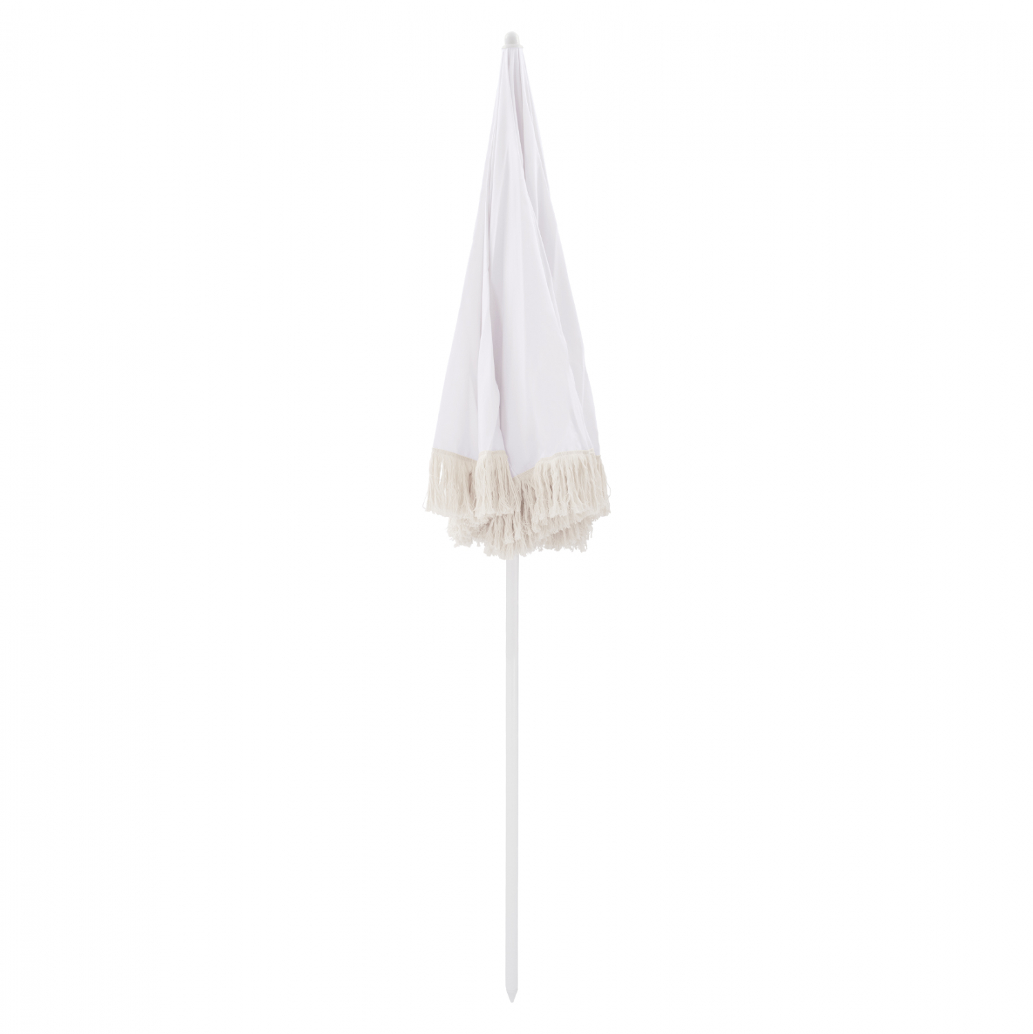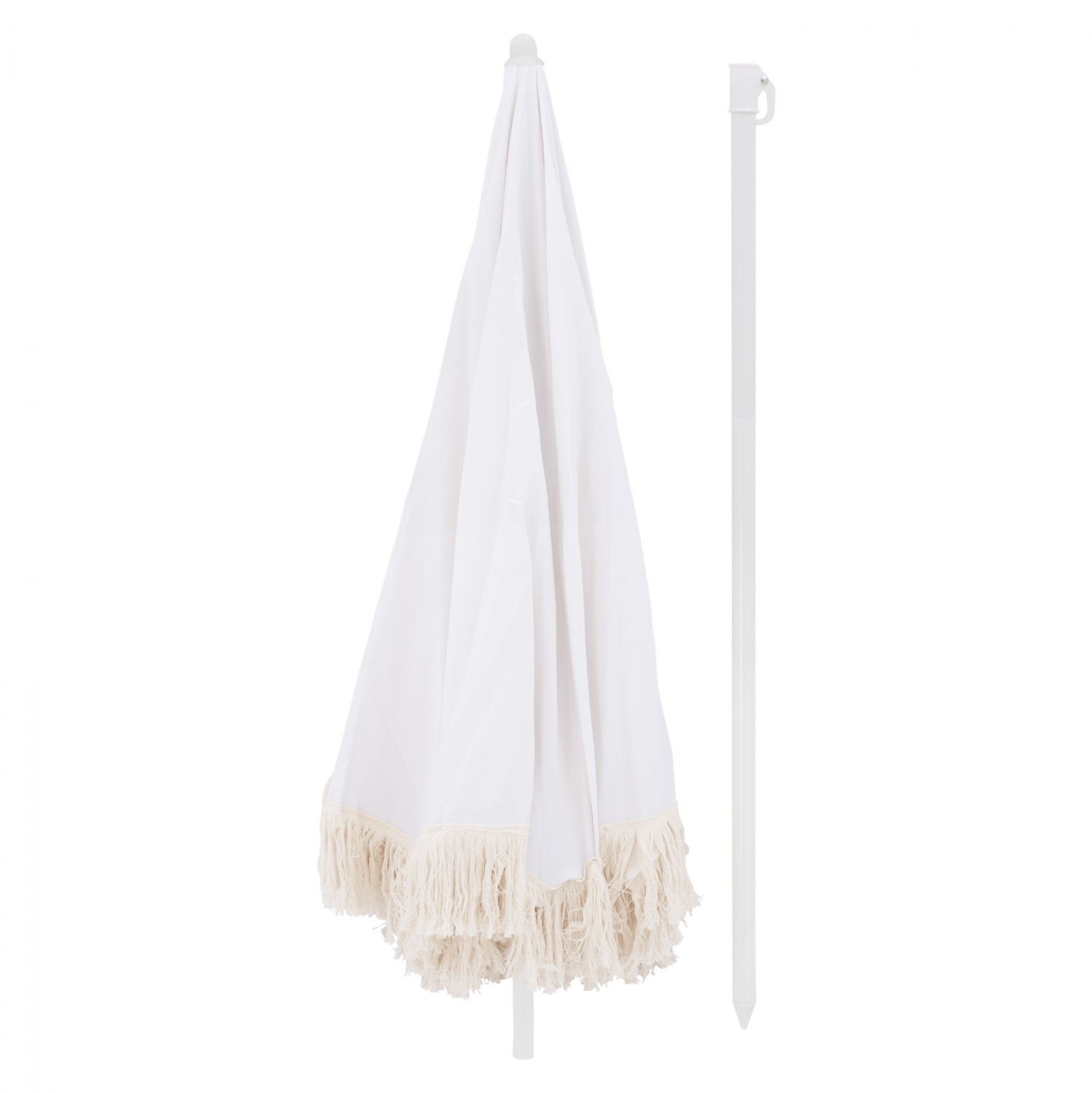 Ομπρέλα θαλάσσης στρογγυλή και flaps από κρόσια μακραμέ, σε μπεζ απόχρωση.