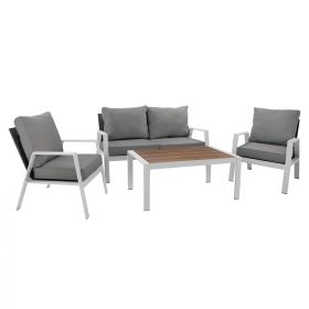 Ένα τραπέζι με επιφάνεια polywood σε απόχρωση ξύλου και αλουμινένιο σκελετό σκούρου λευκού χρώματος.