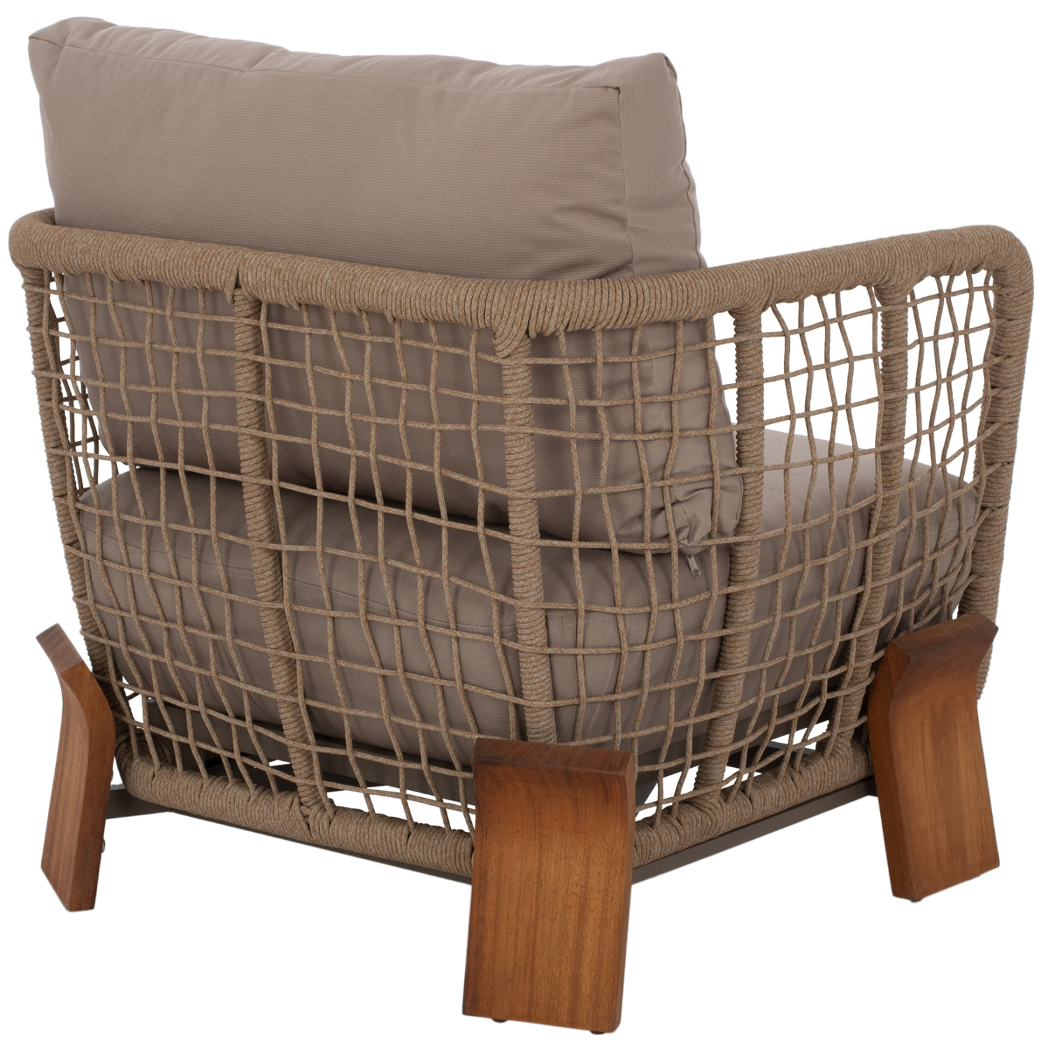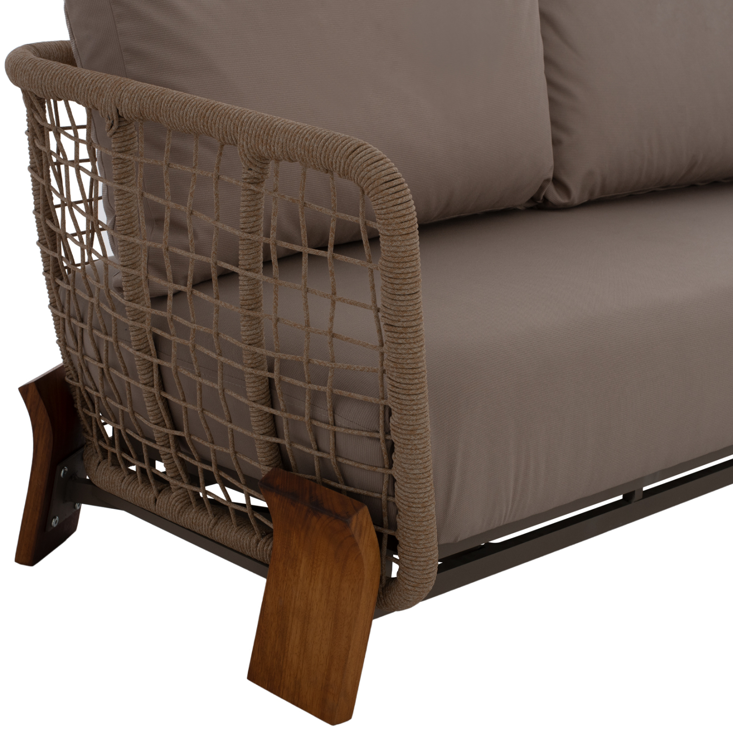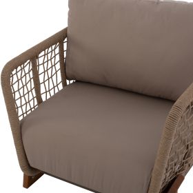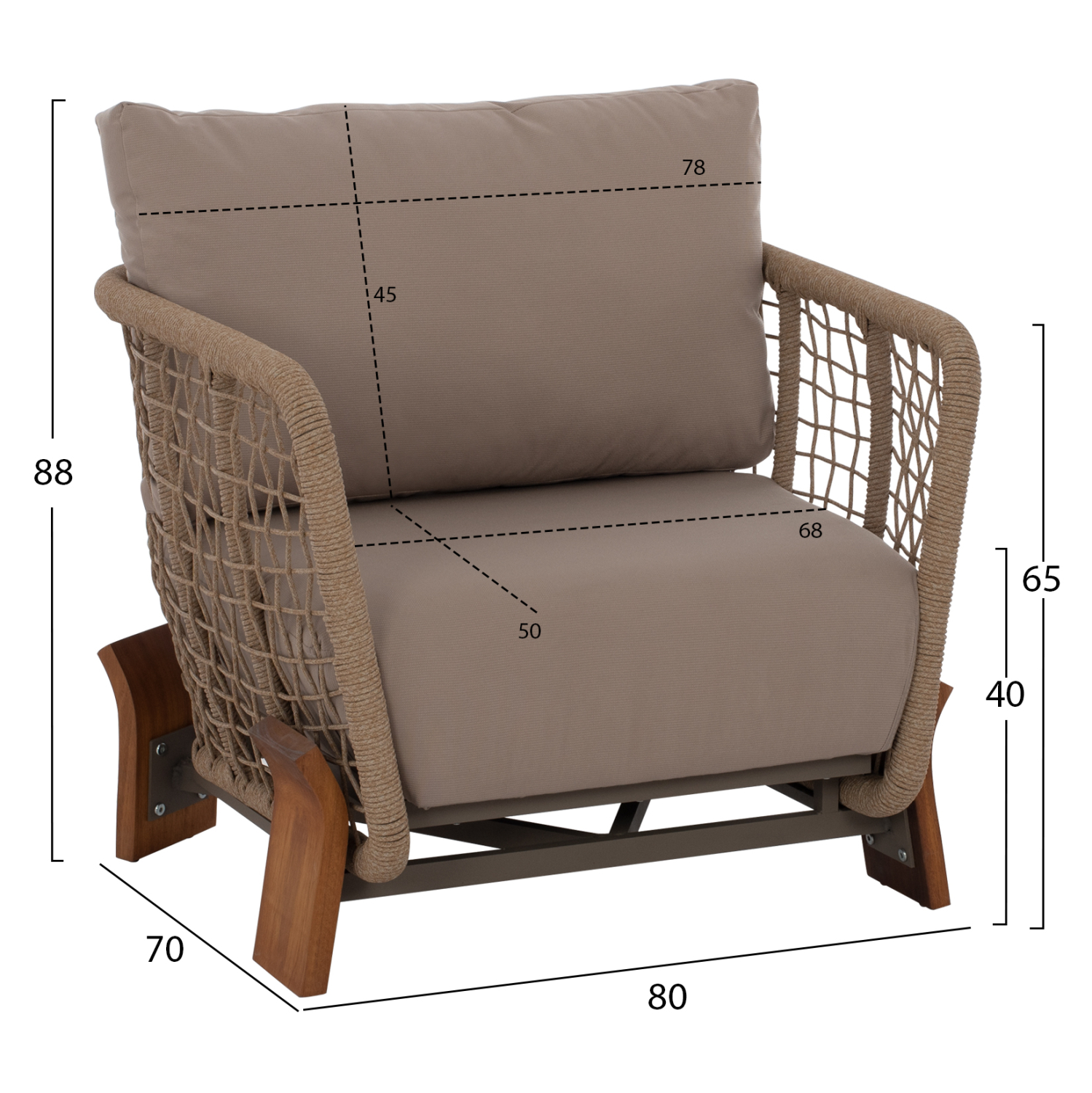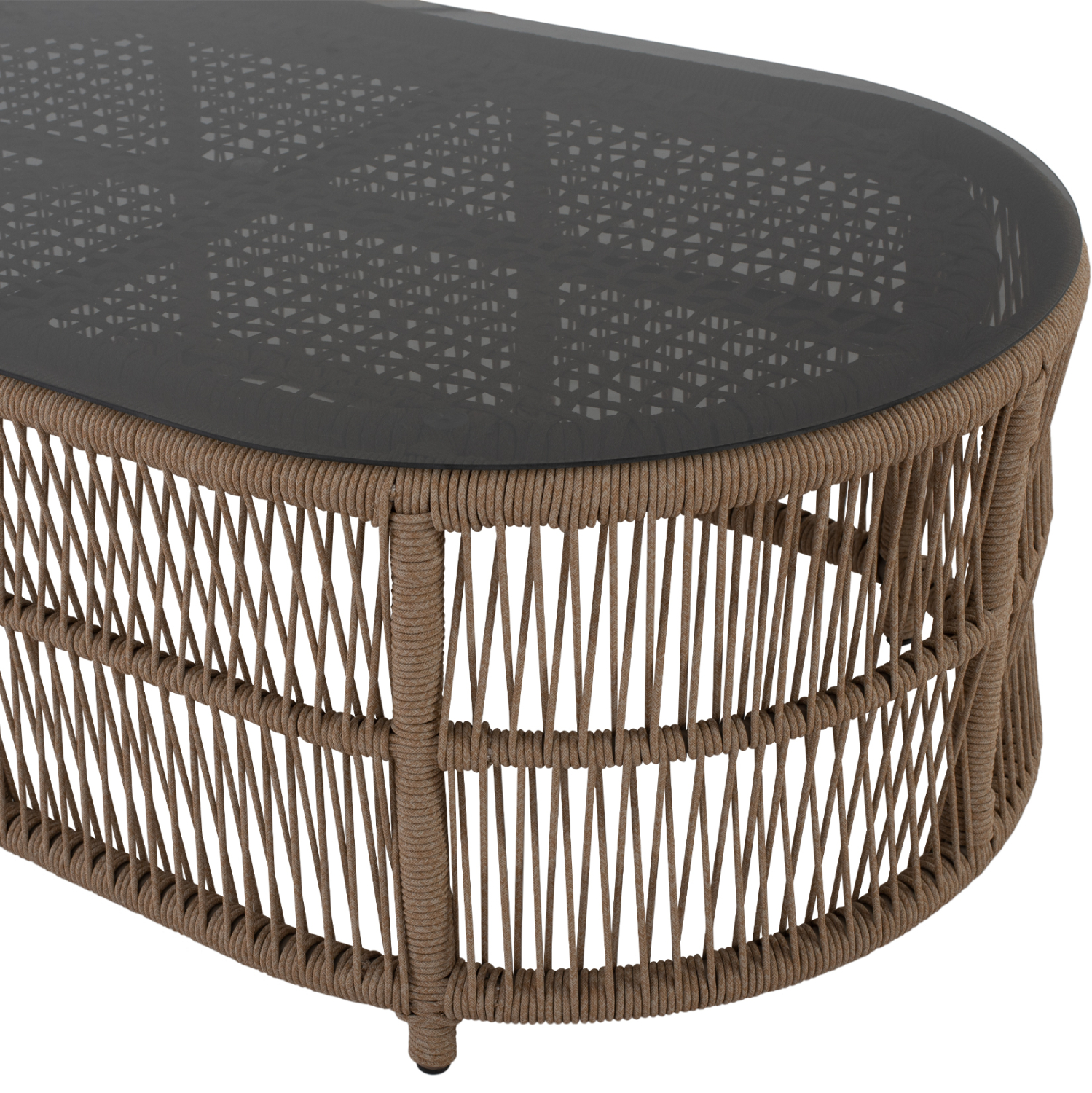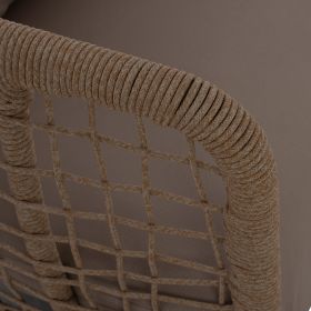 ΗΜ5884.01---Σας παρουσιάζουμε το εντυπωσιακό, νέο και χειροποίητο σετ εξωτερικού χώρου με κυρίαρχο χρώμα το ΜΠΕΖ. Αποτελείται από ένα τραπεζάκι, 2 πολυθρόνες και έναν 3-θέσιο καναπέ. Ένα σετ που θα το λατρέψετε με την πρώτη ματιά. Το όμορφο τραπέζι έχει σχήμα οβάλ και έχει επιφάνεια από γυαλί ασφαλείας, ενώ η βάση του είναι ολόκληρη με σχοινί δεμένο επάνω στον αλουμινένιο σκελετό του. Οι πολυθρόνες είναι εξίσου εντυπωσιακές. Τα πόδια τους είναι 4 κομμάτια από μασίφ ξύλο ΙΡΟΚΟ ενώ το σχοινί επάνω στον αλουμινένιο σκελετό προσδίδει ομοιομορφία με το τραπέζι. Το κάθισμά τους είναι φαρδύ ενώ σε συνδυασμό με τα αναπαυτικά μαξιλάρια τόσο στο κάθισμα όσο και στην πλάτη προσφέρουν ξεκούραση και άνεση. Ο 3-θέσιος καναπές σε παρόμοιο design είναι και αυτός εντυπωσιακός και συμπληρώνει το σετ με τον καλύτερο δυνατό τρόπο. Τα μαξιλάρια σε όλο το σετ είναι επενδυμένα με ποιοτικό ύφασμα σε ΜΠΕΖ χρώμα και διαθέτουν γέμισμα με μέτριας σκληρότητας αφρώδη υλικά για την μεγαλύτερη δυνατή άνεση. Τι άλλο να ζητήσει κανείς για να αναβαθμίσει τον κήπο, το μπαλκόνι ή την αυλή του;