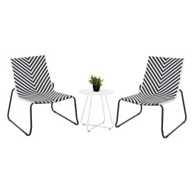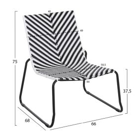 Το PONY είναι ένα lounge σετ (σαλονάκι) 3τμχ εξωτερικού χώρου, που αποτελείται από 2 ΜΑΥΡΕΣ μεταλλικές καρέκλες με πλέξη (wicker) από συνθετικό Rattan σε ασπρόμαυρο χρώμα, κι ένα στρογγυλό ΛΕΥΚΟ μεταλλικό τραπεζάκι.