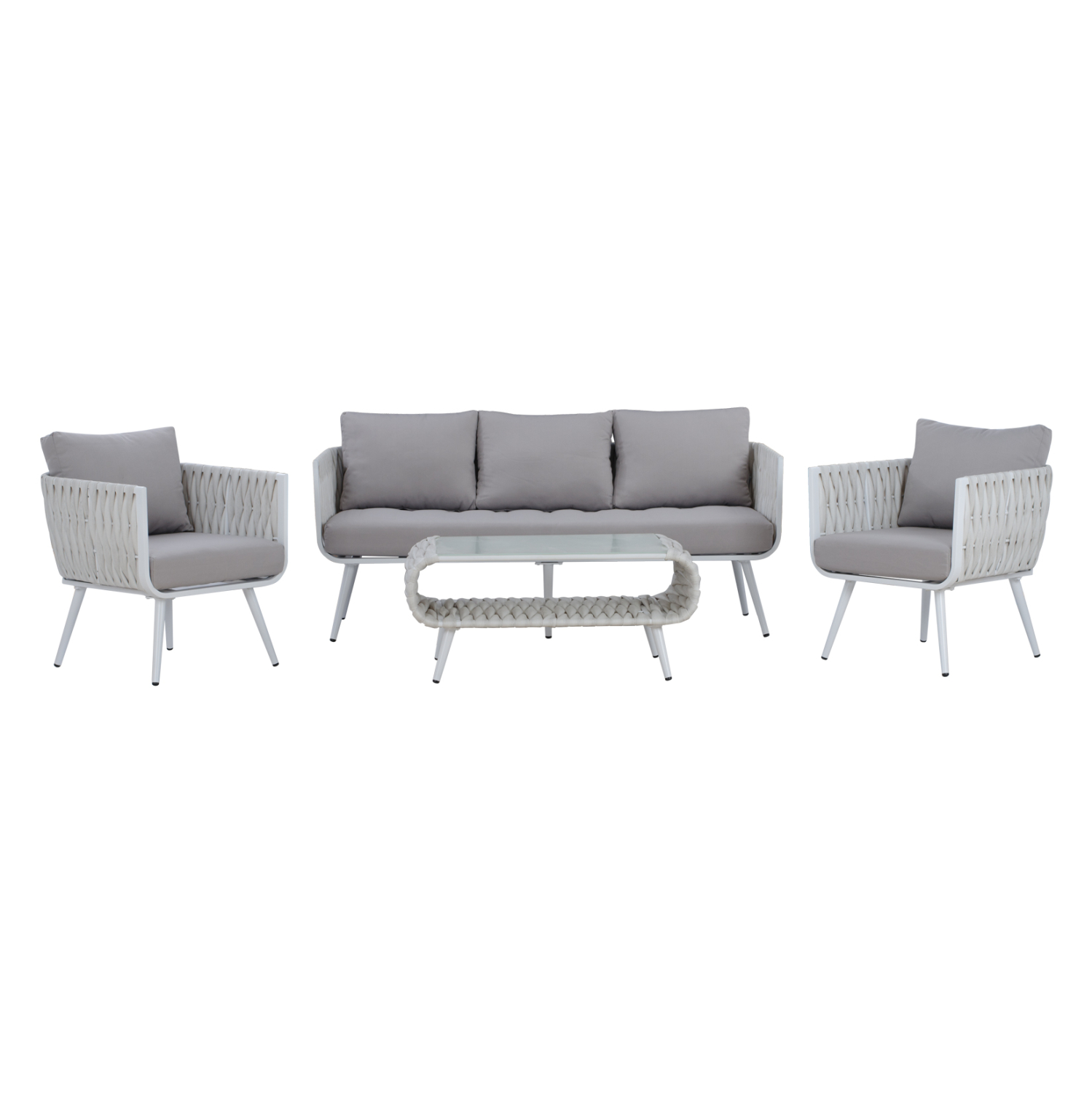 Το VARNAMO είναι ένα όμορφο σετ σαλονιού εξωτερικού χώρου με τραπεζάκι, 2 πολυθρόνες και 1 τριθέσιο καναπέ. Τα πόδια είναι αλουμινίου σε ΛΕΥΚΟ ενώ η επένδυση έχει γίνει με συνθετικό σχοινί strap σε ΑΝΟΙΧΤΟ ΓΚΡΙ χρώμα. Το design τους είναι πανέμορφο στην όψη ενώ η στιβαρότητά τους είναι εμφανής. Τα αναπαυτικά μαξιλάρια τόσο στο κάθισμα όσο και στην πλάτη διαθέτουν ανθεκτικά πολυεστερικά καλύμματα με φερμουάρ για εύκολη αφαίρεση και πλύσιμο. Το τραπεζάκι είναι ίδιας αισθητικής και διαθέτει επιφάνεια από γυαλί ασφαλείας. Ιδανικό τόσο για το σπίτι, όσο και για επαγγελματικούς χώρους.