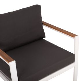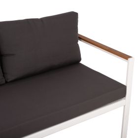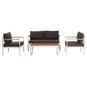 Ένα καναπέ διθέσιο, δύο πολυθρόνες με υφασμάτινα μαξιλάρια και ένα τραπέζι αλουμινίου με επιφάνεια Polywood.