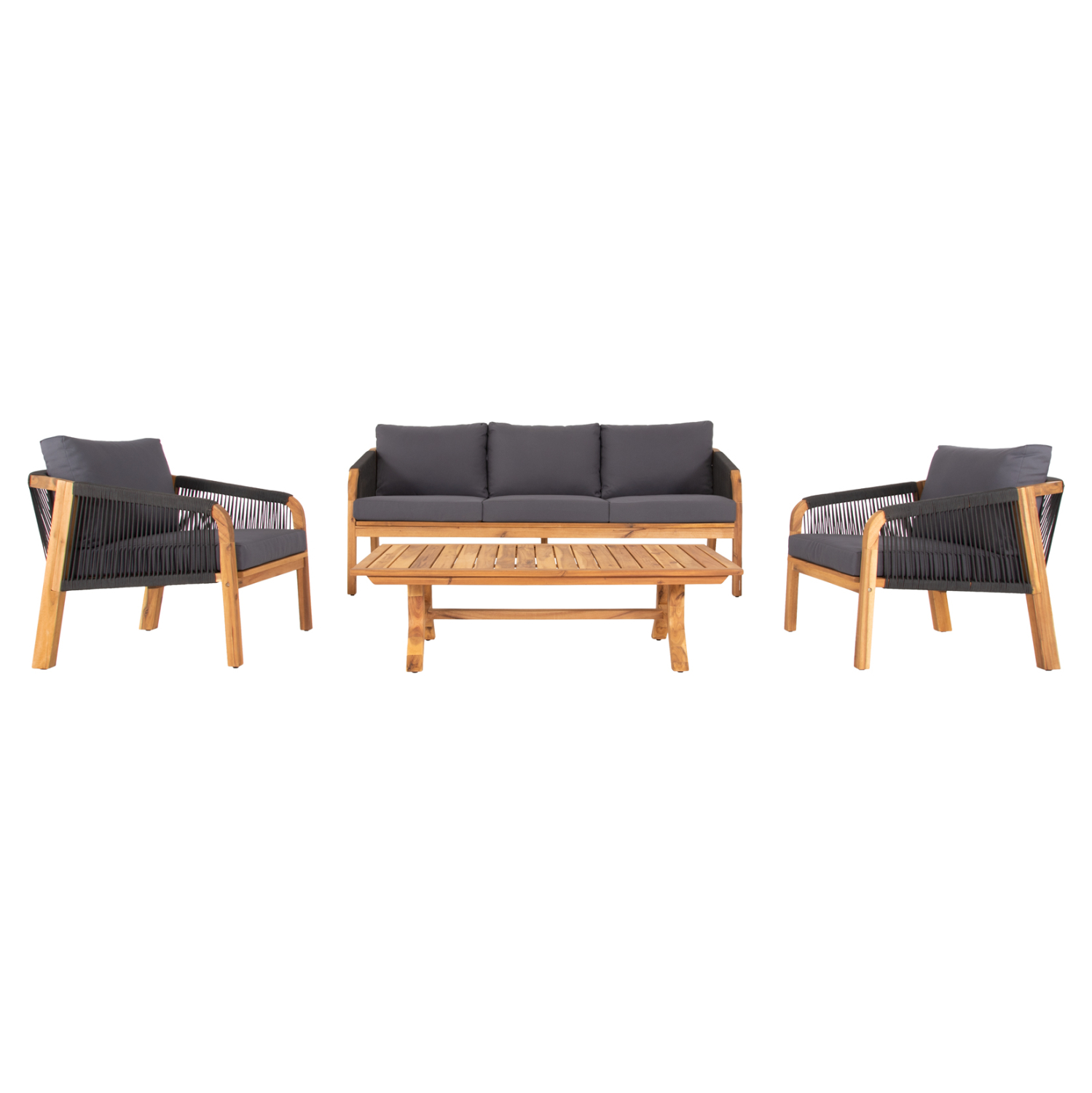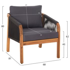 Σας παρουσιάζουμε το εντυπωσιακό και νέο σετ σαλονιού εξωτερικού χώρου ROSSWELL σε ΦΥΣΙΚΟ και ΑΝΘΡΑΚΙ χρώμα, με τραπεζάκι, 2 πολυθρόνες και 1 τριθέσιο καναπέ. Ένα σετ που θα το λατρέψετε με την πρώτη ματιά. Ο σκελετός σε όλο το σετ είναι από ποιοτικό ξύλο ακακίας επενδυμένο με ΑΝΘΡΑΚΙ σχοινί. Το design τους είναι πανέμορφο στην όψη ενώ η στιβαρότητά τους είναι εμφανής. Το κάθισμά στον καναπέ και τις πολυθρόνες είναι φαρδύ ενώ η πλάτη τους αγκαλιάζει το σώμα πράγμα που επιτείνει την άνεση που προσφέρουν, σε συνδυασμό με τα αναπαυτικά μαξιλάρια τόσο στο κάθισμα όσο και στην πλάτη. Ο τριθέσιος καναπές σε παρόμοιο design είναι, όμως, το πιο εντυπωσιακό κομμάτι αυτού του σετ με τις μεγάλες διαστάσεις του που τον καθιστούν το σημείο αναφοράς. Τα μαξιλάρια σε όλο το σετ είναι επενδυμένα με πολυεστερικό ύφασμα σε ΑΝΘΡΑΚΙ χρώμα και διαθέτουν γέμισμα με μέτριας σκληρότητας αφρώδη υλικά για την μεγαλύτερη δυνατή άνεση, αλλά και φερμουάρ. Τι άλλο να ζητήσει κανείς για να αναβαθμίσει τον εξωτερικό χώρο του;