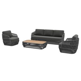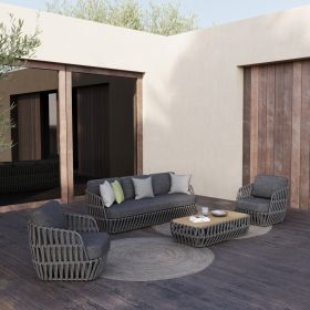Σας παρουσιάζουμε το εντυπωσιακό σετ εξωτερικού χώρου 4τμχ SABO σε ΣΚΟΥΡΟ ΓΚΡΙ χρώμα, με τραπεζάκι, 2 πολυθρόνες και 1 τριθέσιο καναπέ. Ένα σετ που ξεχωρίζει με την πρώτη ματιά. Ο σκελετός σε όλο το σετ είναι από αλουμίνιο επενδυμένο με ΣΚΟΥΡΟ ΓΚΡΙ P.E. σχοινί. Το όμορφο τραπέζι έχει επιφάνεια από ποιοτικό ξύλο teak. Το design τους είναι πανέμορφο στην όψη ενώ η στιβαρότητά τους είναι κάτι παραπάνω από εμφανής. Τα μαξιλάρια σε όλο το σετ είναι επενδυμένα με ποιοτικό ύφασμα OLEFIN σε ΣΚΟΥΡΟ ΓΚΡΙ χρώμα και διαθέτουν γέμισμα με μέτριας σκληρότητας αφρώδη υλικά για την μεγαλύτερη δυνατή άνεση. Τι άλλο να ζητήσει κανείς για να αναβαθμίσει τον εξωτερικό χώρο του;