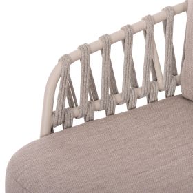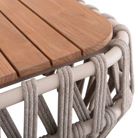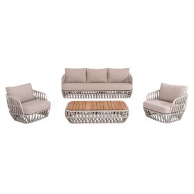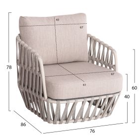 Σας παρουσιάζουμε το εντυπωσιακό σετ εξωτερικού χώρου 4τμχ SABO σε ΚΡΕΜ χρώμα, με τραπεζάκι, 2 πολυθρόνες και 1 τριθέσιο καναπέ. Ένα σετ που ξεχωρίζει με την πρώτη ματιά. Ο σκελετός σε όλο το σετ είναι από αλουμίνιο επενδυμένο με ΜΠΕΖ P.E. σχοινί. Το όμορφο τραπέζι έχει επιφάνεια από ποιοτικό ξύλο teak. Το design τους είναι πανέμορφο στην όψη ενώ η στιβαρότητά τους είναι κάτι παραπάνω από εμφανής. Τα μαξιλάρια σε όλο το σετ είναι επενδυμένα με ποιοτικό ύφασμα OLEFIN σε ΜΠΕΖ χρώμα και διαθέτουν γέμισμα με μέτριας σκληρότητας αφρώδη υλικά για την μεγαλύτερη δυνατή άνεση. Τι άλλο να ζητήσει κανείς για να αναβαθμίσει τον εξωτερικό χώρο του;