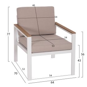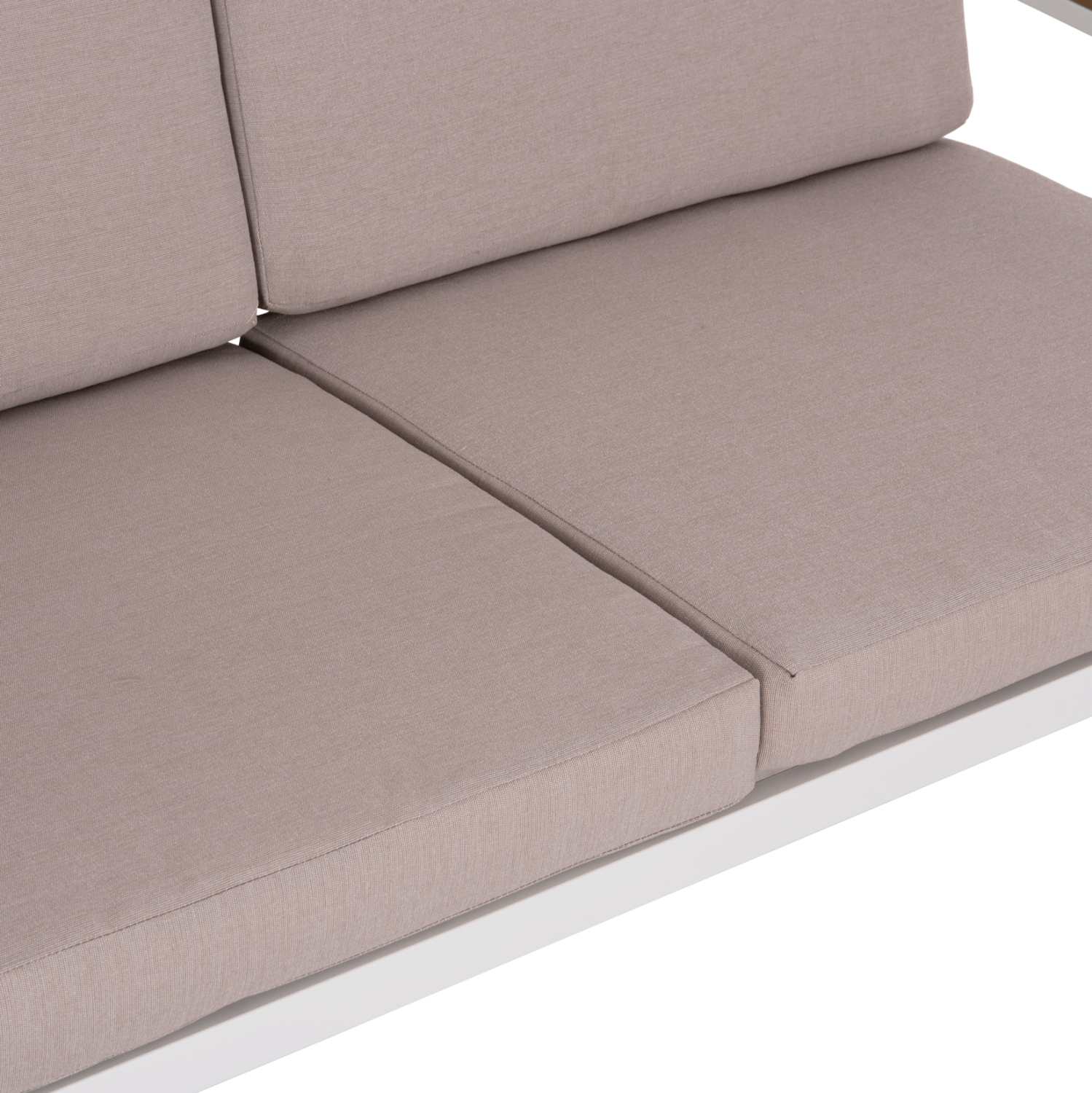 Το σετ σαλόνι εξωτερικού χώρου SAFIΝ αποτελείται από έναν 2-θέσιο καναπέ, 2 αναπαυτικές πολυθρόνες, και ένα ορθογώνιο τραπεζάκι. Ο συνδυασμός του σκελετού αλουμινίου σε ΛΕΥΚΟ χρώμα με τα μαξιλάρια πλάτης και καθίσματος με OLEFIN ύφασμα σε ΜΠΕΖ χρώμα σε όλο το σετ είναι μοναδικός, και μπορεί να αλλάξει άμεσα την εικόνα οποιουδήποτε εξωτερικού χώρου. Το τραπεζάκι πέρα από τον σκελετό αλουμινίου, διαθέτει επιφάνεια από πλάκες polywood που ταιριάζουν απόλυτα με το υπόλοιπο σετ και είναι φυσικά ένα υλικό κατάλληλο για χρήση σε εξωτερικούς χώρους.