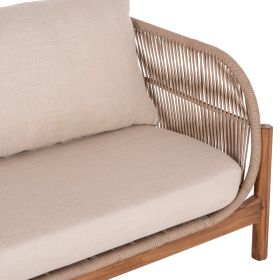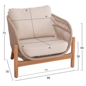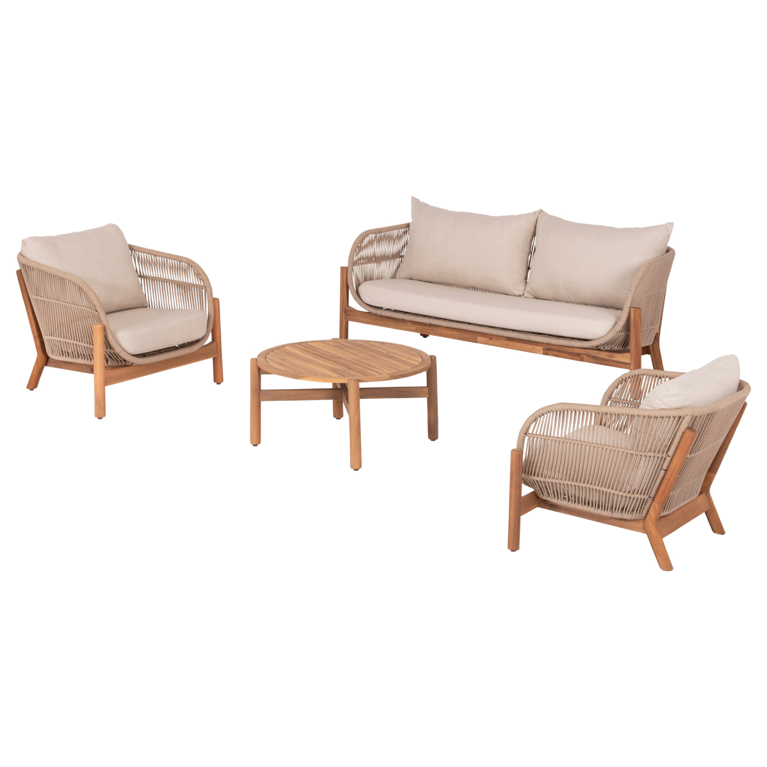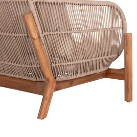 Σας παρουσιάζουμε το νέο σετ σαλονιού εξωτερικού χώρου SANJI που αποτελείται από στρογγυλό τραπεζάκι, 2 πολυθρόνες και 1 διθέσιο καναπέ. Τα πόδια σε όλο το σετ είναι από ποιοτικό ξύλο ακακίας σε ΦΥΣΙΚΟ χρώμα, όπως και ολόκληρο το τραπεζάκι. Ο σκελετός των καθισμάτων τόσο στις πολυθρόνες όσο και στον καναπέ είναι από αλουμίνιο επενδυμένος με σχοινί σε ανοιχτό ΜΠΕΖ χρώμα! Τα μαξιλάρια σε όλο το σετ είναι επενδυμένα με πολυεστερικό ύφασμα σε ΜΠΕΖ χρώμα και διαθέτουν γέμισμα με μέτριας σκληρότητας αφρώδη υλικά για την μεγαλύτερη δυνατή άνεση, αλλά και φερμουάρ. Τι άλλο να ζητήσει κανείς για να αναβαθμίσει τον εξωτερικό χώρο του;