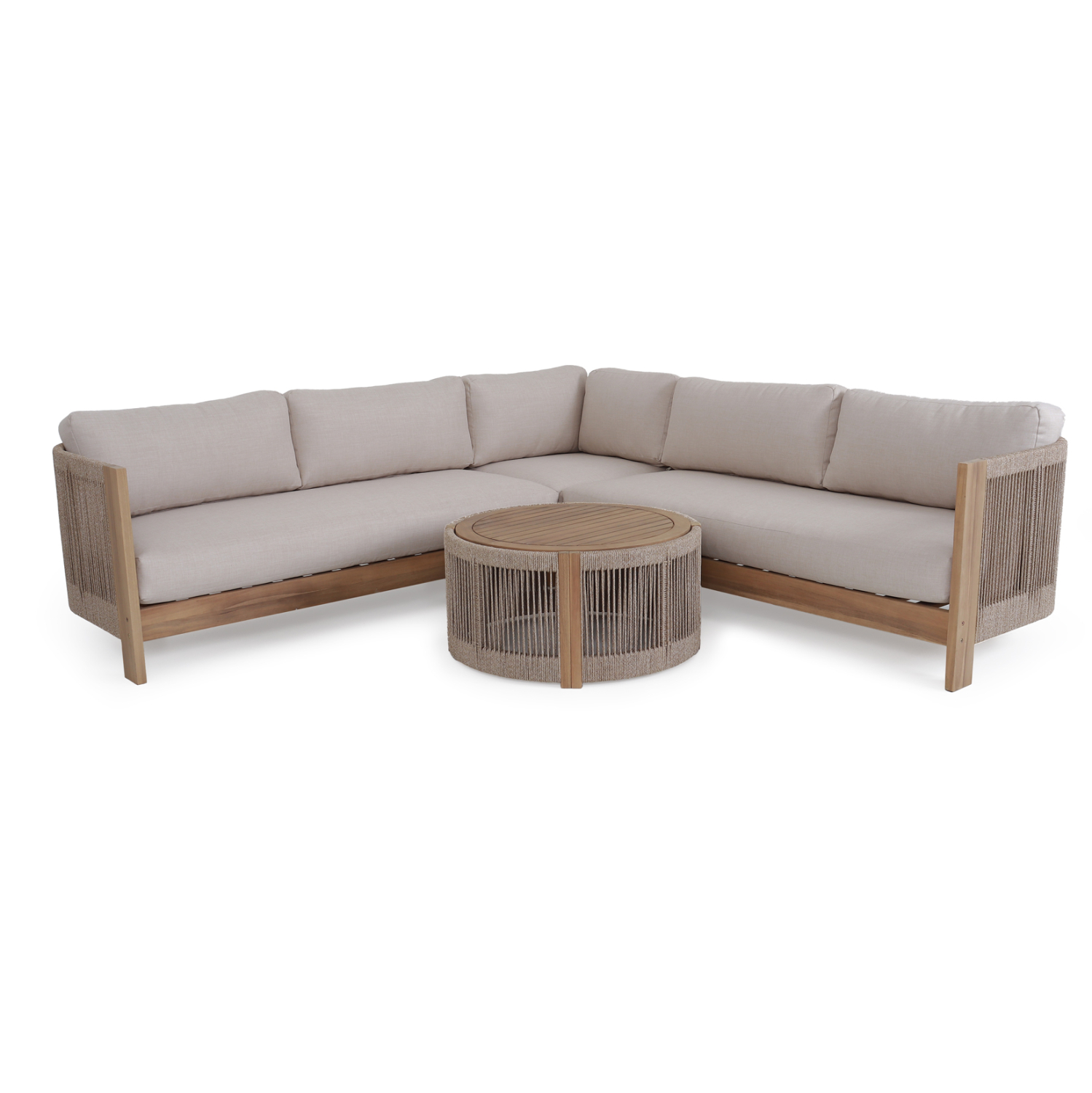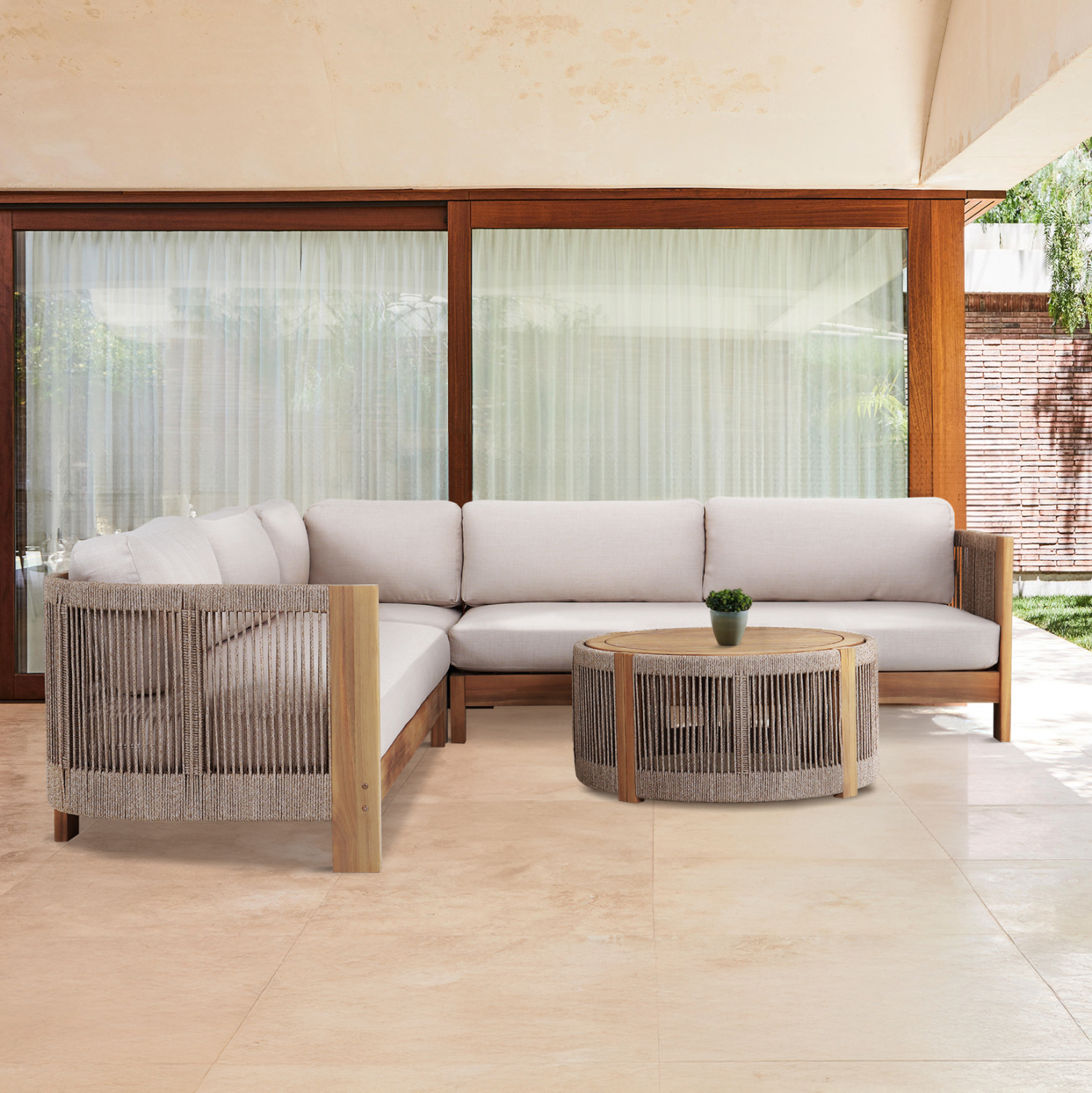 Το σετ γωνιακού καναπέ εξωτερικού χώρου ODYSSEY είναι η επιτομή της πολυτέλειας συνδυασμένης με απαράμιλλη ποιότητα. Αποτελείται από δύο 2-θέσιους καναπέδες, μία γωνία για να δέσει το σύνολο, και ένα στρογγυλό τραπεζάκι. Ο σκελετός είναι από ξύλο ακακίας σε ΦΥΣΙΚΟ χρώμα με μαξιλάρια σε ΜΠΕΖ χρώμα, ενώ η επένδυση με σχοινί στους καναπέδες και στο τραπεζάκι δίνει μια ακόμα πιο «ζεστή» εικόνα στο σύνολο. Η αισθητική και τα γήινα χρώματα κάθε σπιθαμής αυτού του σετ, θα ταιριάξουν σε κάθε χώρο.