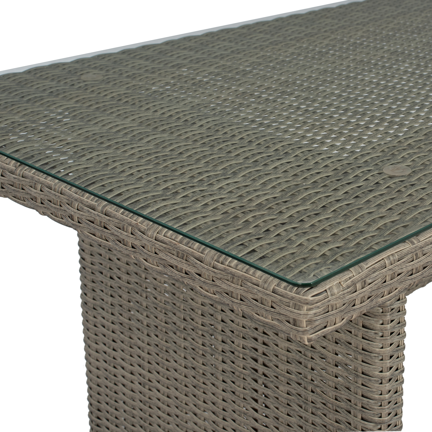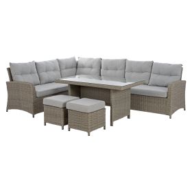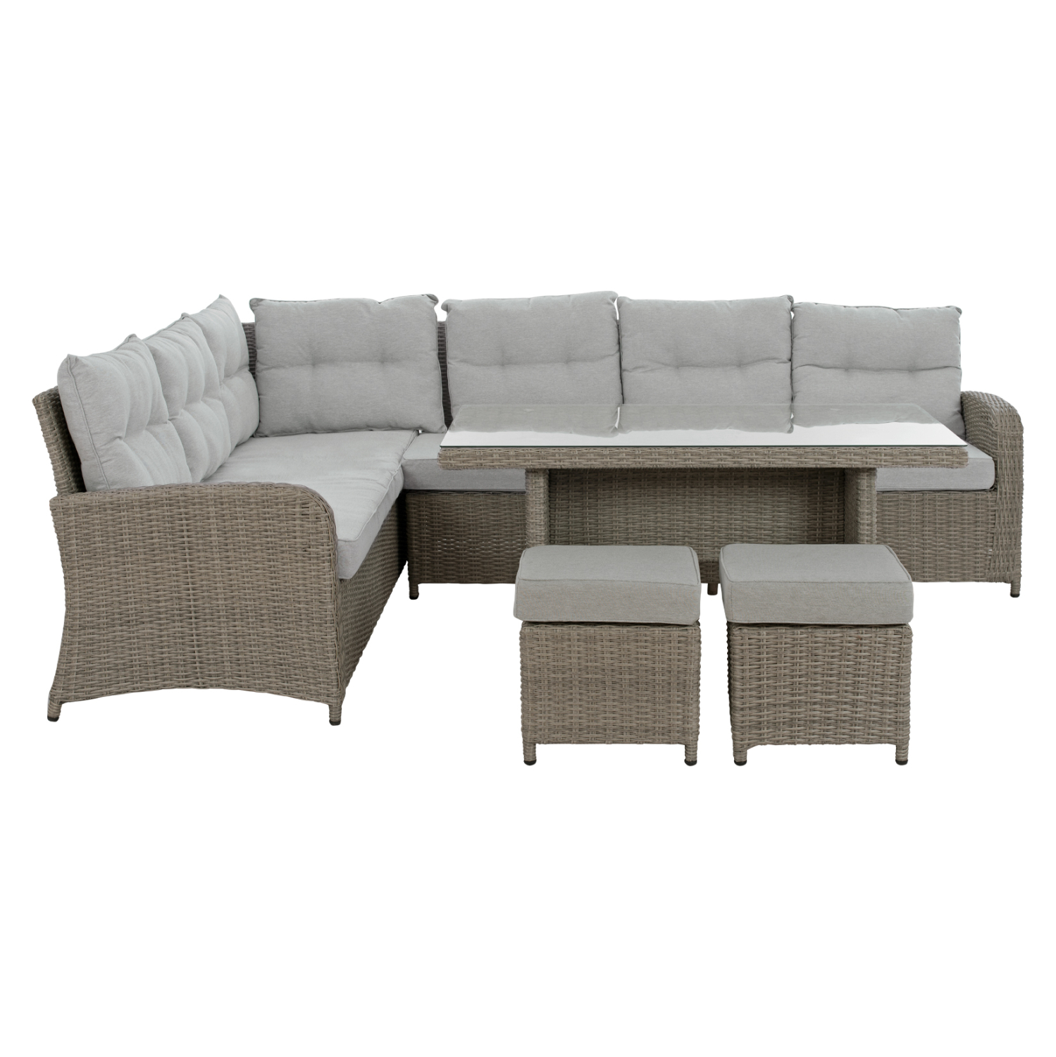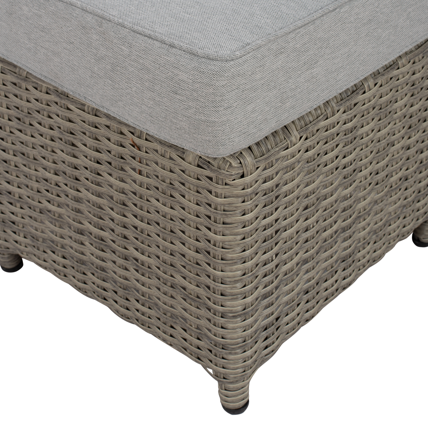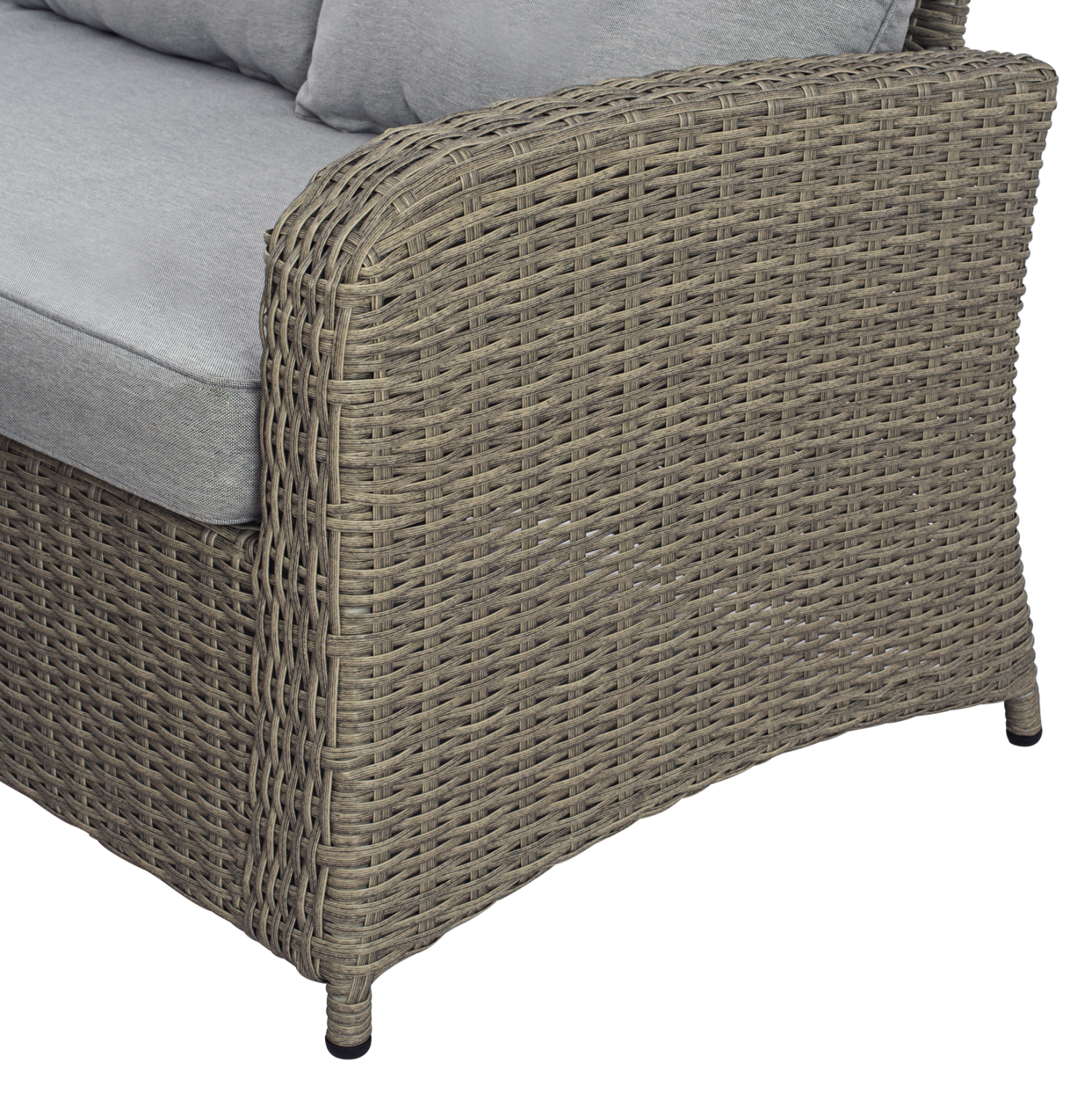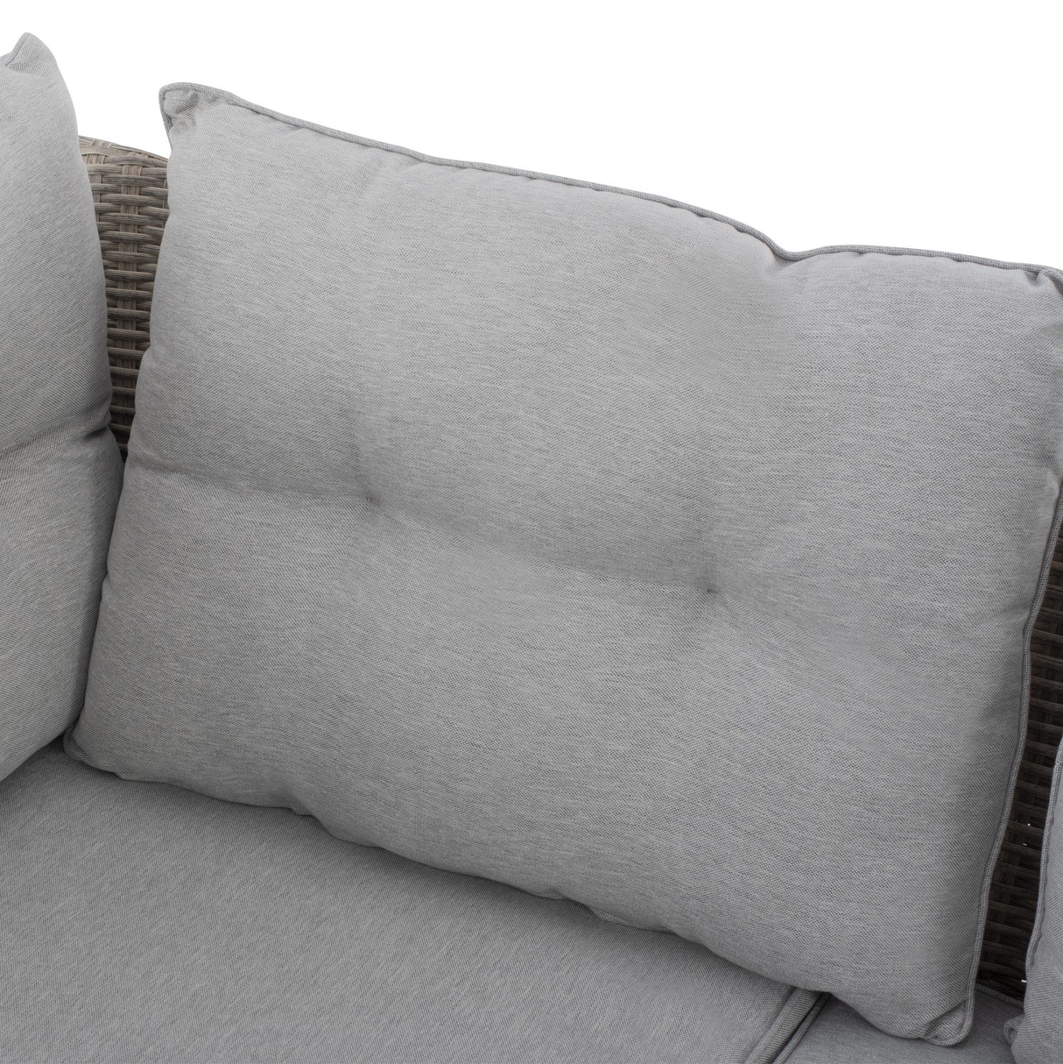 Σετ σαλόνι εξωτερικού χώρου από σκελετό αλουμινίου με επένδυση Wicker σε γκρι απόχρωση και μαξιλάρια σε ανοιχτό γκρι χρώμα.