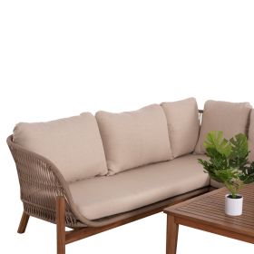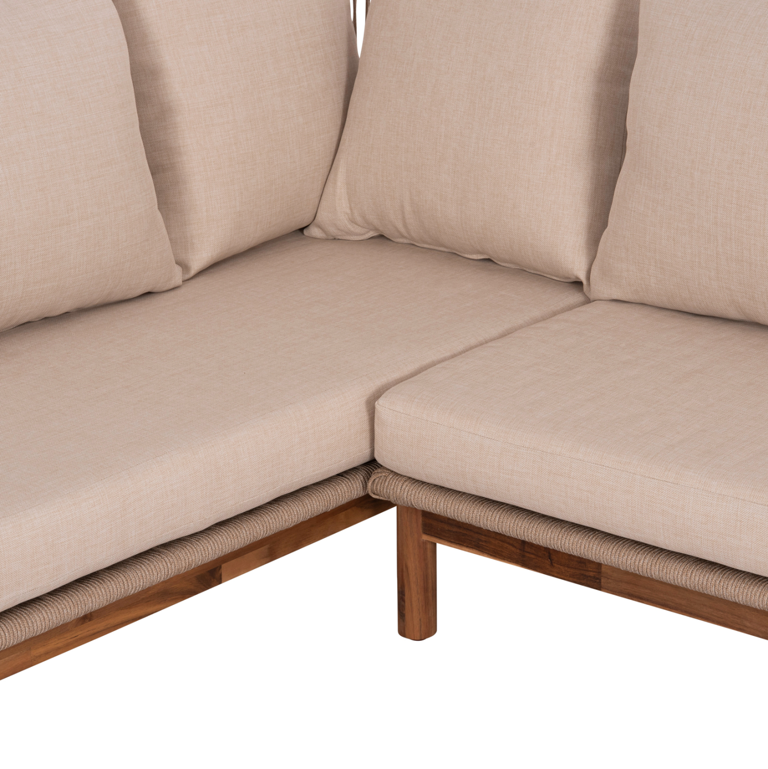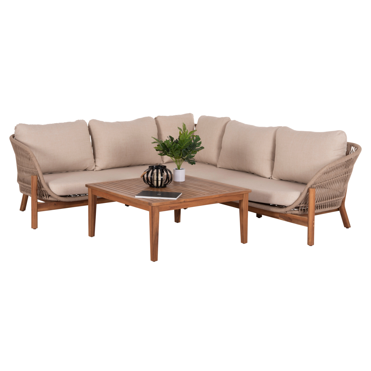 Σας παρουσιάζουμε το νέο σετ σαλονιού εξωτερικού χώρου SANJI σε διαμόρφωση γωνίας που αποτελείται από ένα τετράγωνο τραπεζάκι και 2 καναπέδες σε γωνία. Τα πόδια σε όλο το σετ είναι από ποιοτικό ξύλο ακακίας σε ΦΥΣΙΚΟ χρώμα, όπως και ολόκληρο το τραπεζάκι. Ο σκελετός των καθισμάτων είναι από αλουμίνιο επενδυμένος με σχοινί σε ανοιχτό ΜΠΕΖ χρώμα! Τα μαξιλάρια είναι επενδυμένα με πολυεστερικό ύφασμα σε ΜΠΕΖ χρώμα και διαθέτουν γέμισμα με μέτριας σκληρότητας αφρώδη υλικά για την μεγαλύτερη δυνατή άνεση, αλλά και φερμουάρ. Τι άλλο να ζητήσει κανείς για να αναβαθμίσει τον εξωτερικό χώρο του;