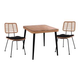Ένα τραπέζι κατασκευασμένο από μεταλλικό σκελετό σε μαύρη απόχρωση και επιφάνεια επενδυμένη με πλεκτό wicker σε μπεζ απόχρωση.