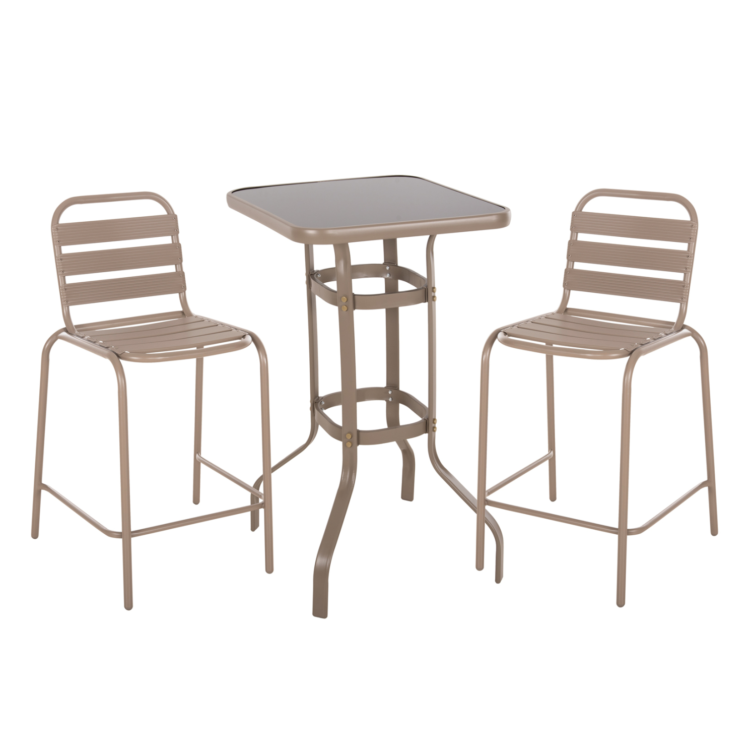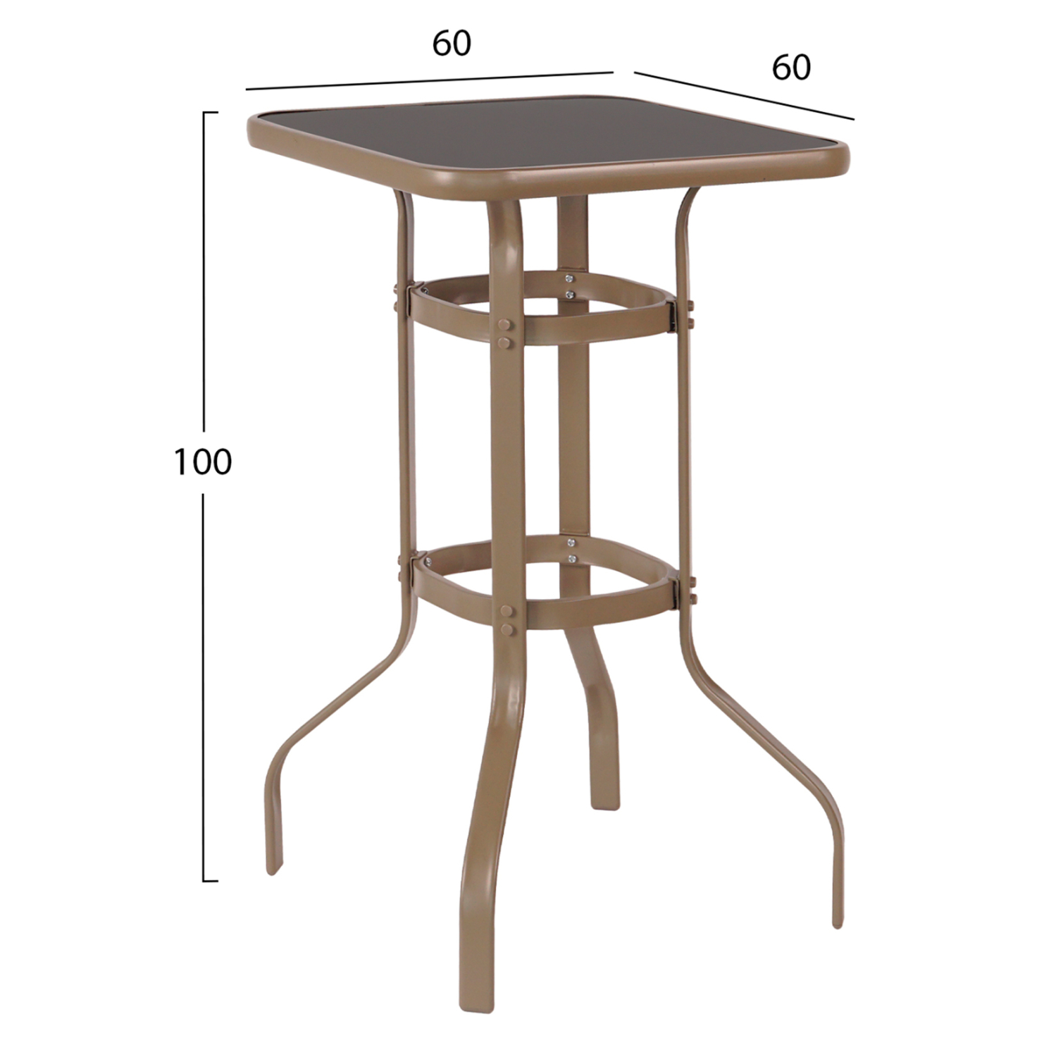 Σετ εξωτερικού χώρου που αποτελείται από 2 σκαμπό μπαρ μεσαίου ύψους και 1 τραπεζάκι μπαρ, όλα σε ΣΑΜΠΑΝΙ χρώμα. Τα σκαμπό διαθέτουν πλάτη και κάθισμα από «φέτες» αλουμινίου, ενώ ο σκελετός τόσο στα σκαμπό όσο και στο τραπέζι είναι μεταλλικός. Το γυαλί στο τραπέζι είναι ασφαλείας.