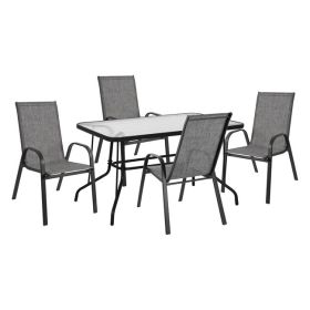 Ένα τραπέζι μεταλλικό εξωτερικού χώρου σε χρώμα γκρι, με ενσωματωμένο γυαλί ασφαλείας (tempered).